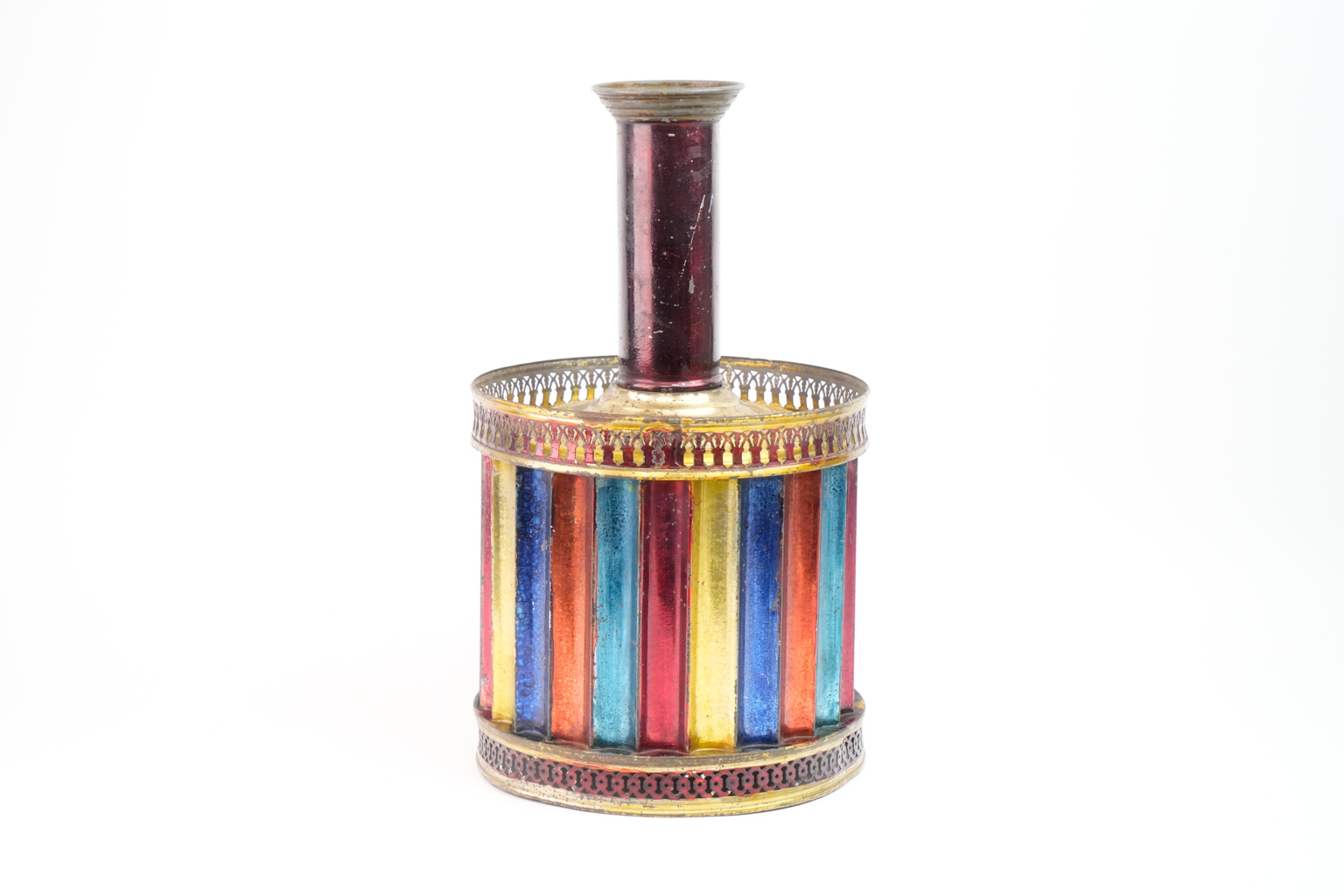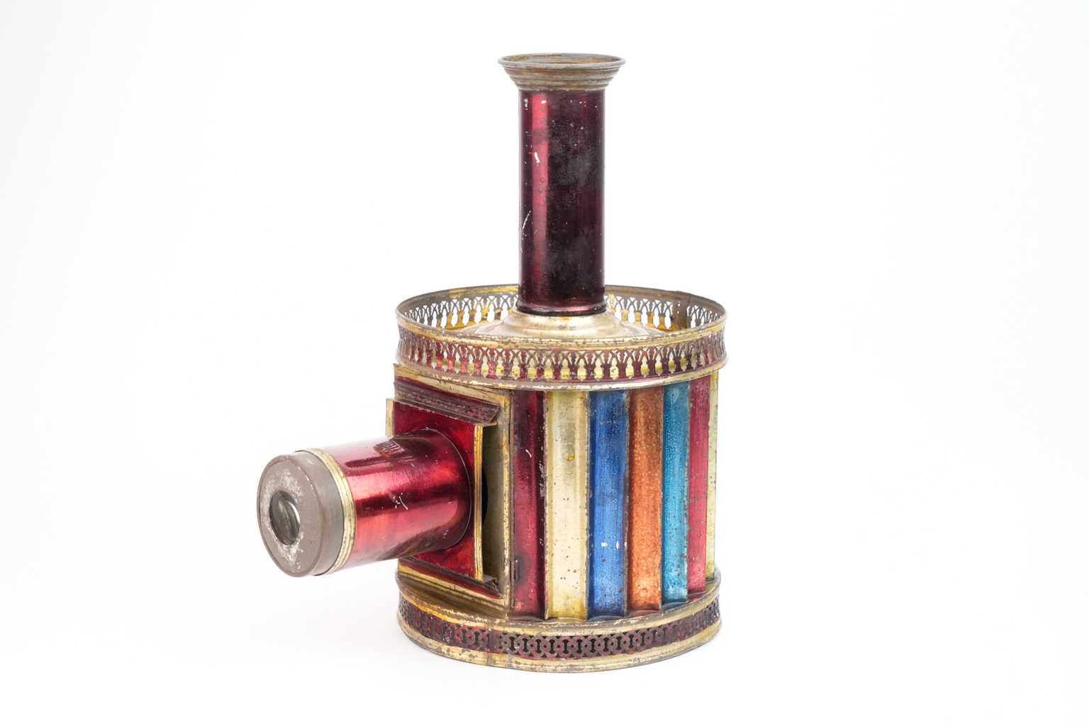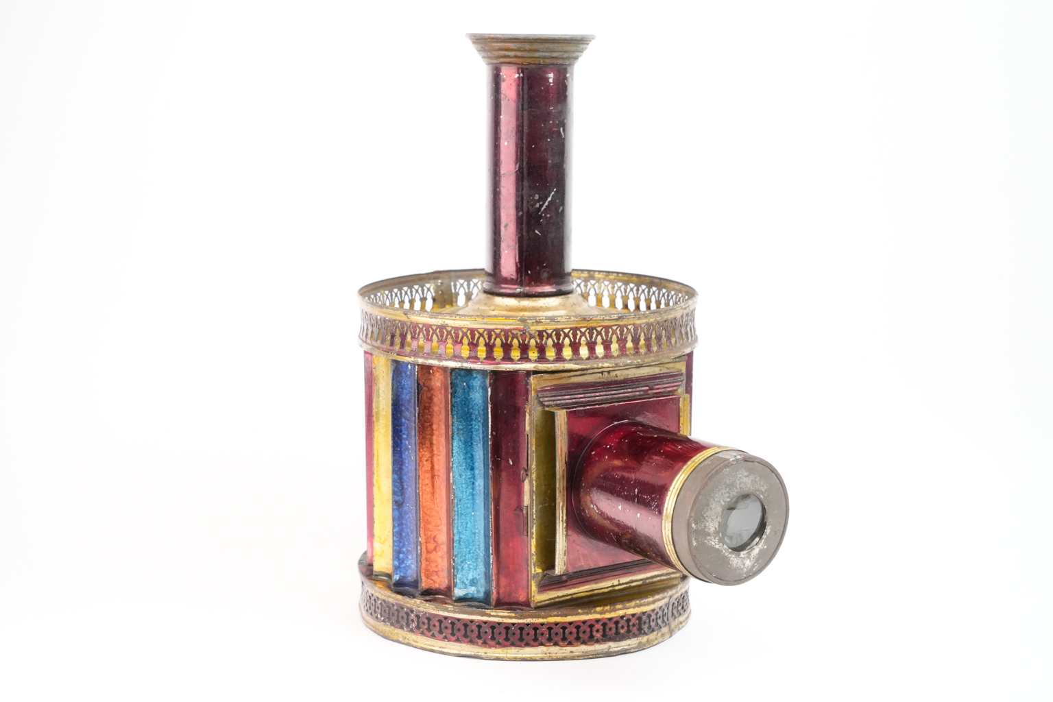 Lanterne magique Lampascope polychrome Aubert, corps cylindrique rainuré peint au vernis à l’alcool. Galeries ajourées supérieure et inférieure. Porte avant contenant le tube optique coulissant à capuchon. Hauteur 30cm. Vers 1880.