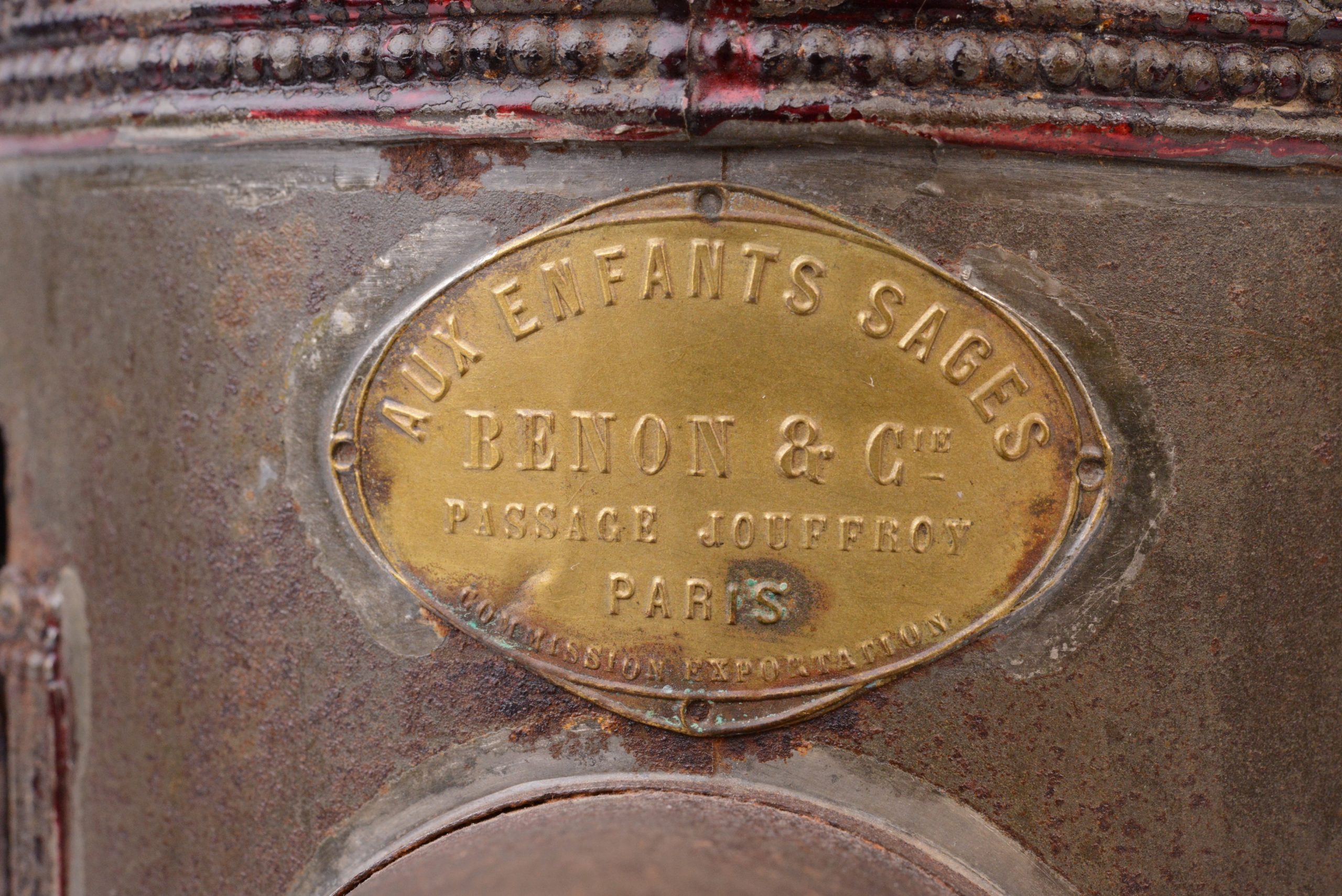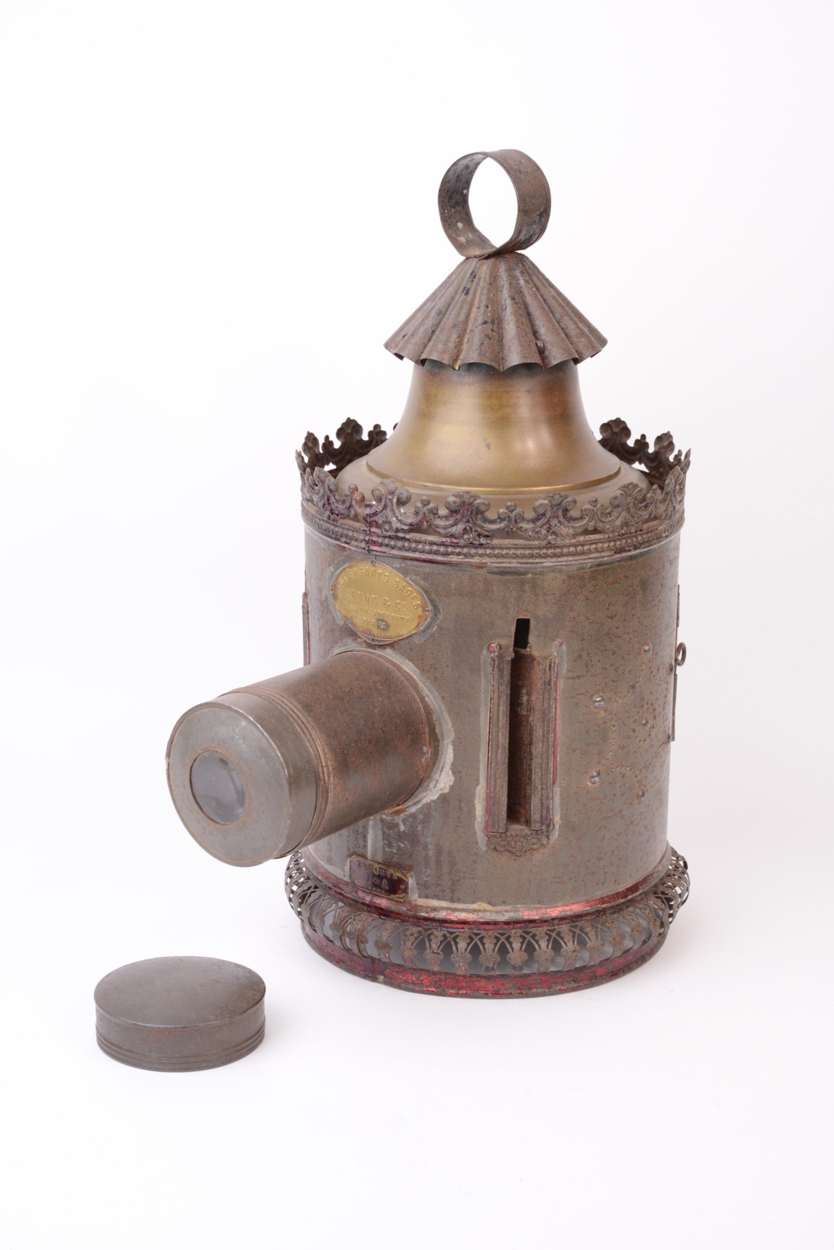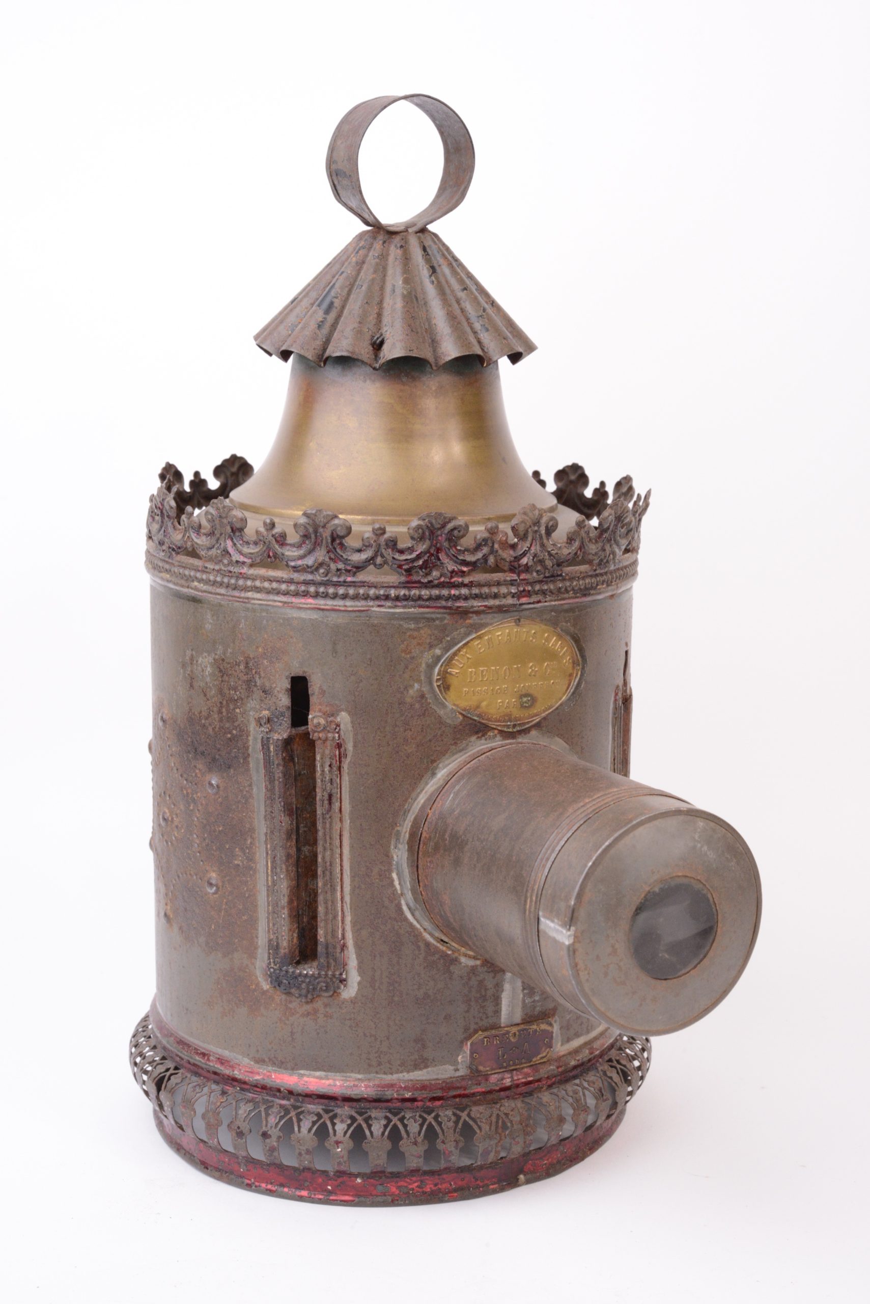 Rare lanterne magique Louis Aubert  à passage de plaques dans le corps. Vers 1850. Le corps est en fer blanc étamé décoré au motif étoilé. Lampe à huile d’origine. Plaque portant l’inscription « Breveté L. A  S.G.D.G. ». et plaque du revendeur : «  Aux enfants sages - Benon & Cie - Passage Jouffroy Paris - Commission Exportation ». Lanterne très peu courante.