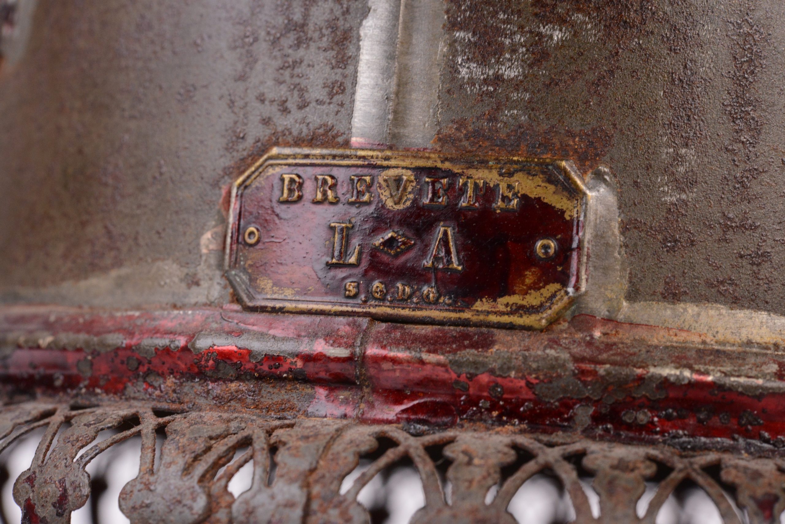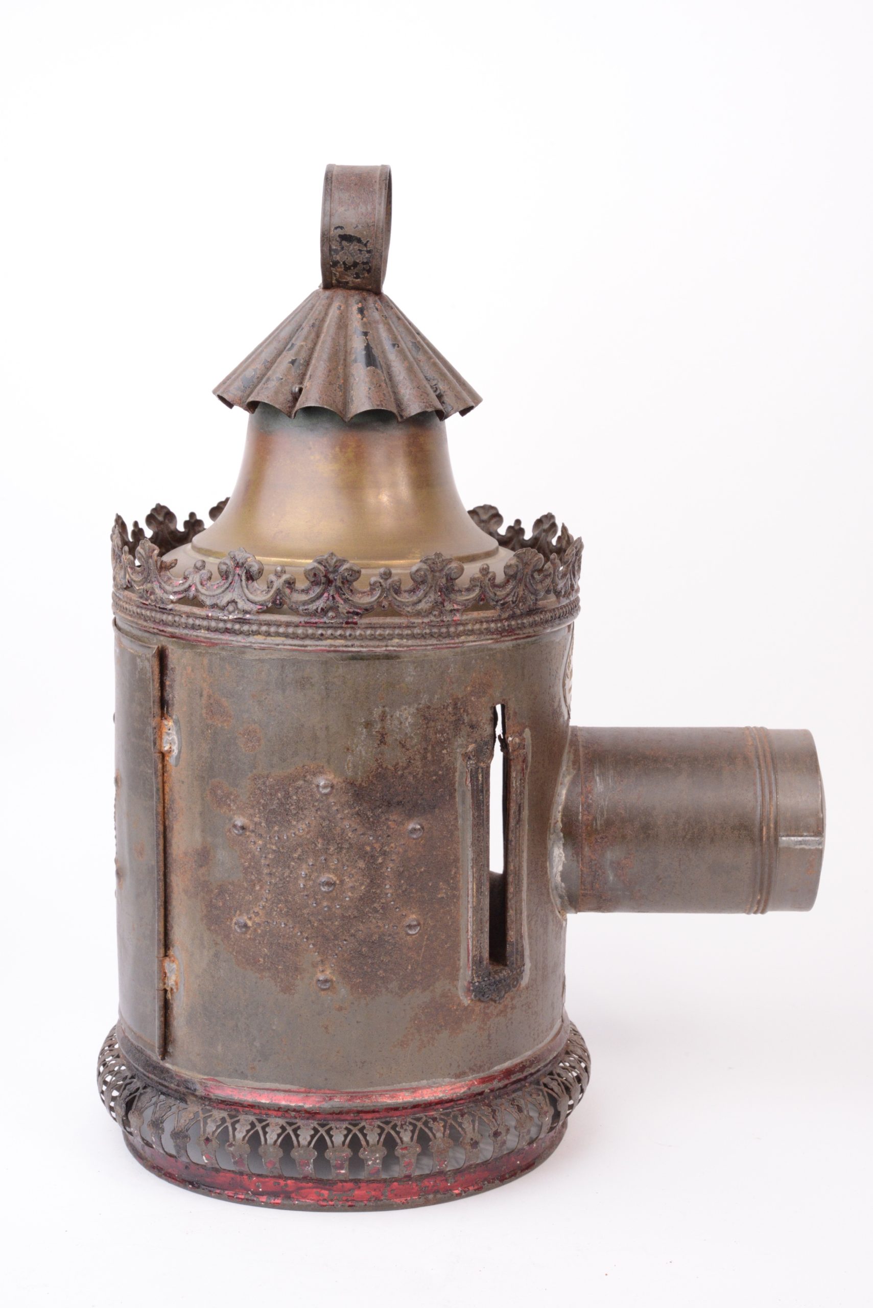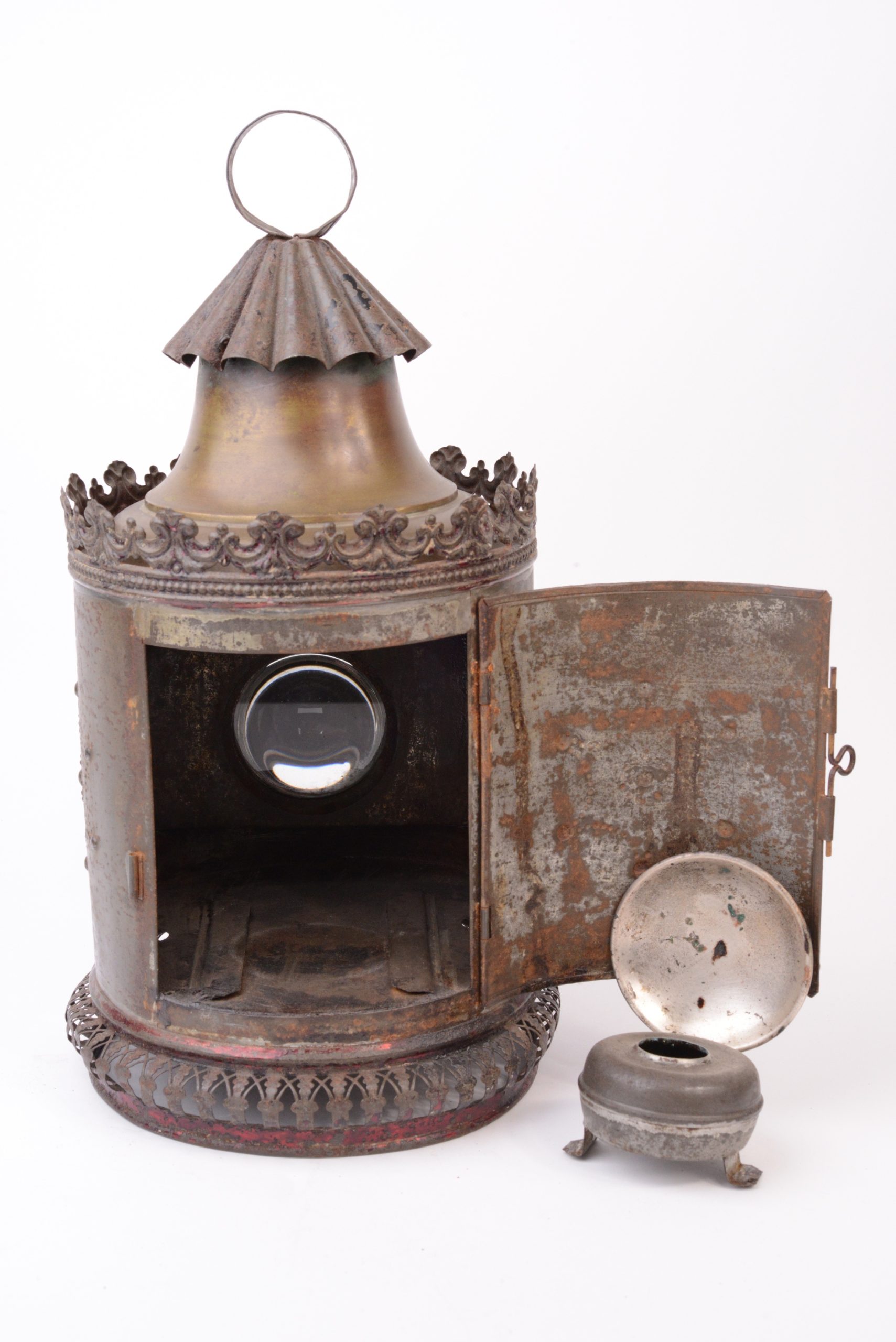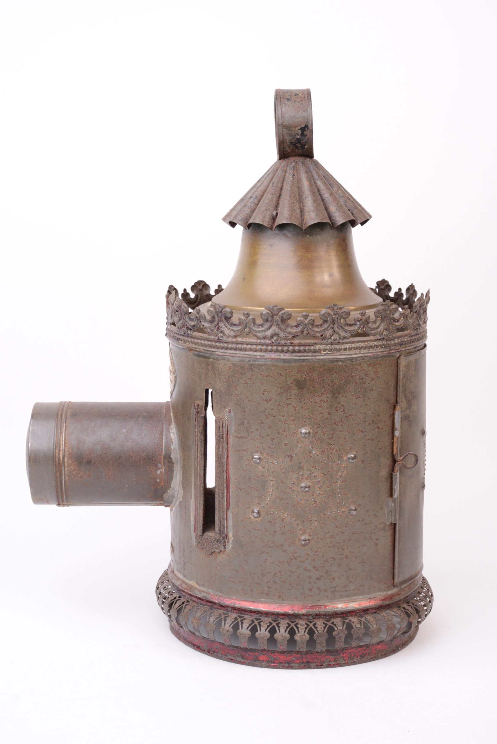 Rare lanterne magique Louis Aubert  à passage de plaques dans le corps. Vers 1850. Le corps est en fer blanc étamé décoré au motif étoilé. Lampe à huile d’origine. Plaque portant l’inscription « Breveté L. A  S.G.D.G. ». et plaque du revendeur : «  Aux enfants sages - Benon & Cie - Passage Jouffroy Paris - Commission Exportation ». Lanterne très peu courante.