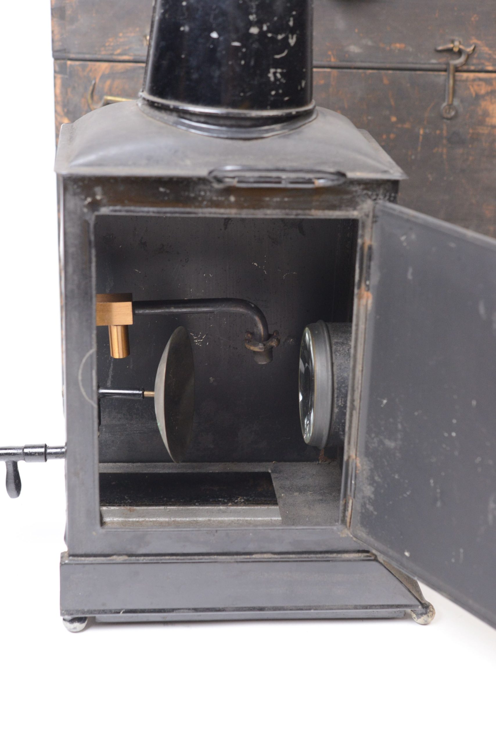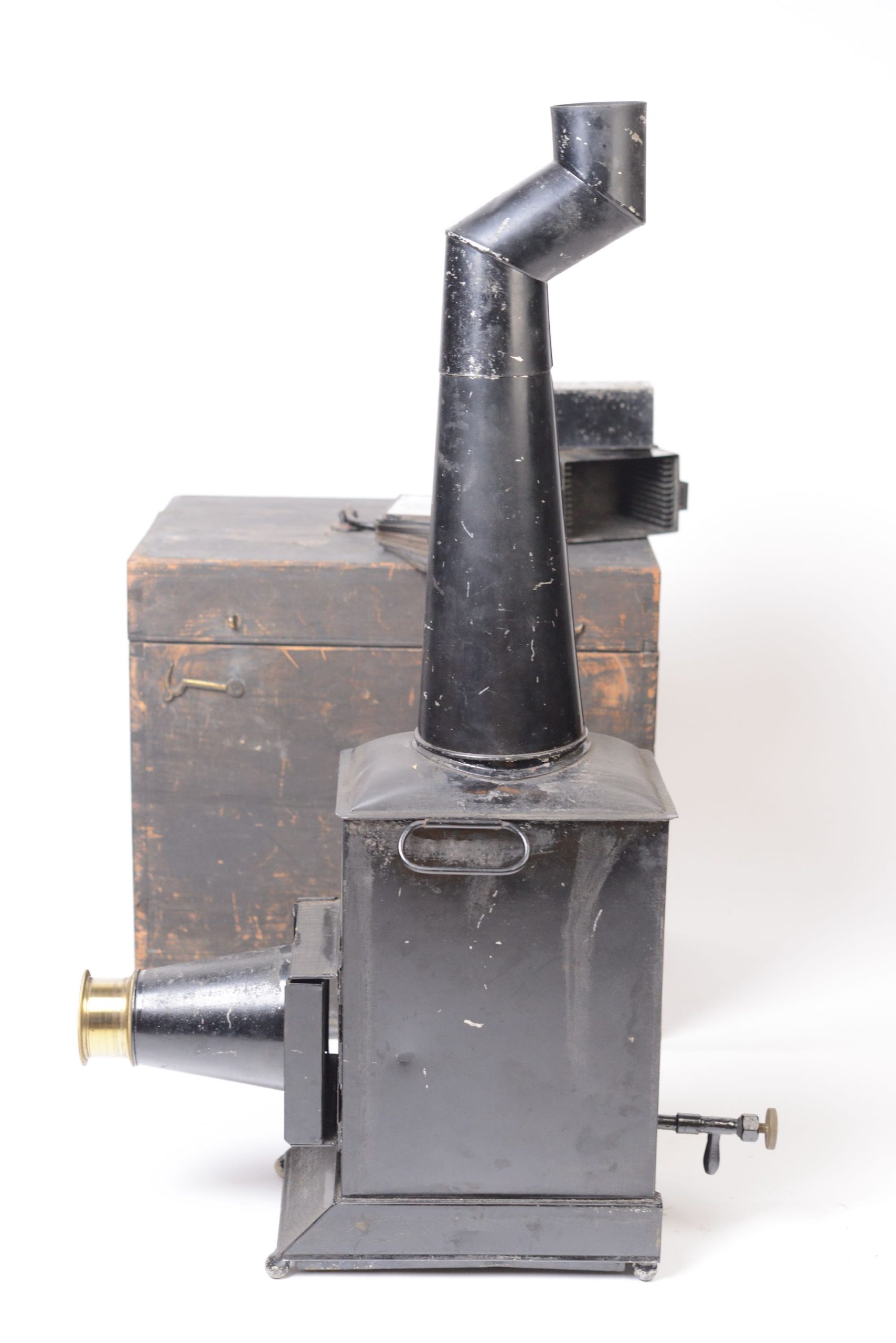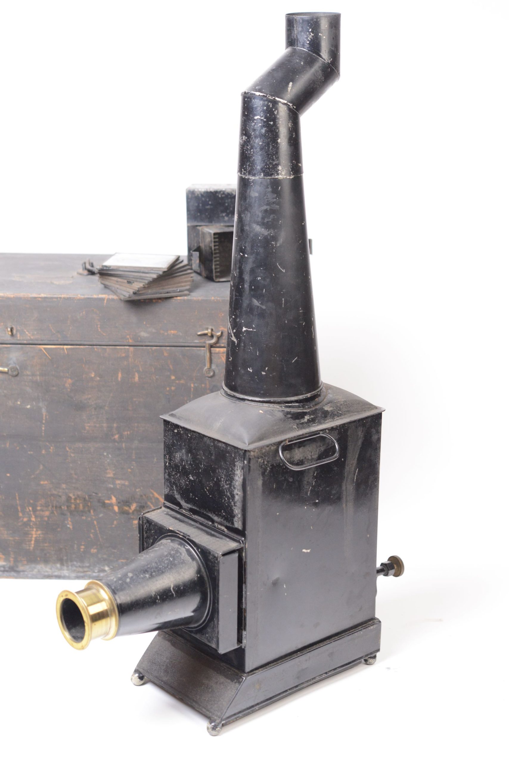 Lanterne Magique Newton construite en fer-blanc verni noir. Elle apparait en Angleterre à partir de 1860 environ. Elle est en particulier caractérisée par sa longue cheminée biscornue et son utilisation pour les séances de fantasmagorie. Présence d'un dispositif d'éclairage. Elle possède sa valise de transport en bois noirci, munie d’une poignée. Belle taille.