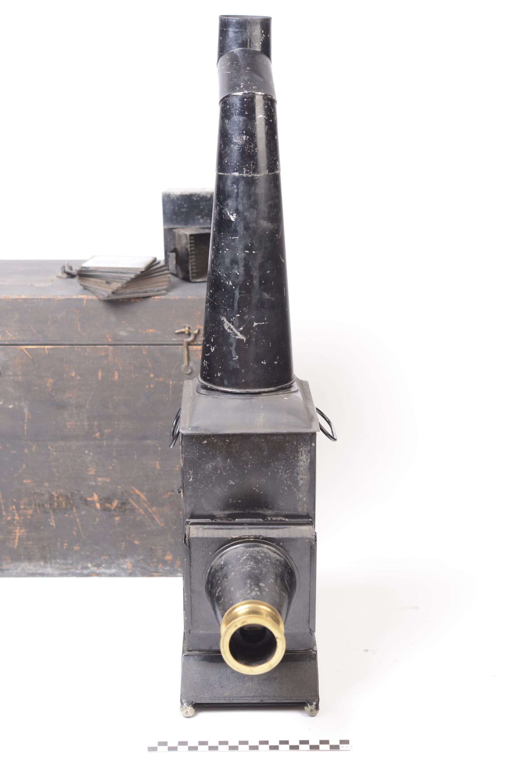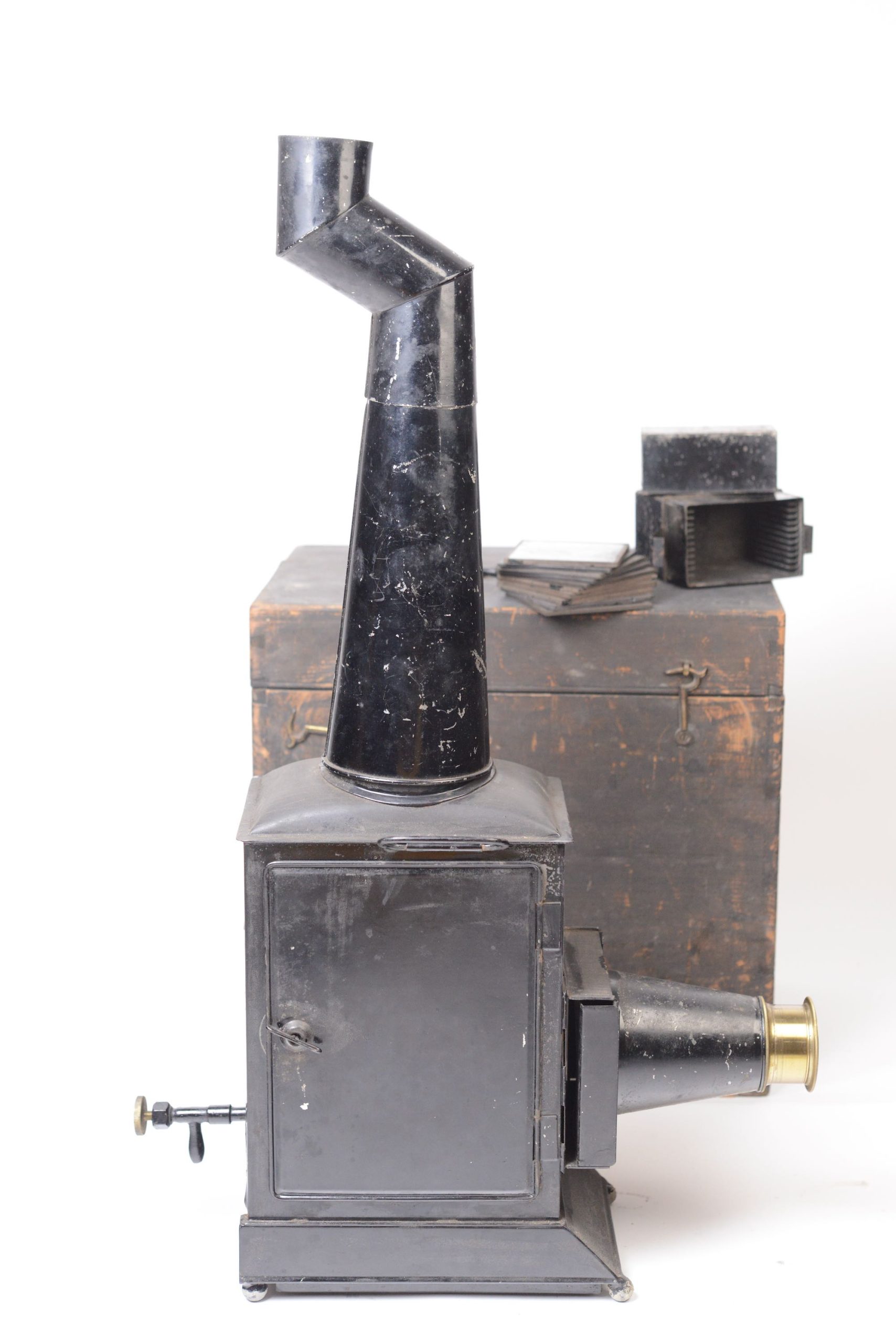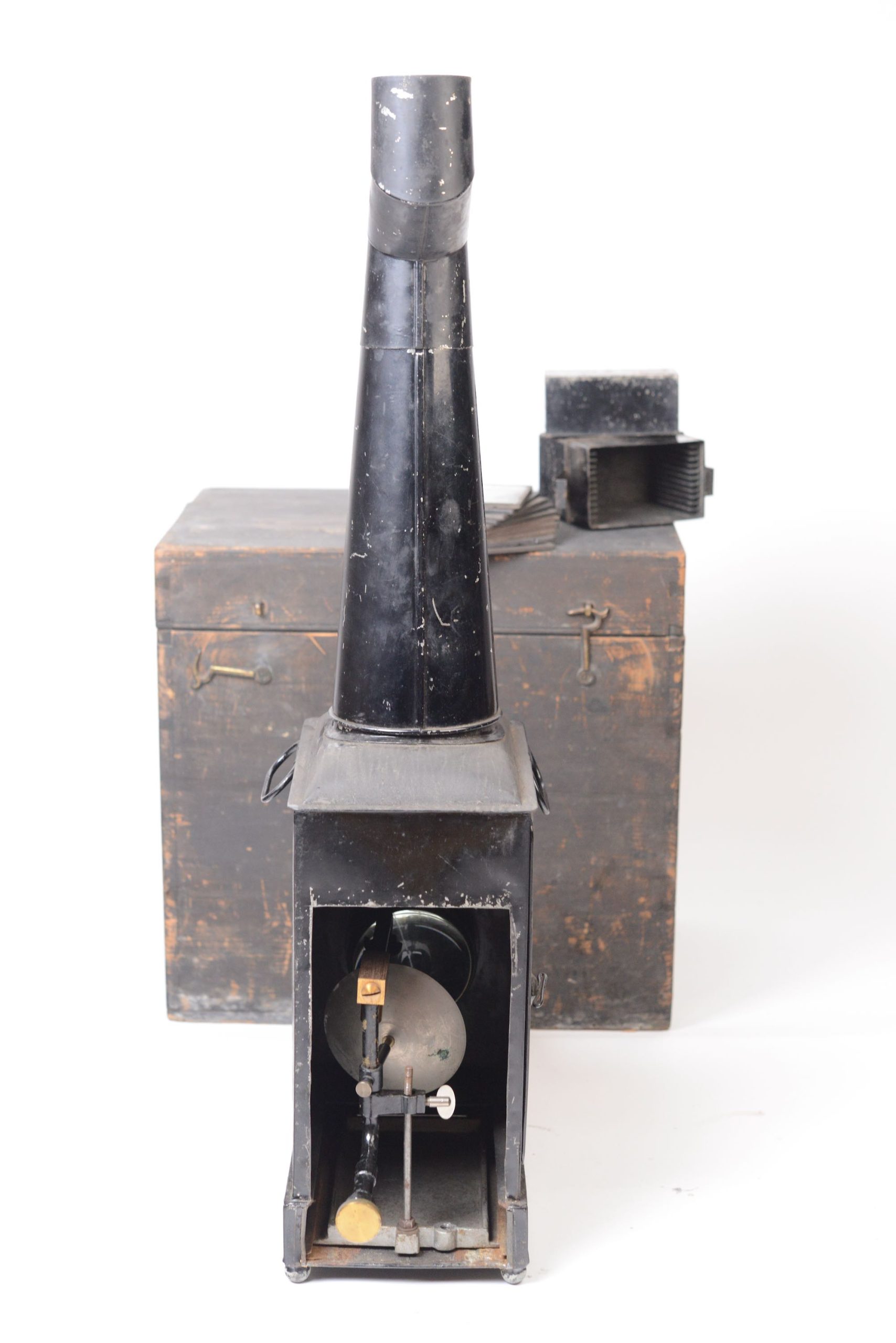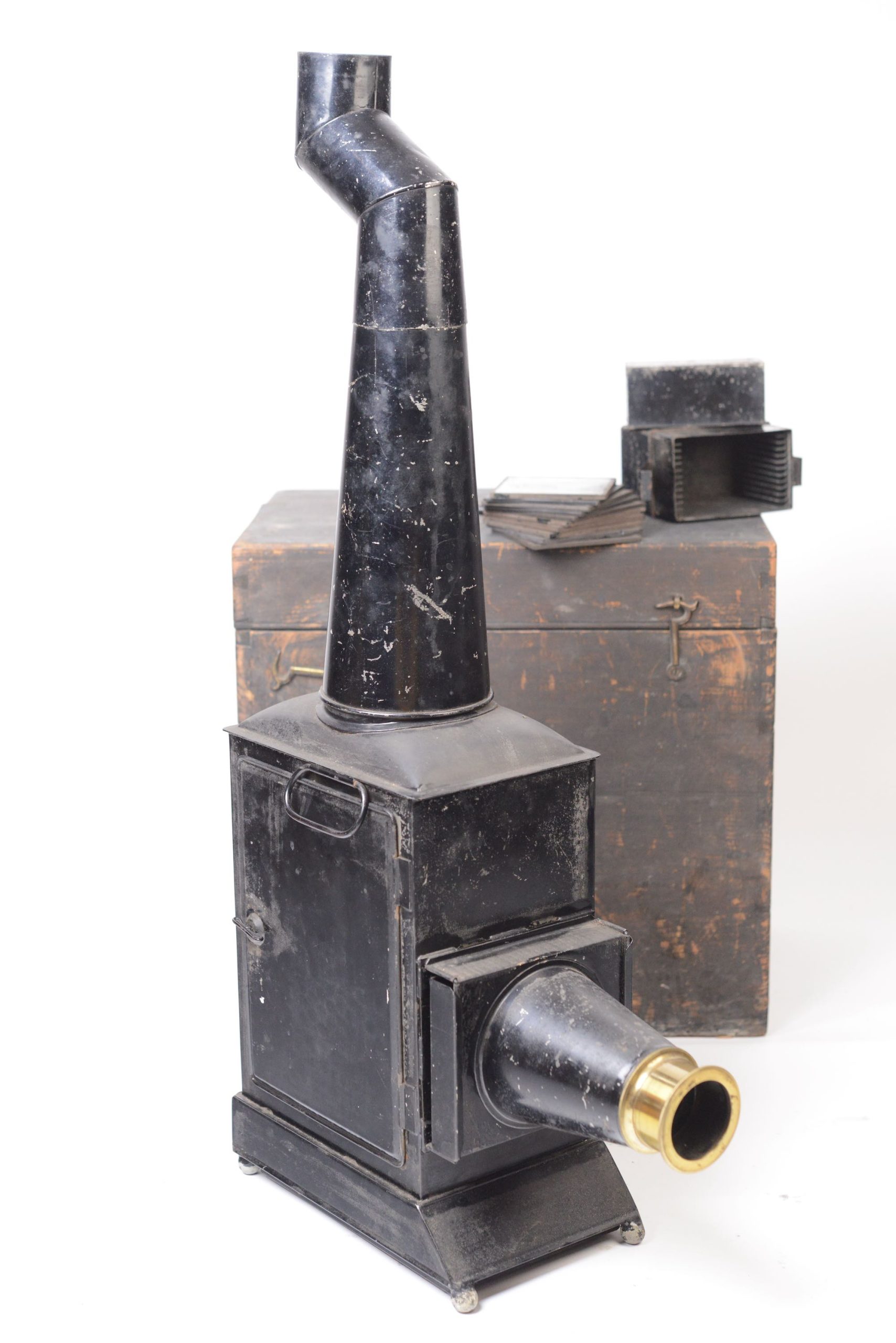 Lanterne Magique Newton construite en fer-blanc verni noir. Elle apparait en Angleterre à partir de 1860 environ. Elle est en particulier caractérisée par sa longue cheminée biscornue et son utilisation pour les séances de fantasmagorie. Présence d'un dispositif d'éclairage. Elle possède sa valise de transport en bois noirci, munie d’une poignée. Belle taille.