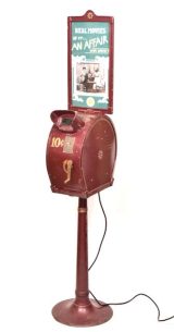 Mutoscope surmonté d'un panneau présentoir portant l’indication « Real movies, Is it an affair or (...)Ce produit m'intéresse -