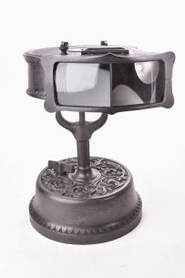 Lanterne magique Max Dannhorn. Corps entièrement en laiton nickelé. Socle en bois verni. Porte-objectif sous (...)Ce produit m'intéresse -