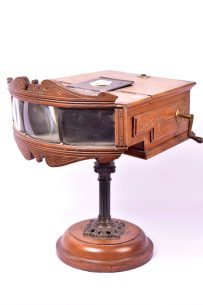 Rare Kinora double. Le socle et le corps de l’appareil sont en acajou incrusté de (...)Ce produit m'intéresse -