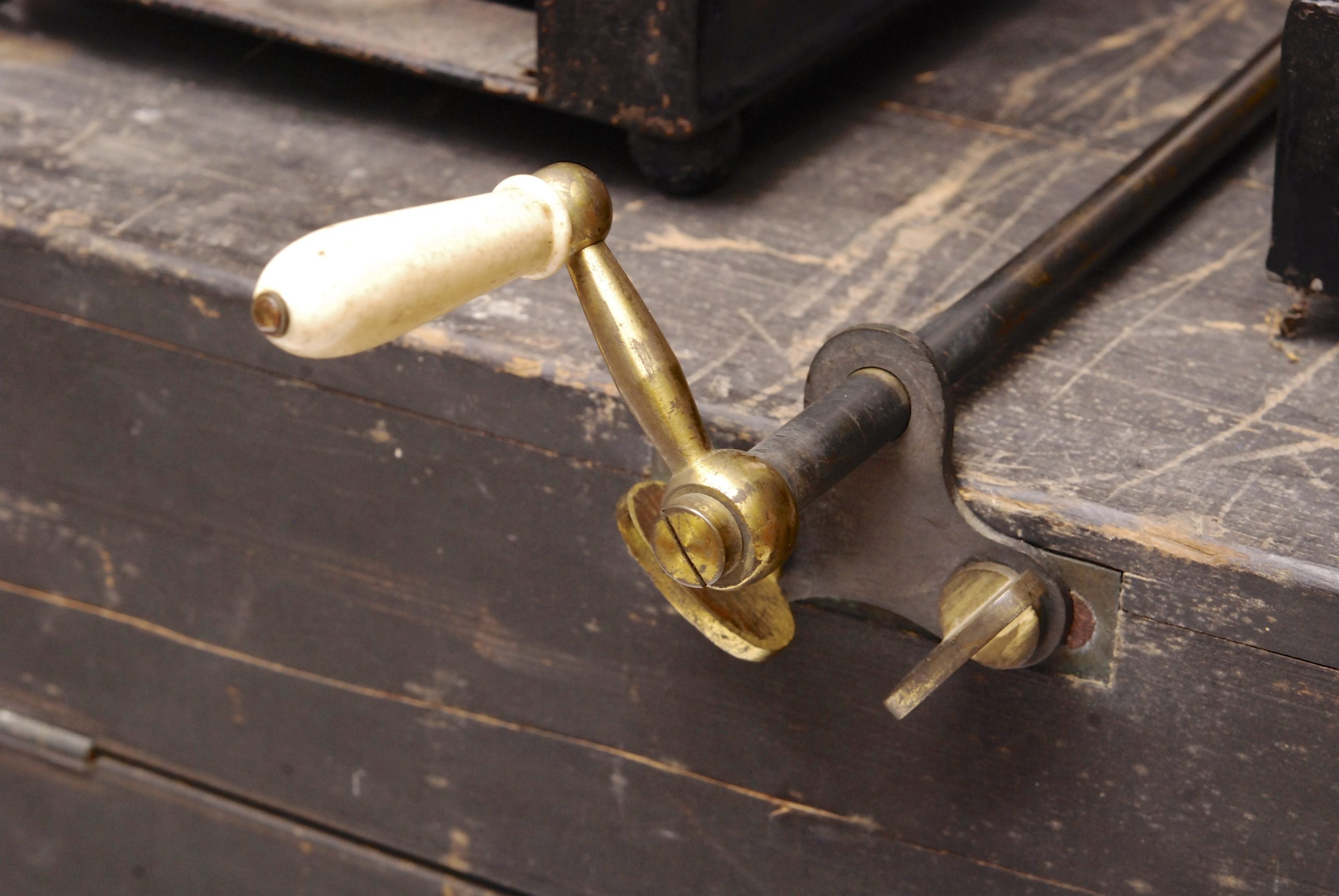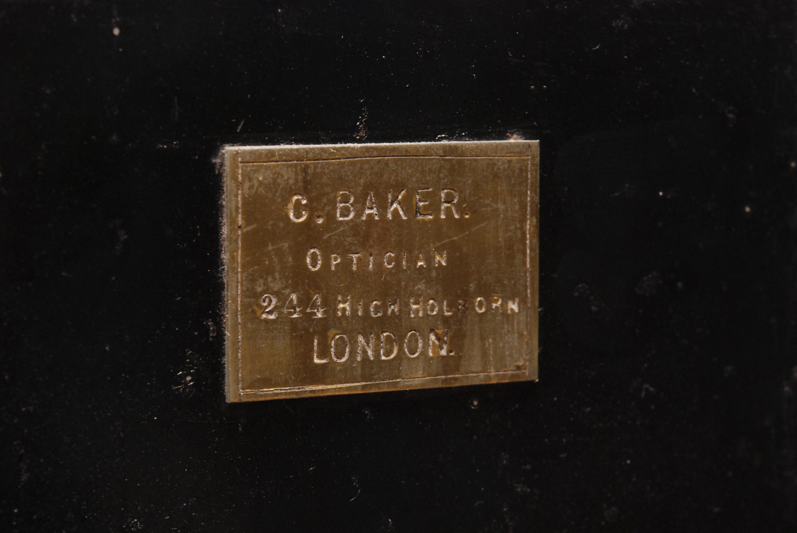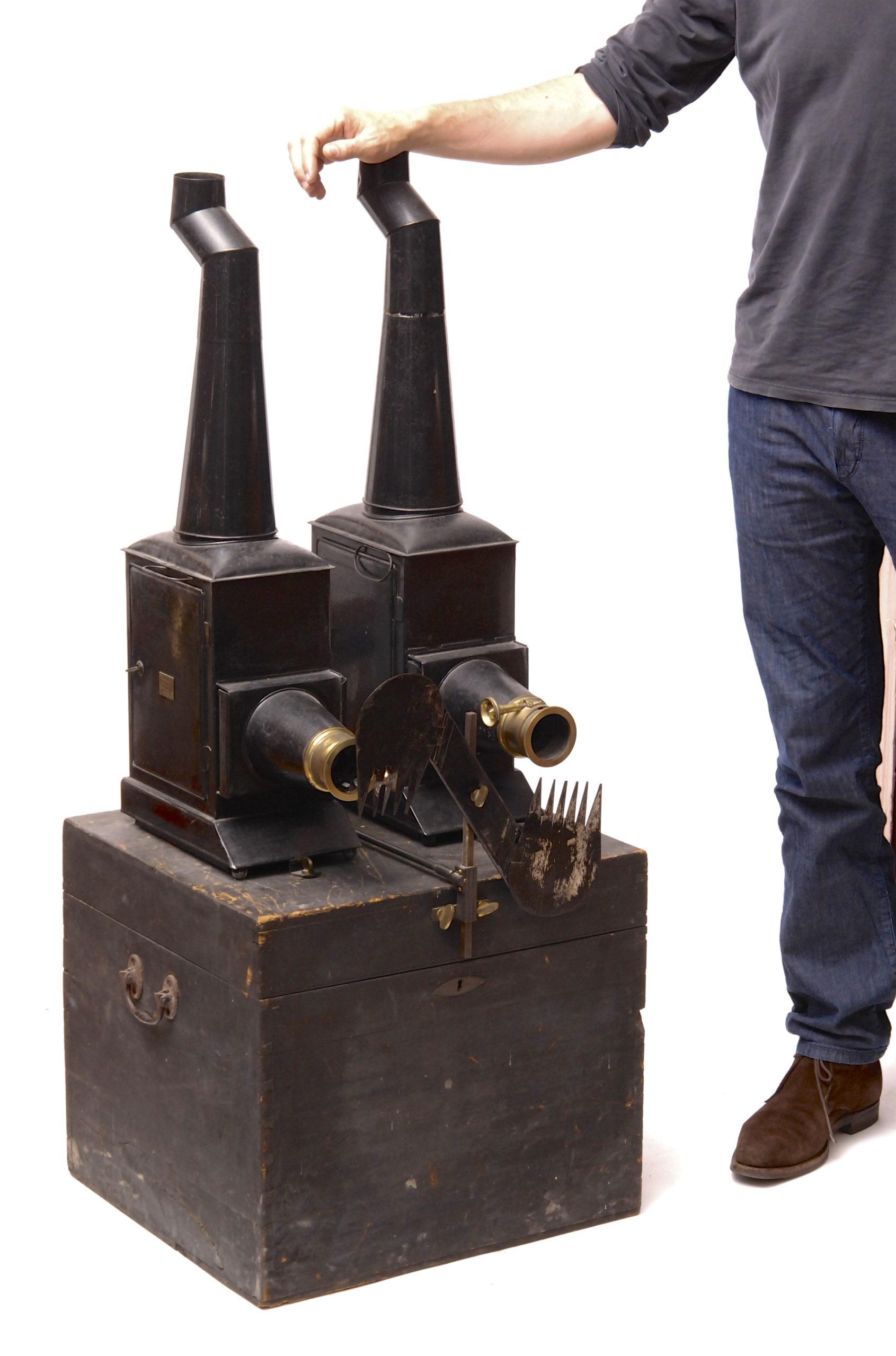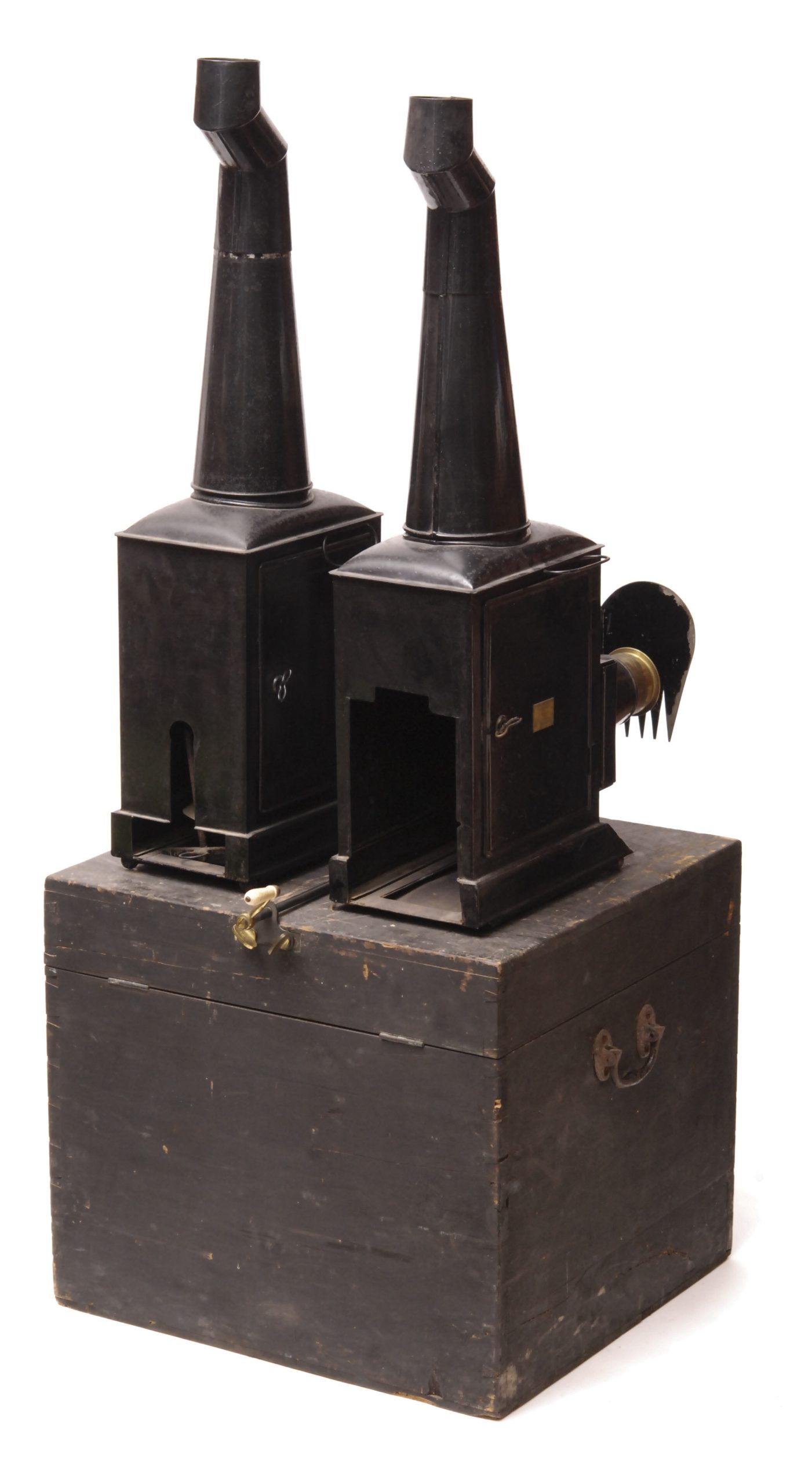 Paire de lanternes pour fantasmagories, de taille exceptionnelle !  cette paire de lanternes magiques en fer blanc laqué noir, est contenue dans une boite de transport en bois noircie extérieurement. Sur les lanternes, figure une plaque mentionnant le nom de C. BAKER, Opticien à Londres. Les lanternes viennent se fixer sur la boite qui leur sert alors de support pour la projection. Sur le couvercle de la boite, est fixé un système à manivelle actionnant des caches à dents de scie servant aux fondus-enchainés lors des projections. Les deux lanternes sont équipées chacune d'un dispositif d'éclairage accessible par une porte latérale. La boite mesure 43 cm de haut et chaque lanterne 73 cm de haut. vers 1870.  Ensemble très rare dans cette taille.
