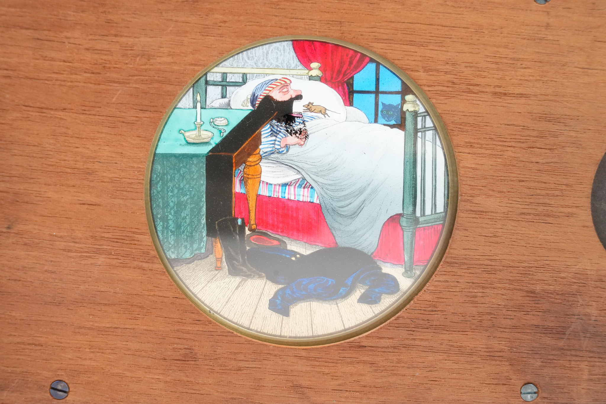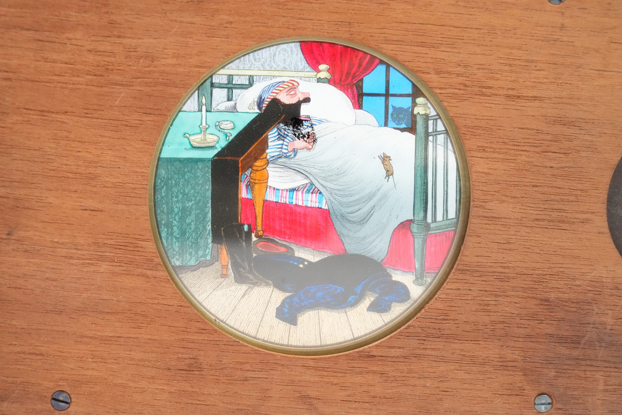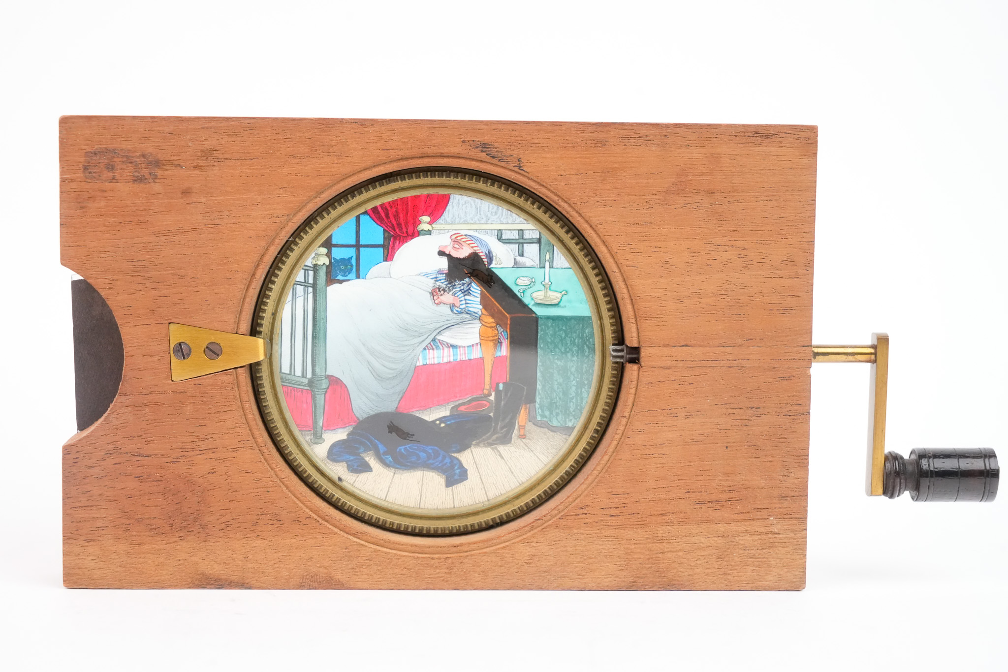 Plaque de lanterne magique à système rotatif et mécanique pour lanterne magique. "Le Mangeur de Rats". Lorsque l'on tourne la manivelle, on peut suivre la progression du rat évoluant sur le lit de l'homme endormi, jusqu'au moment ou il disparait en étant avalé. Une lamelle de verre actionne la bouche. Le cycle continue sans fin ! Dimensions: 18 cm (22,5 cm avec la manivelle) de longueur, 11cm de hauteur et 2 cm d'épaisseur. Circa 1870.