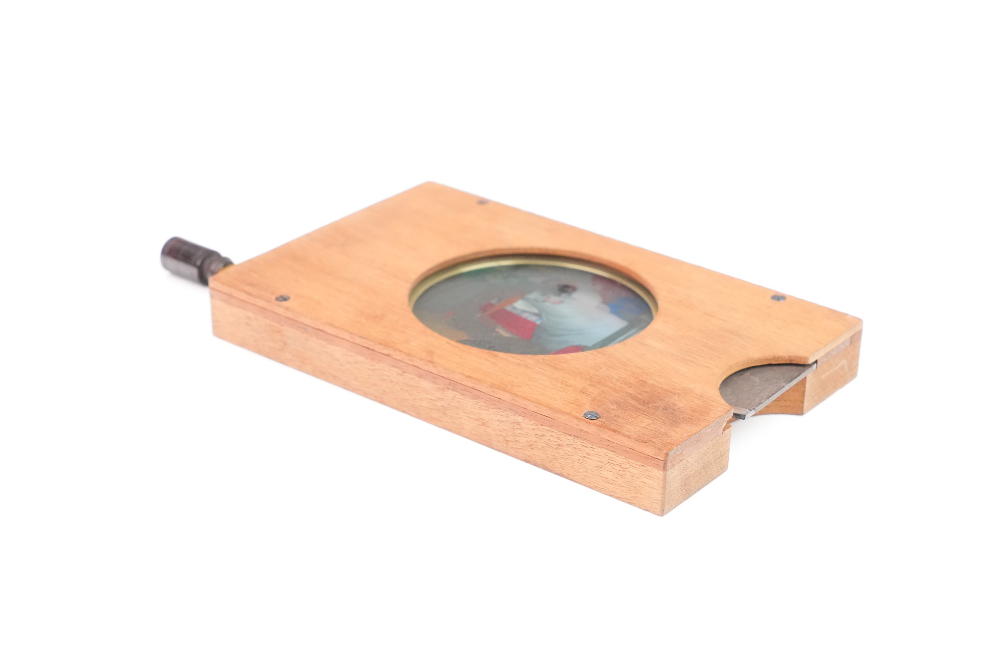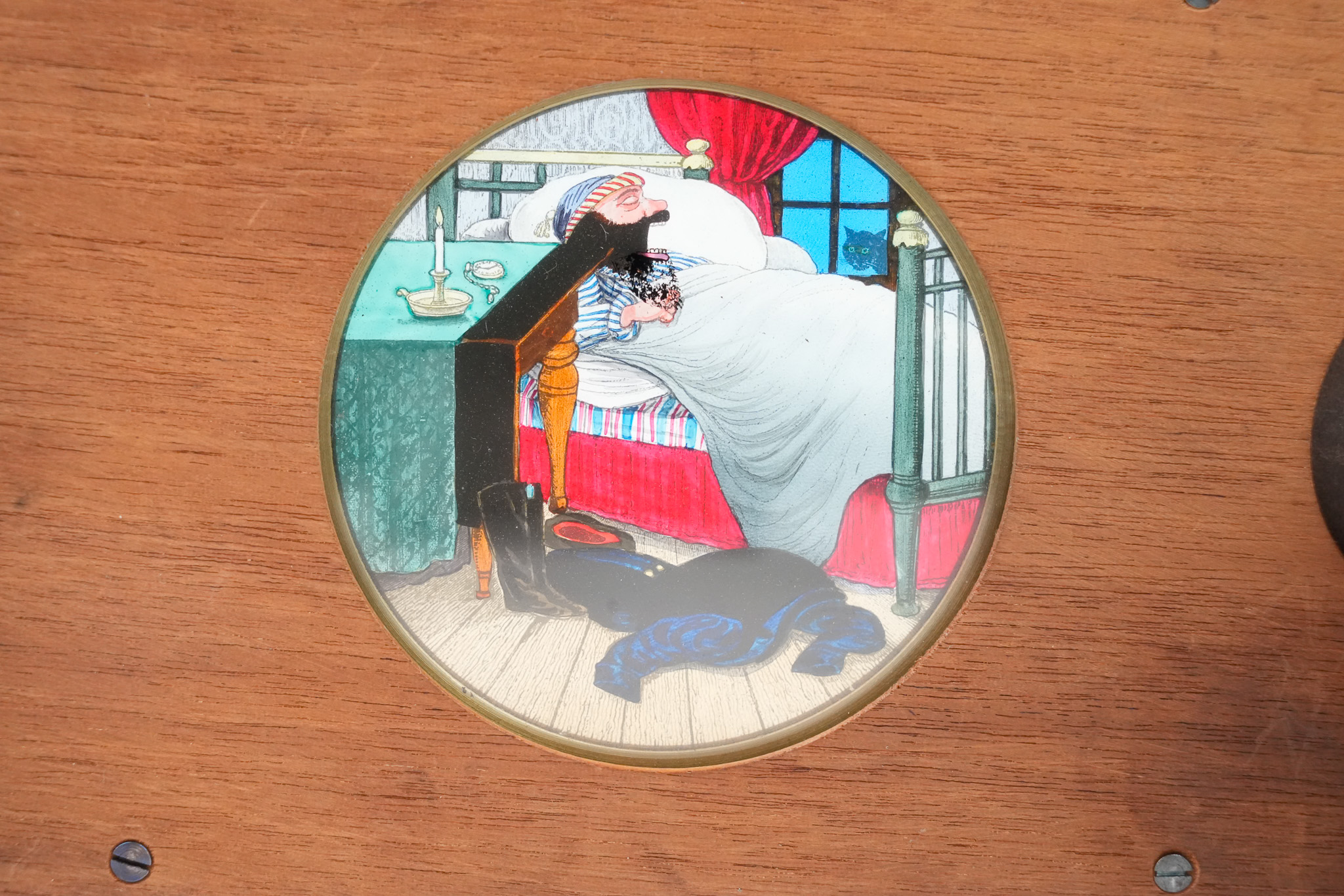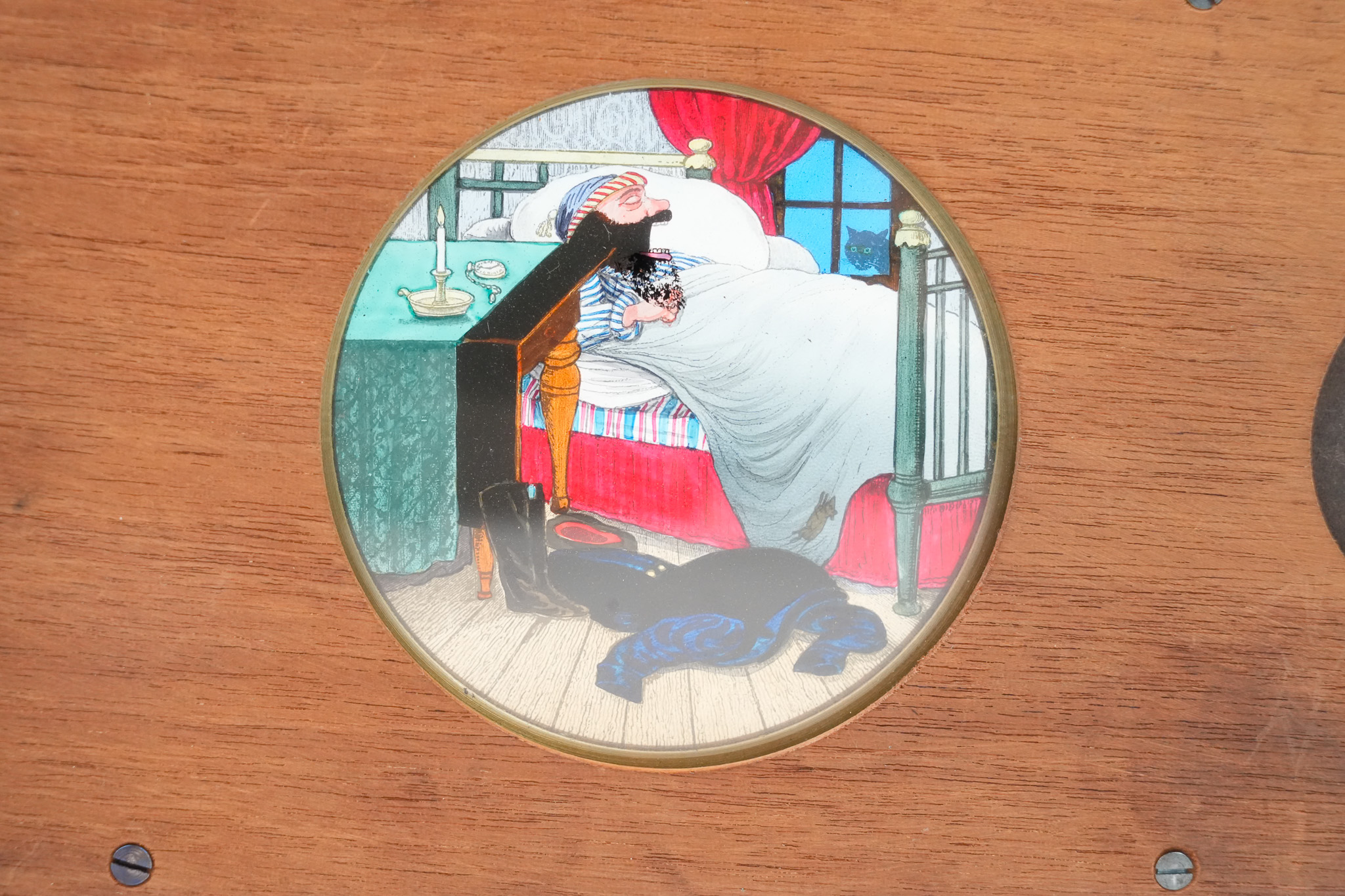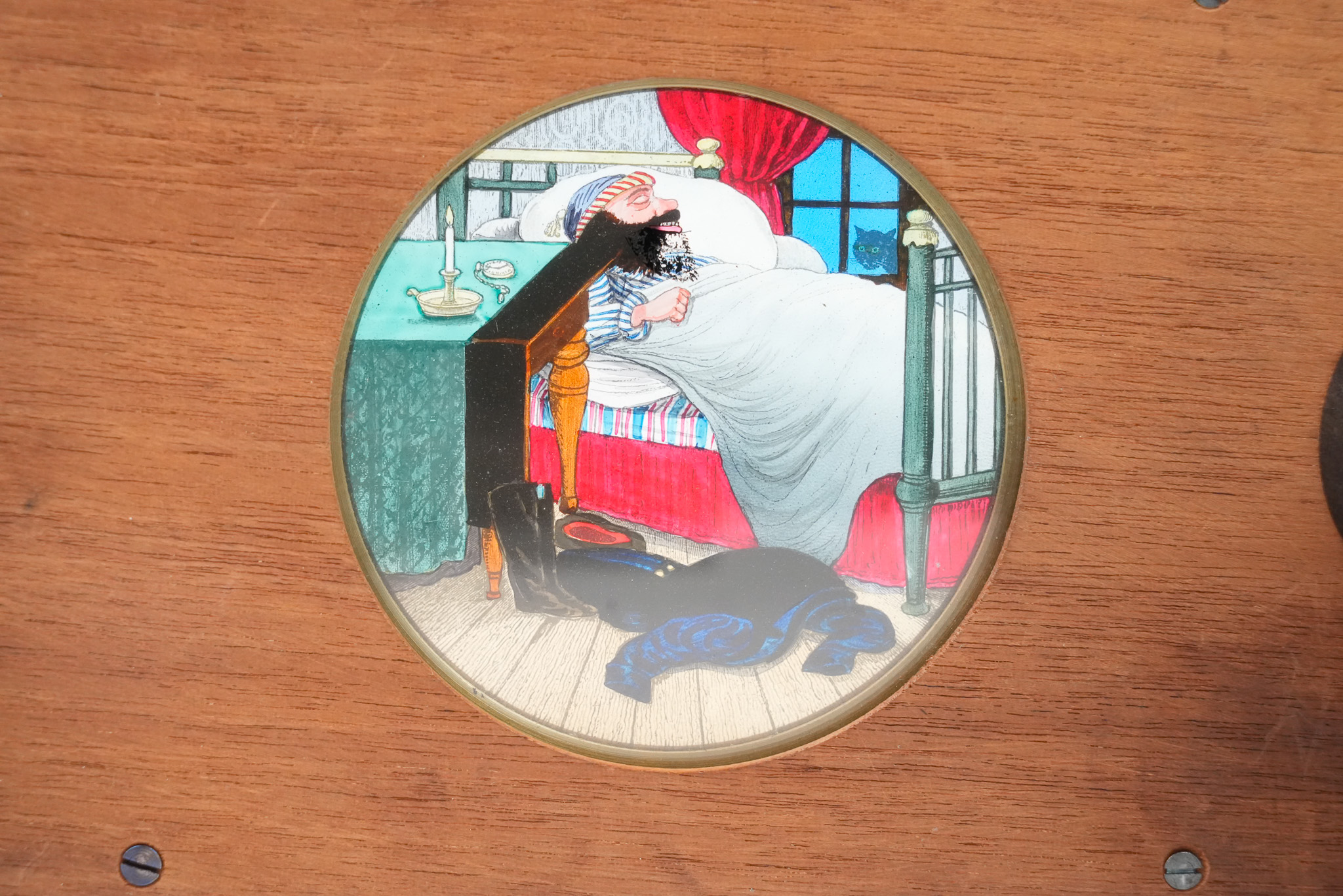 Plaque de lanterne magique à système rotatif et mécanique pour lanterne magique. "Le Mangeur de Rats". Lorsque l'on tourne la manivelle, on peut suivre la progression du rat évoluant sur le lit de l'homme endormi, jusqu'au moment ou il disparait en étant avalé. Une lamelle de verre actionne la bouche. Le cycle continue sans fin ! Dimensions: 18 cm (22,5 cm avec la manivelle) de longueur, 11cm de hauteur et 2 cm d'épaisseur. Circa 1870.