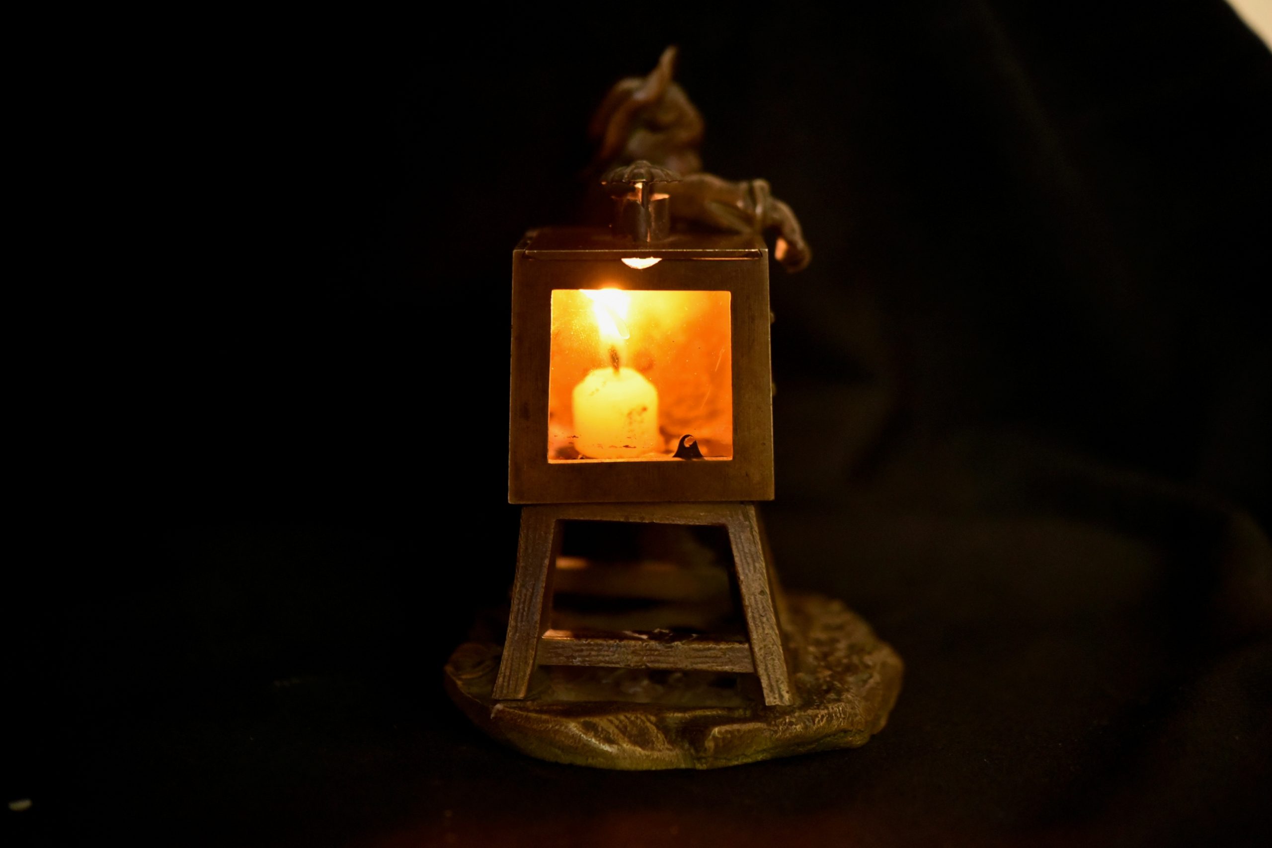 Belle et rare veilleuse en bronze sur le thème de la boite optique à l’enfant. L’éclairage s’effectue par une bougie accessible par le haut de la boite optique portant la cheminée et qui coulisse entre deux glissières. Hauteur 16 cm, largeur 14 cm. Première moitié du 19ème siècle.