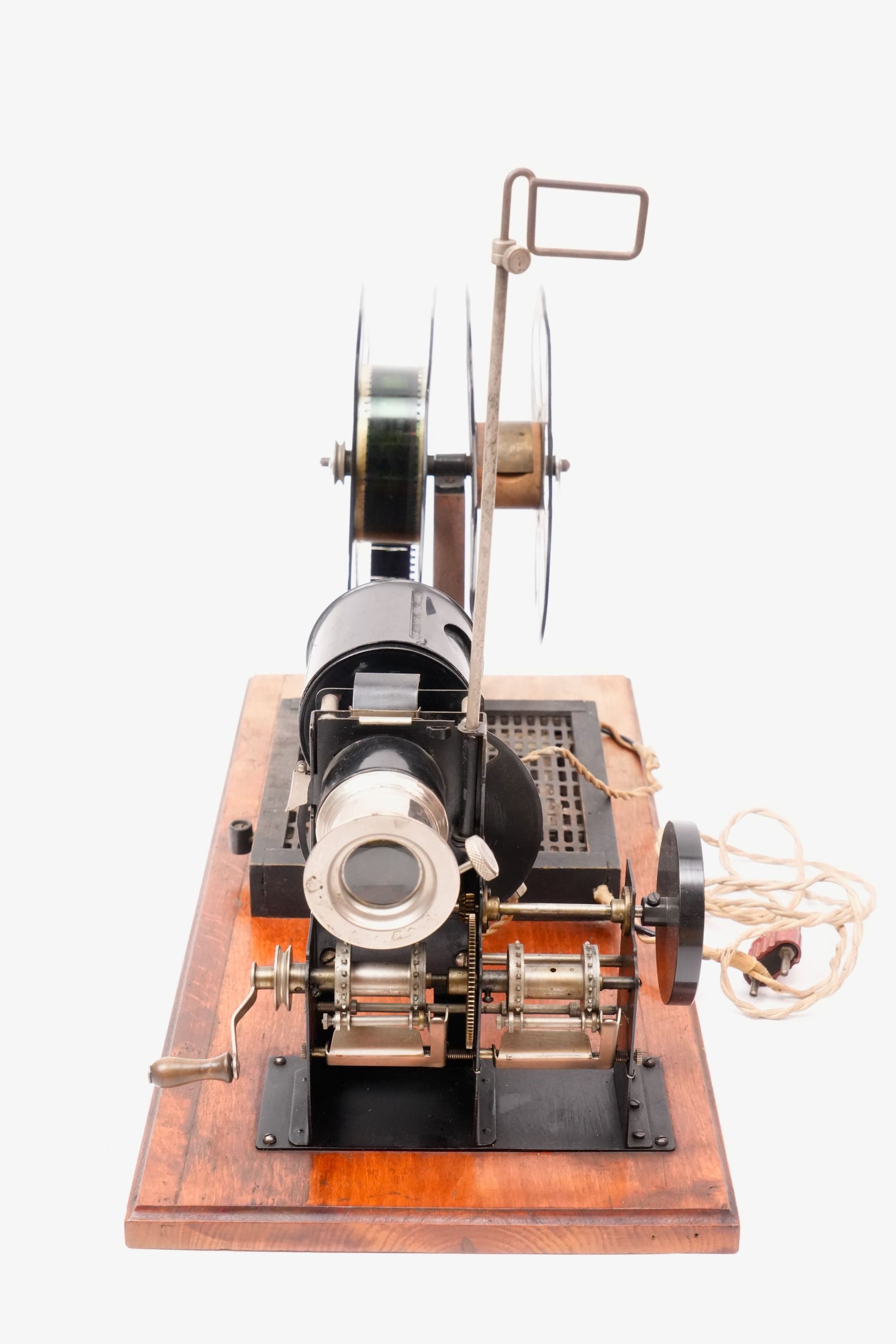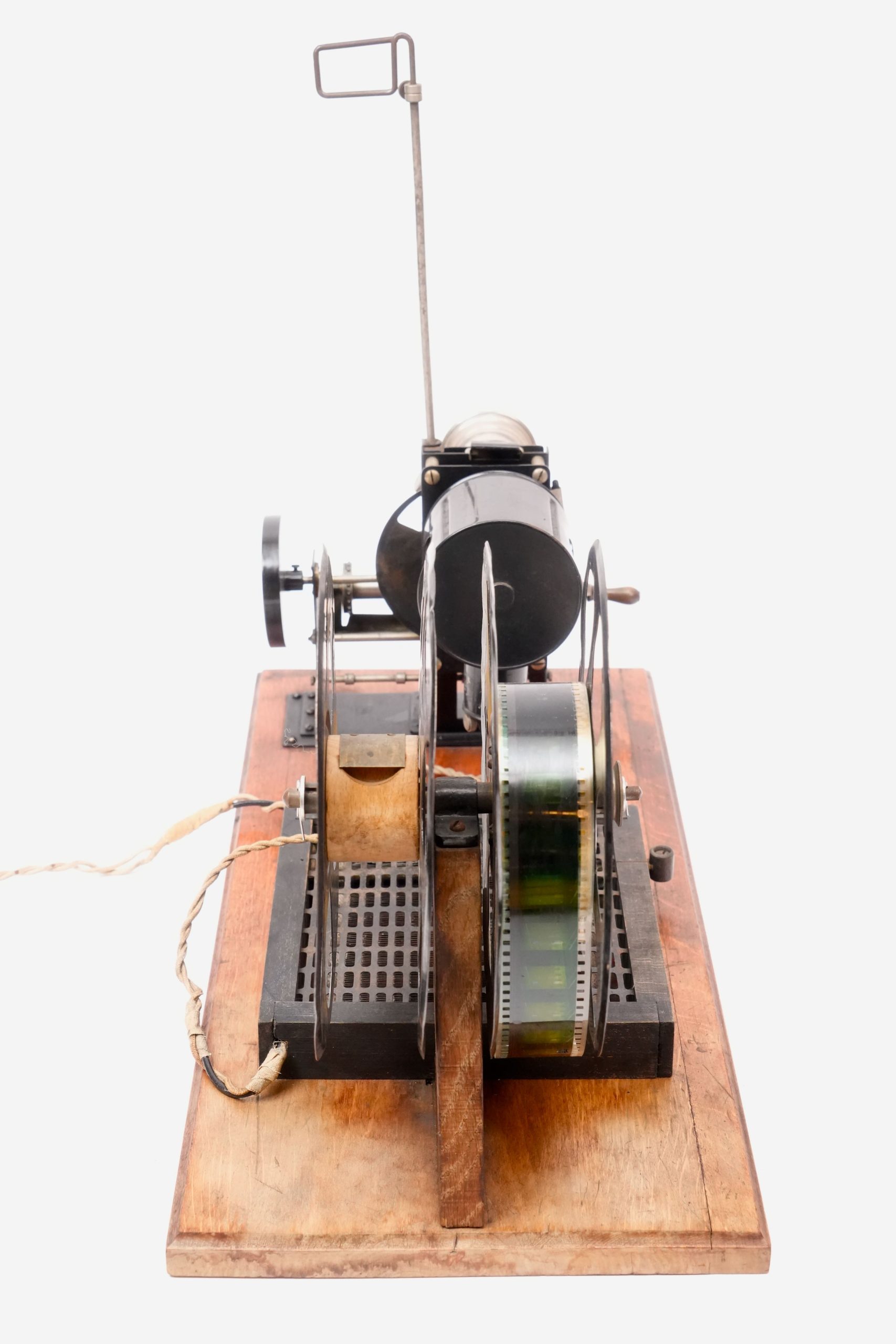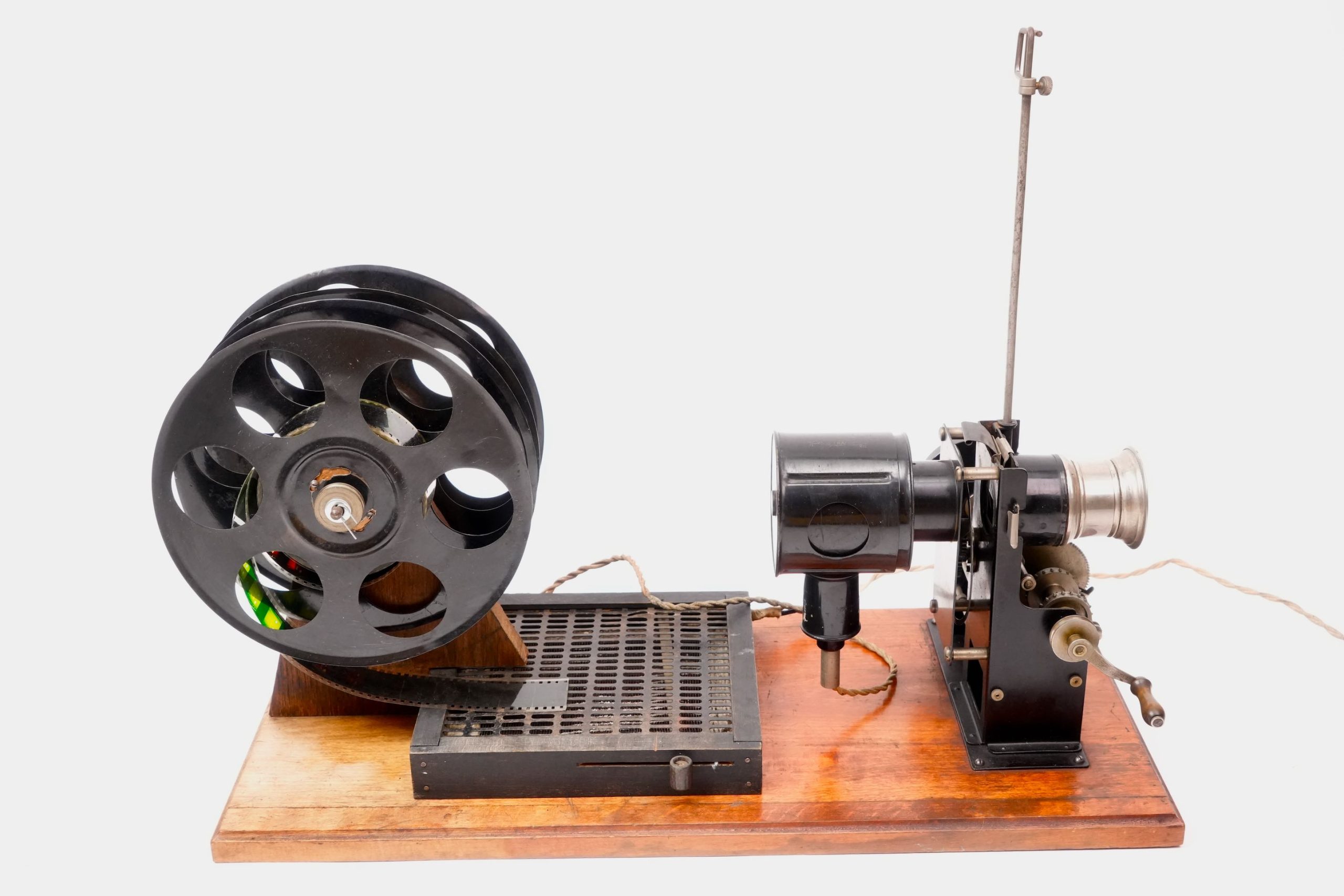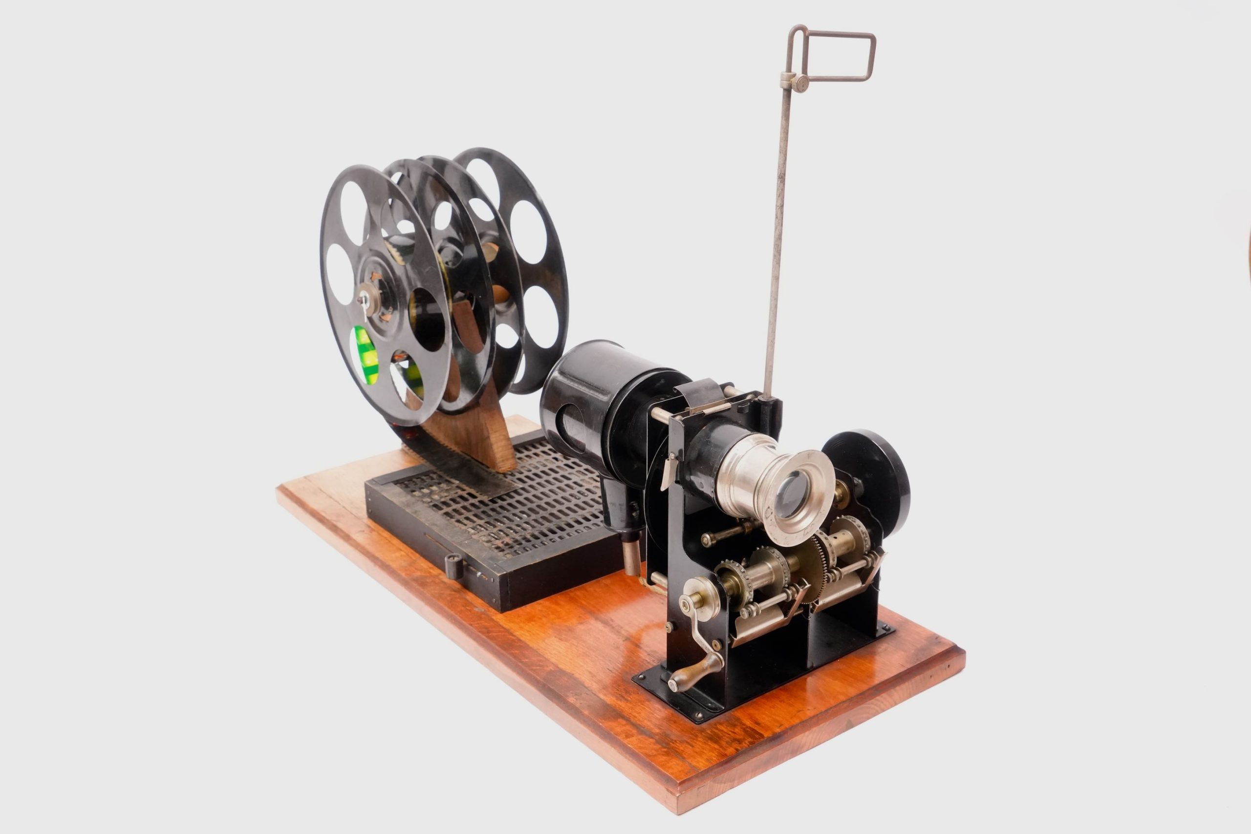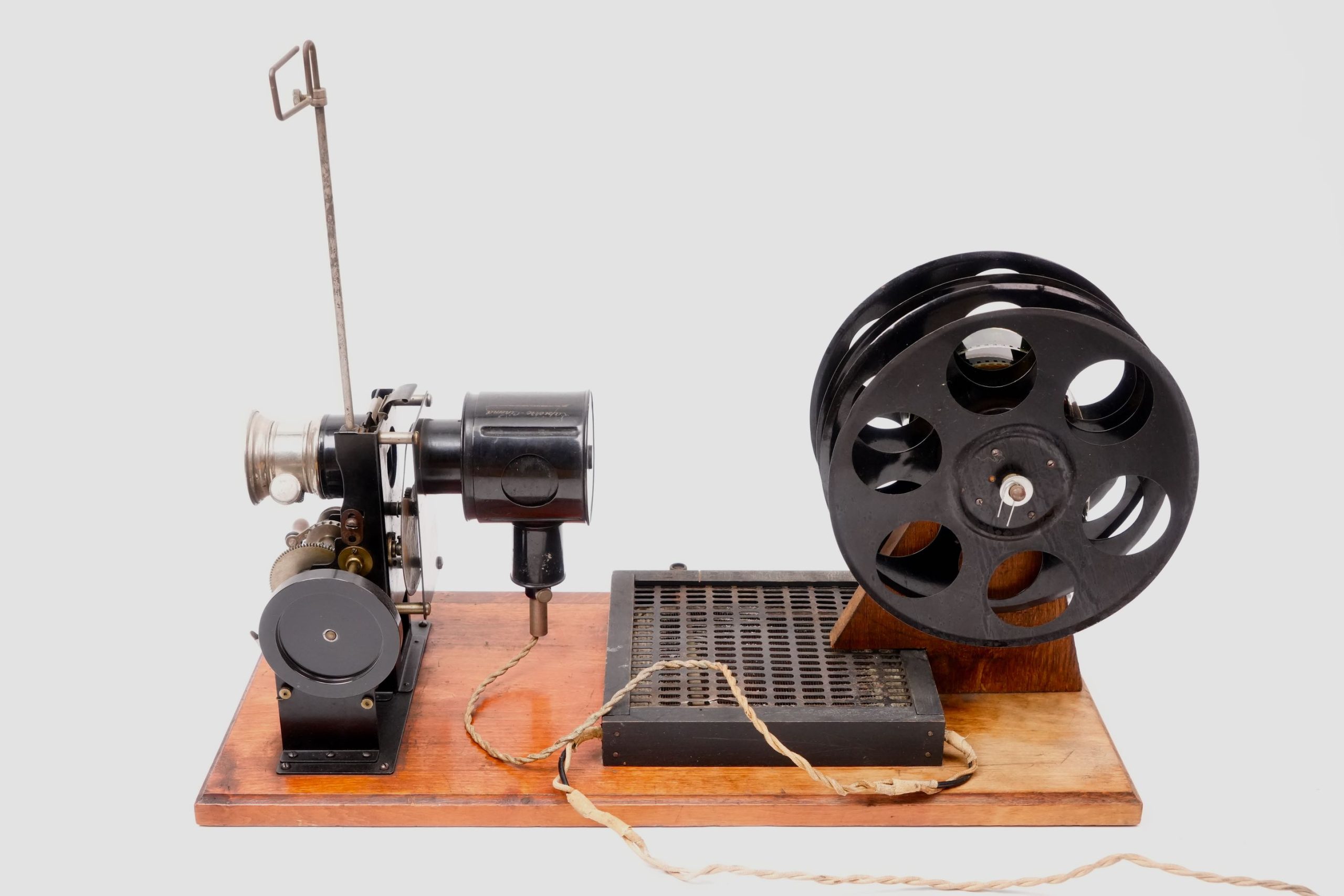 Cinématographe « Lapierre-Cinéma », vers 1925-1930. — Projecteur de cinéma amateur pour film 35 mm, monté sur planche en bois avec alimentation électrique intégrée et grandes bobines métalliques. L’appareil, de fabrication française, porte l’inscription « Lapierre-Cinéma » sur la lanterne. Équipé d’un mécanisme à engrenages apparent et d’une lanterne de projection à condensateur et lentille réglable, il permettait la projection de courts films éducatifs ou de divertissement dans un cadre familial ou scolaire.