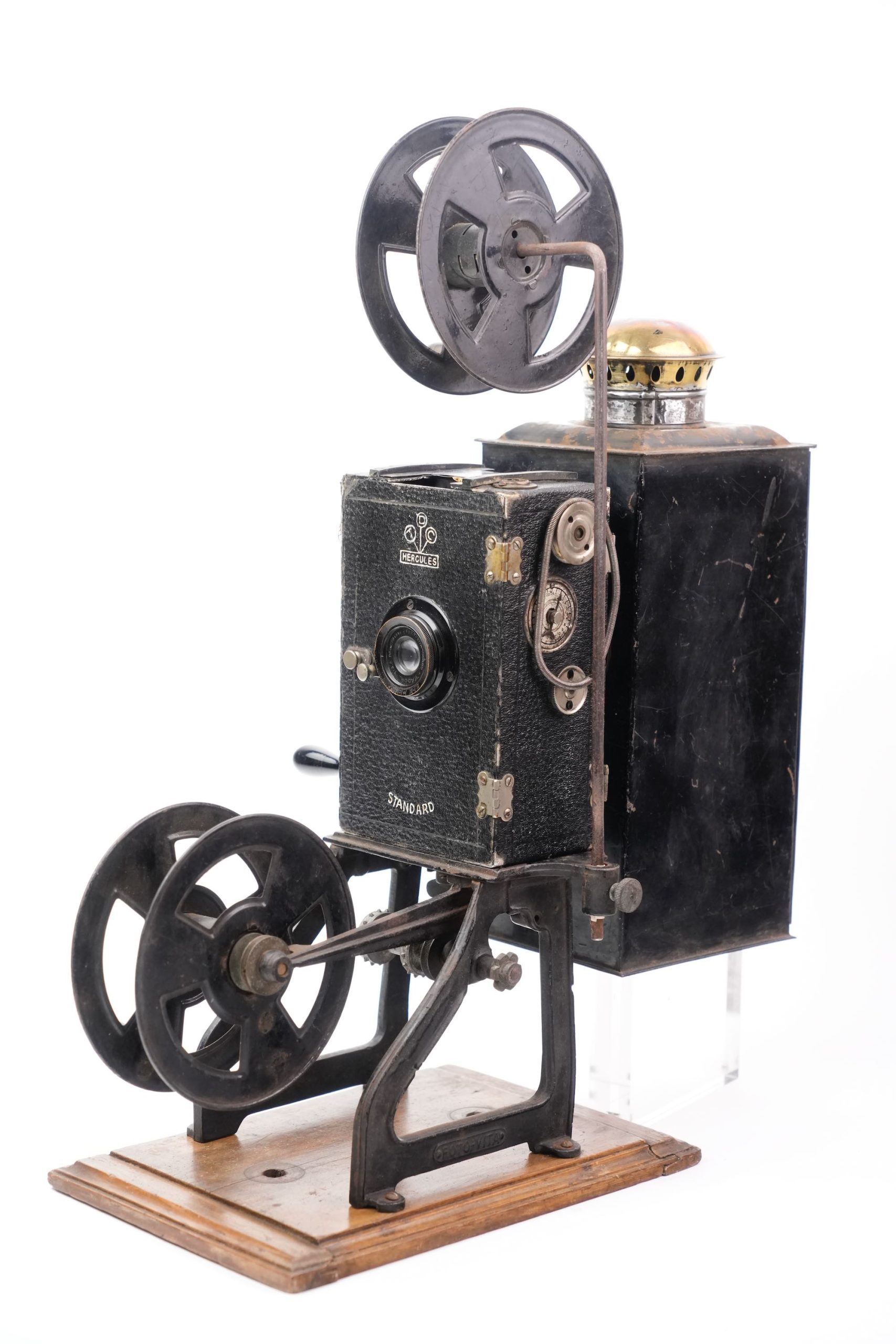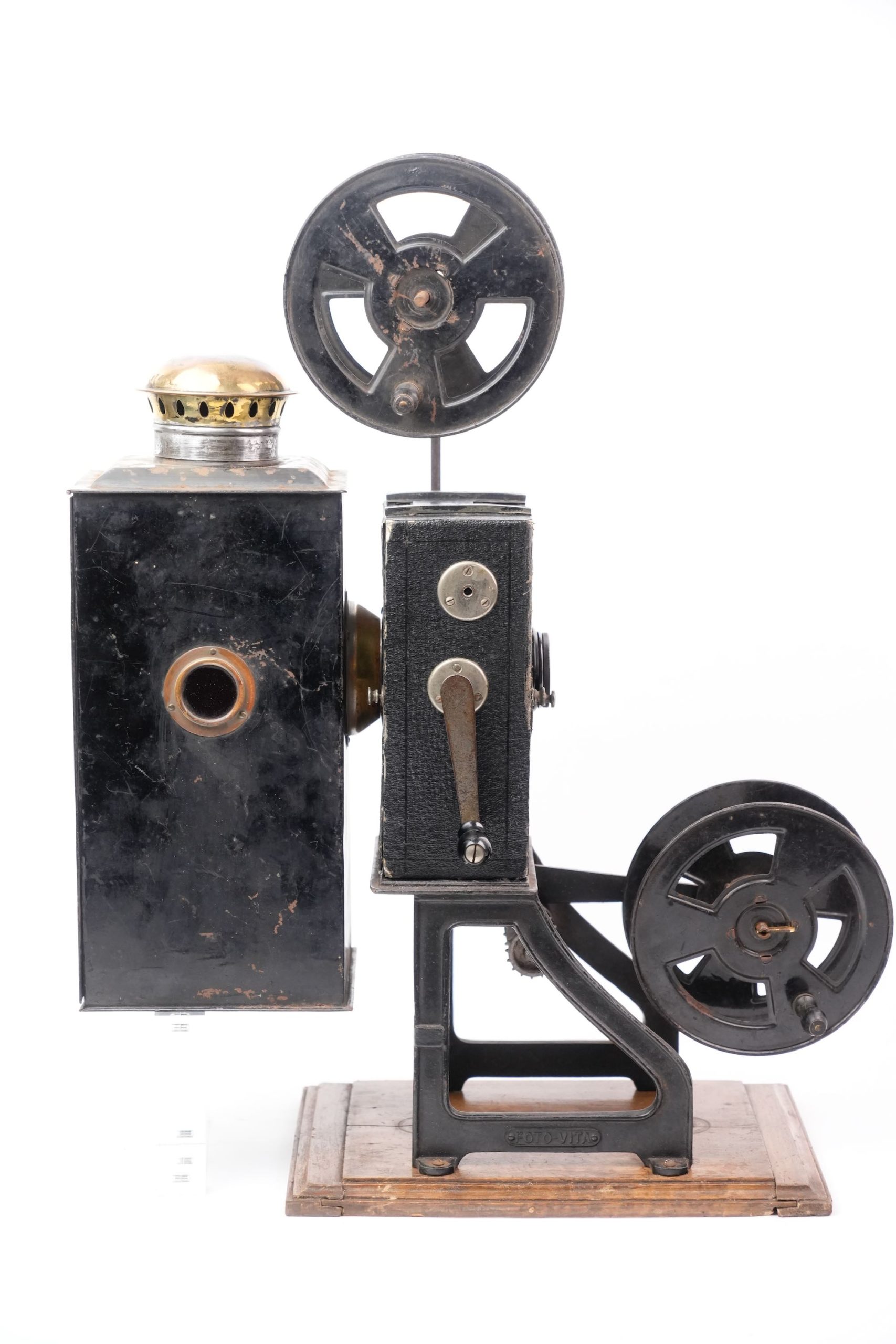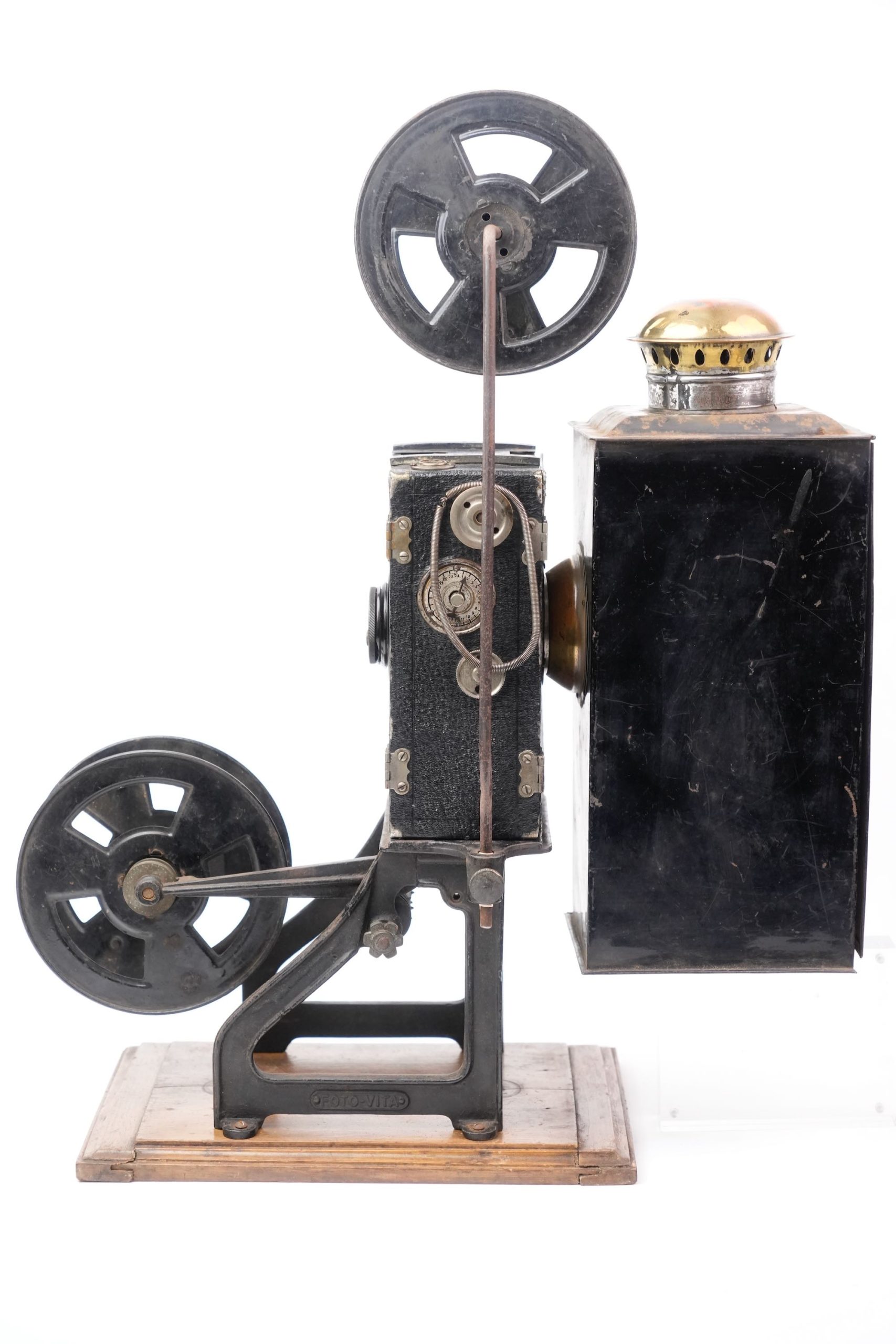 <p class="p1">Rare 35 mm movie camera, equipped with a side crank for film transport and a black-coated body. An interesting feature is that it comes with its own projection system, including a lantern, reels, and a pulley mechanism mounted on a wooden base. This set allowed both filming and projection, in an ingenious design typical of the early days of amateur cinema. In good overall condition, with signs of wear, complete and rare in this combined camera/projector configuration. Although less well known than the major French or German companies, Italian production during this period was evidence of an inventive local industry, albeit with more limited distribution. 1920-30.</p>