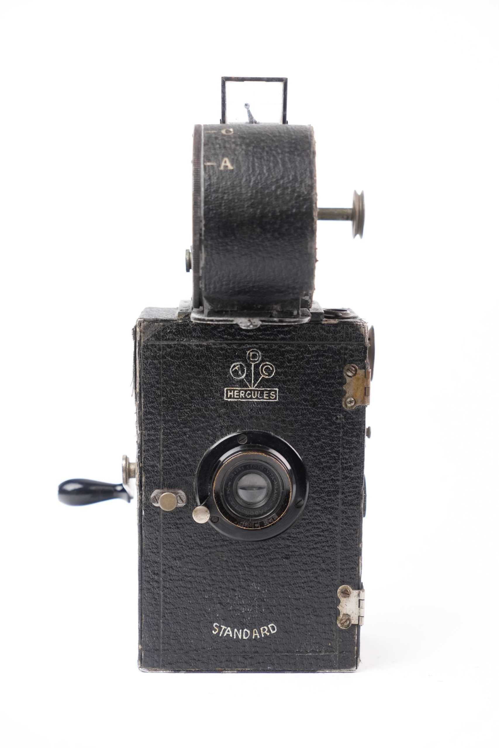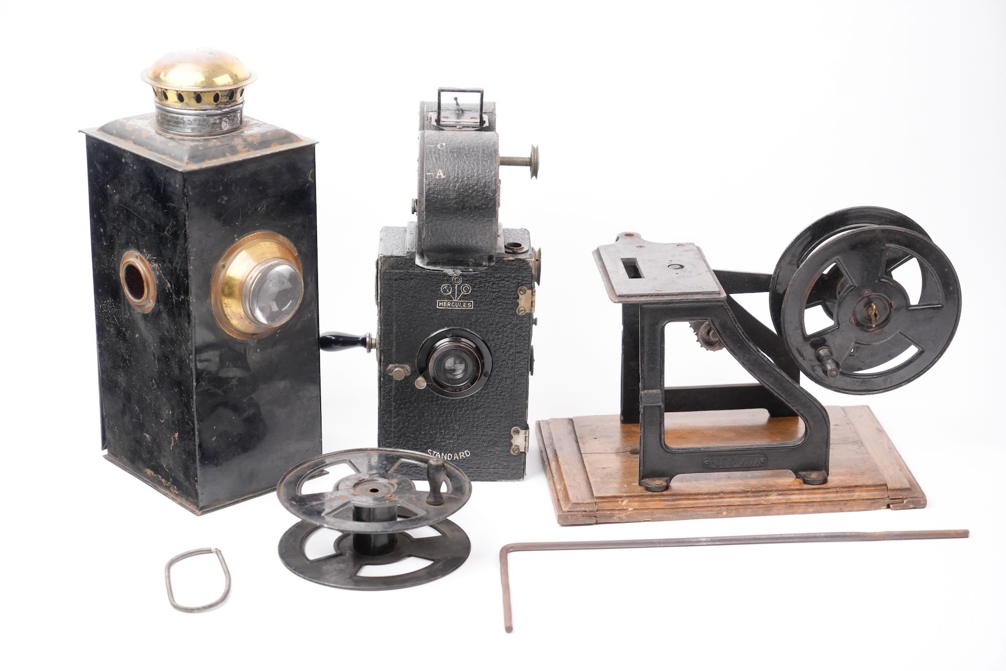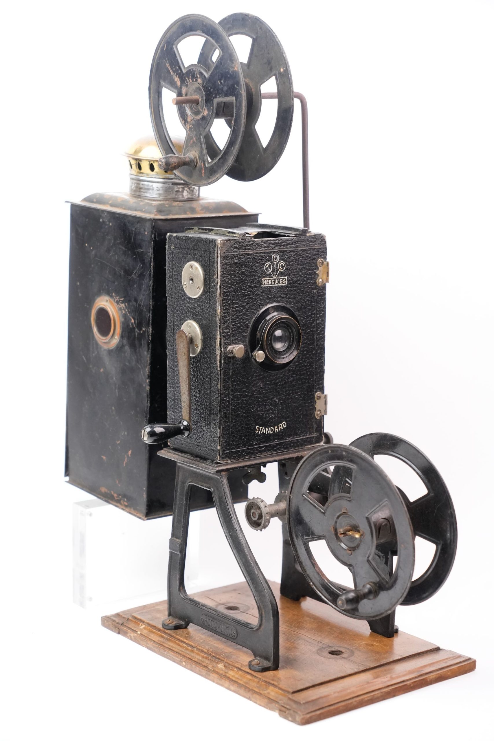 <p class="p1">Rare 35 mm movie camera, equipped with a side crank for film transport and a black-coated body. An interesting feature is that it comes with its own projection system, including a lantern, reels, and a pulley mechanism mounted on a wooden base. This set allowed both filming and projection, in an ingenious design typical of the early days of amateur cinema. In good overall condition, with signs of wear, complete and rare in this combined camera/projector configuration. Although less well known than the major French or German companies, Italian production during this period was evidence of an inventive local industry, albeit with more limited distribution. 1920-30.</p>