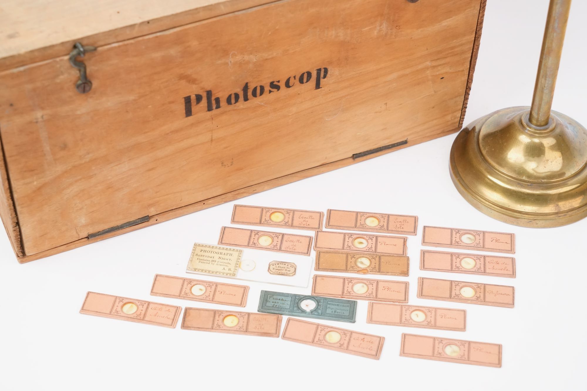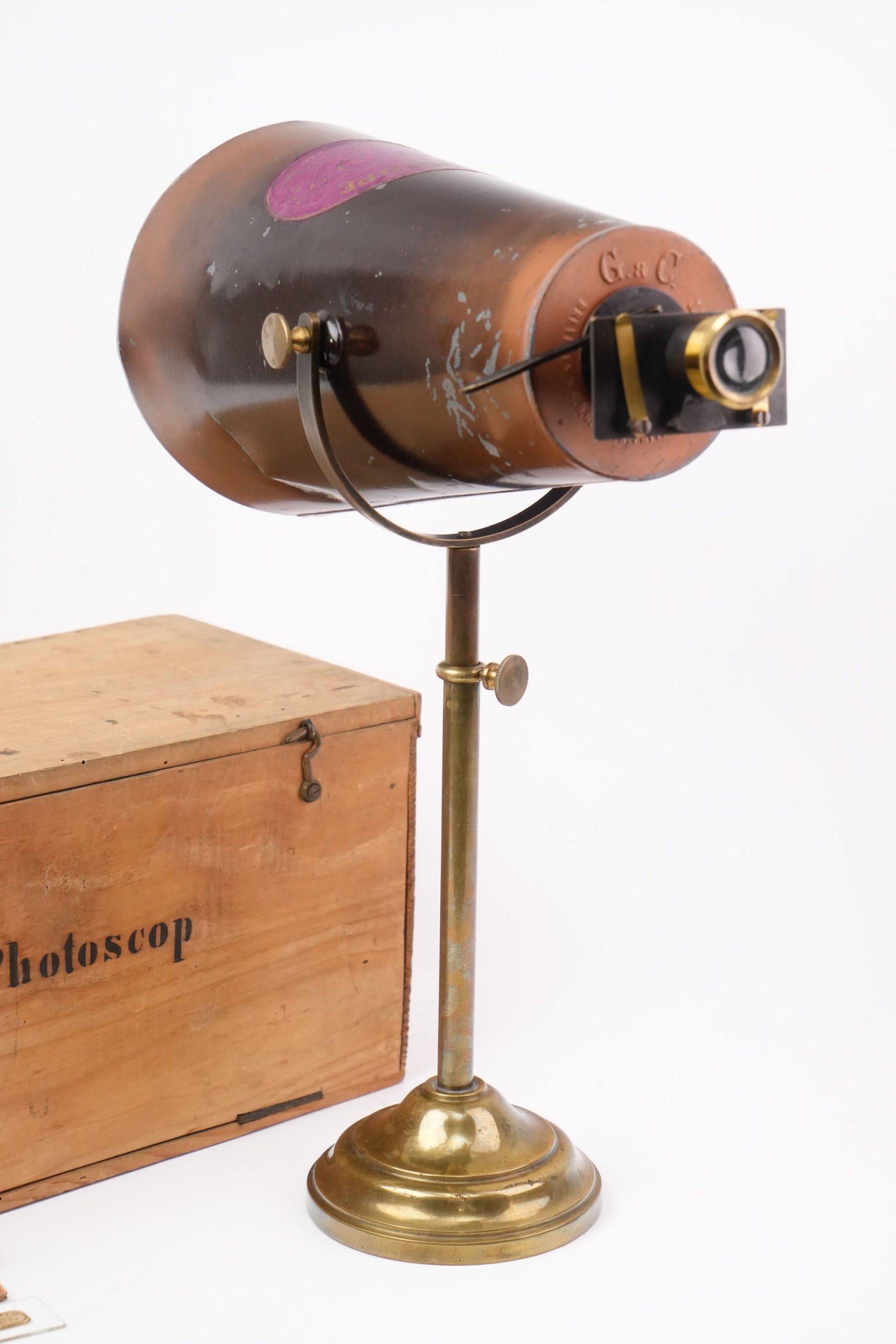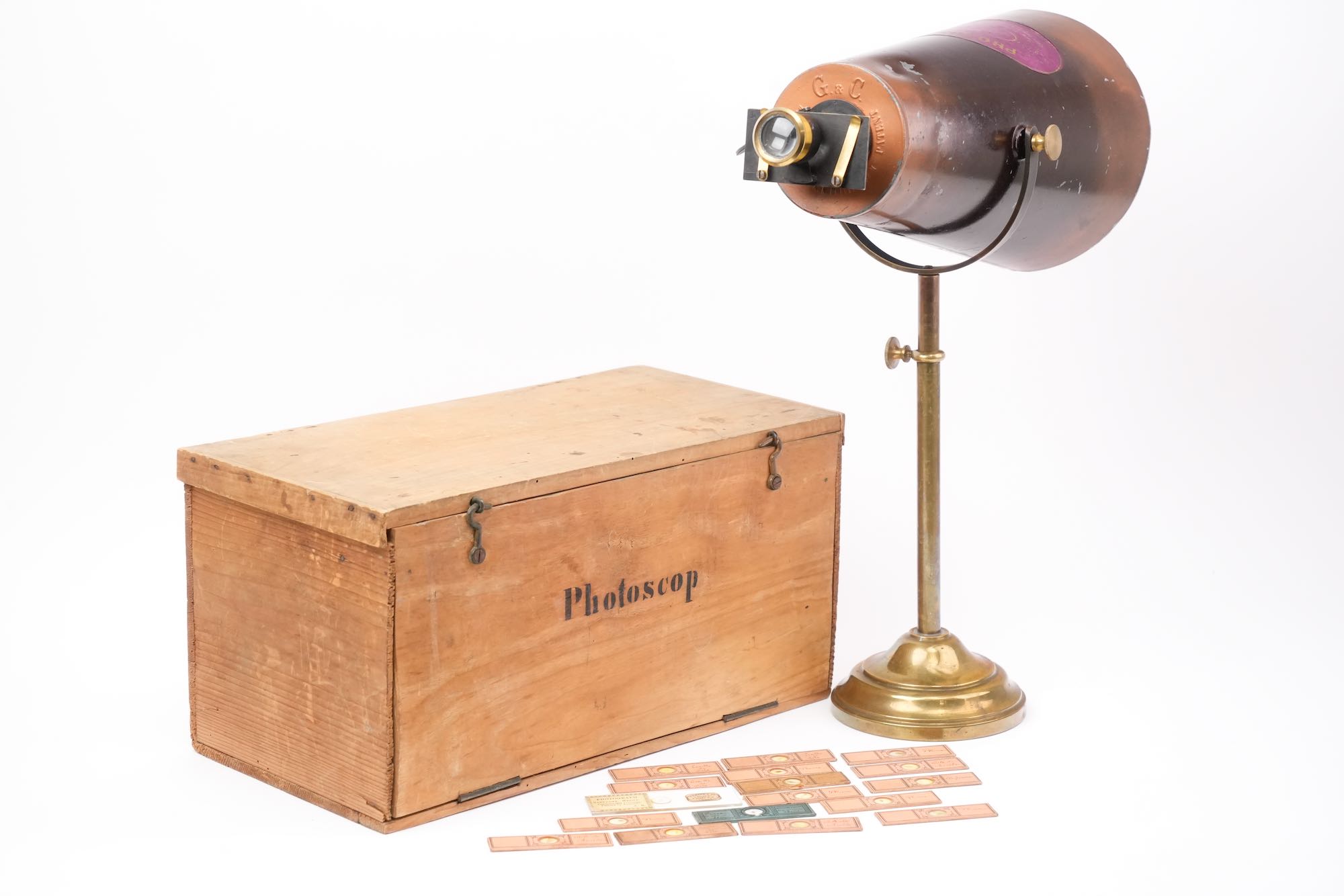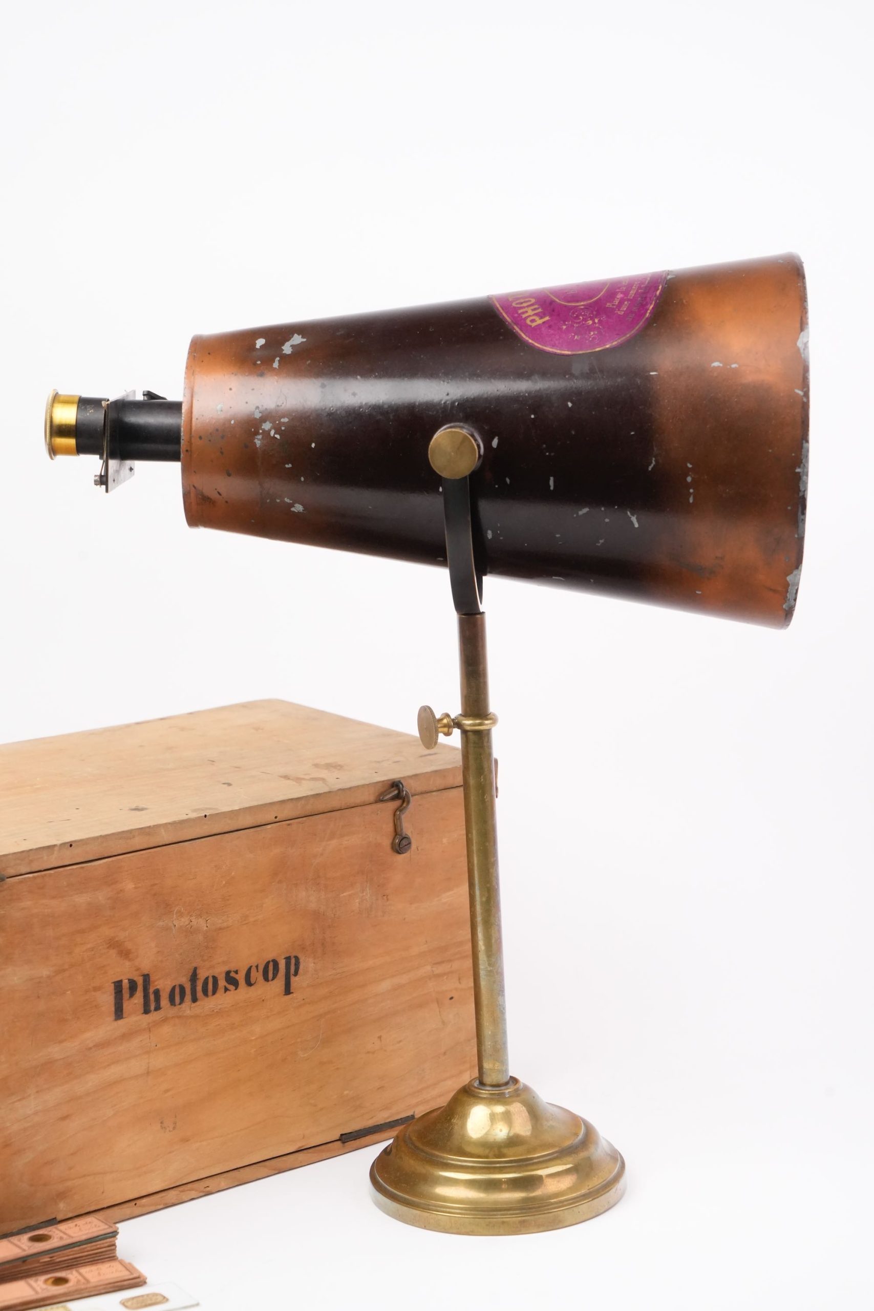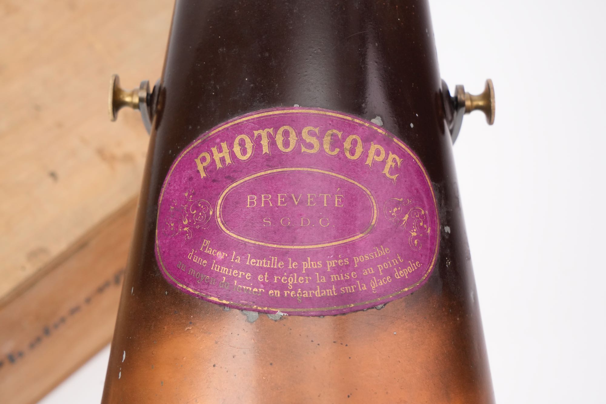 Superbe dispositif multifonctions, principalement employé pour visionner des plaques microscopiques. Dans les mots de ses deux inventeurs, le Photoscope est un : "instrument propre à agrandir et à projeter sur une surface plane les objets microscopiques, transparents ou translucides. Cet instrument s'emploie dans une chambre obscure et fonctionne en plaçant une lumière à l'une de ses extrémités. [...] Cet appareil peut s'utiliser pour faire des clichés photographiques en remplaçant la glace dépolie par une glace collodionnée ou préparée à cet effet." (brevet du 20 mars 1869). L'appareil est accompagné de 17 vues sur verre et vient dans son coffret en bois brut estampillé. Ensemble impressionnant.