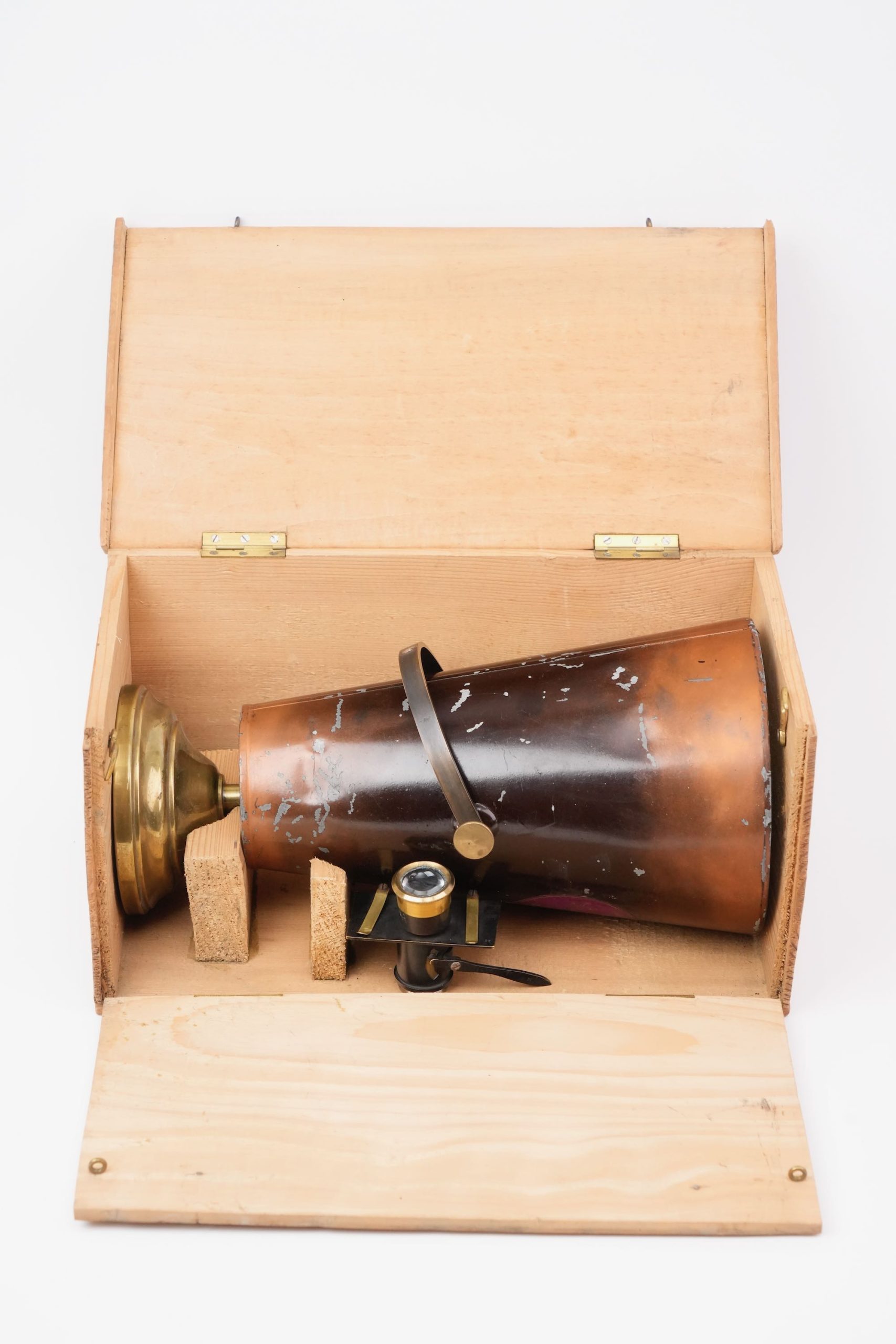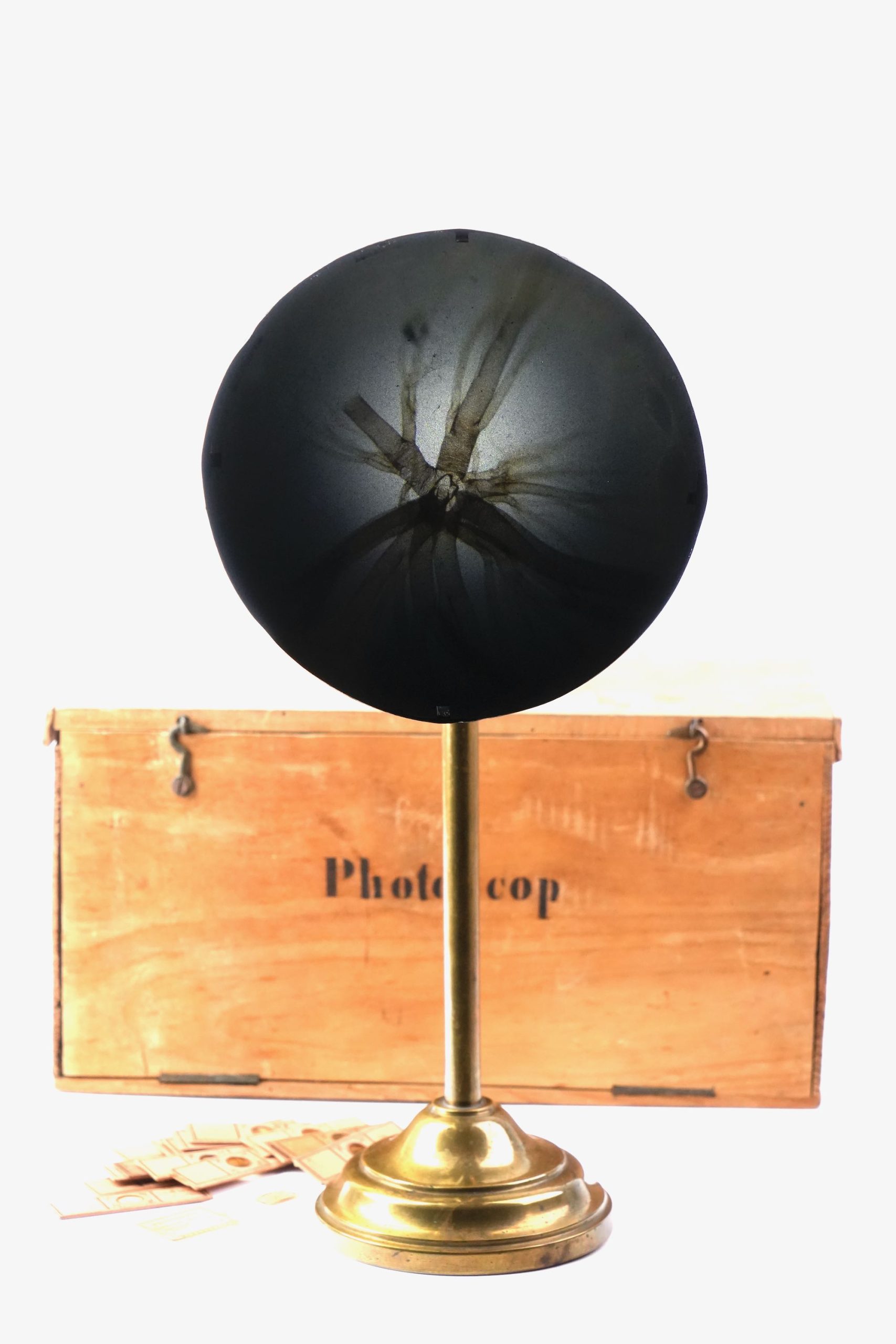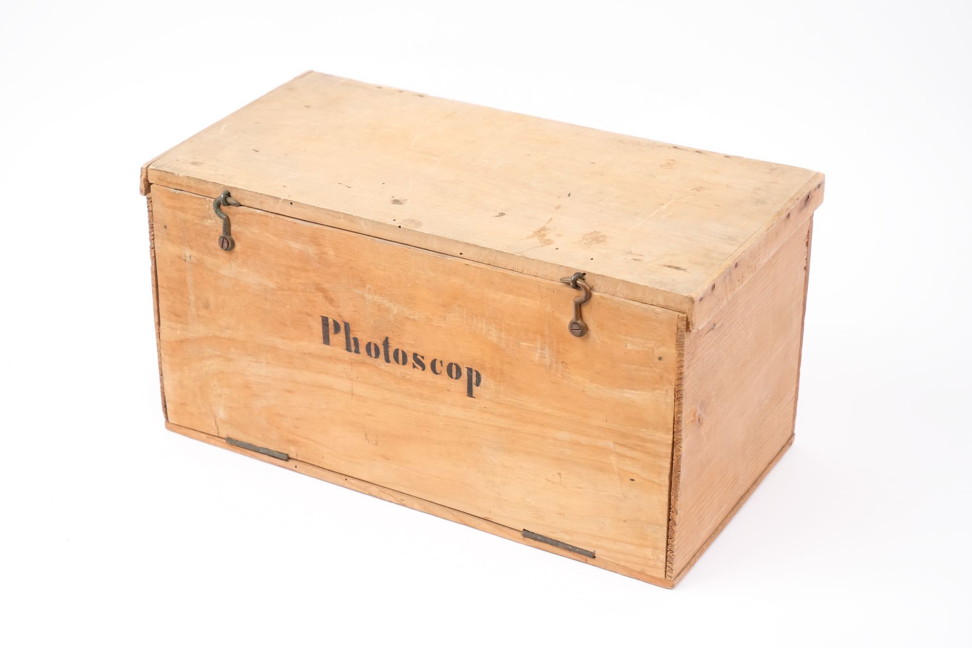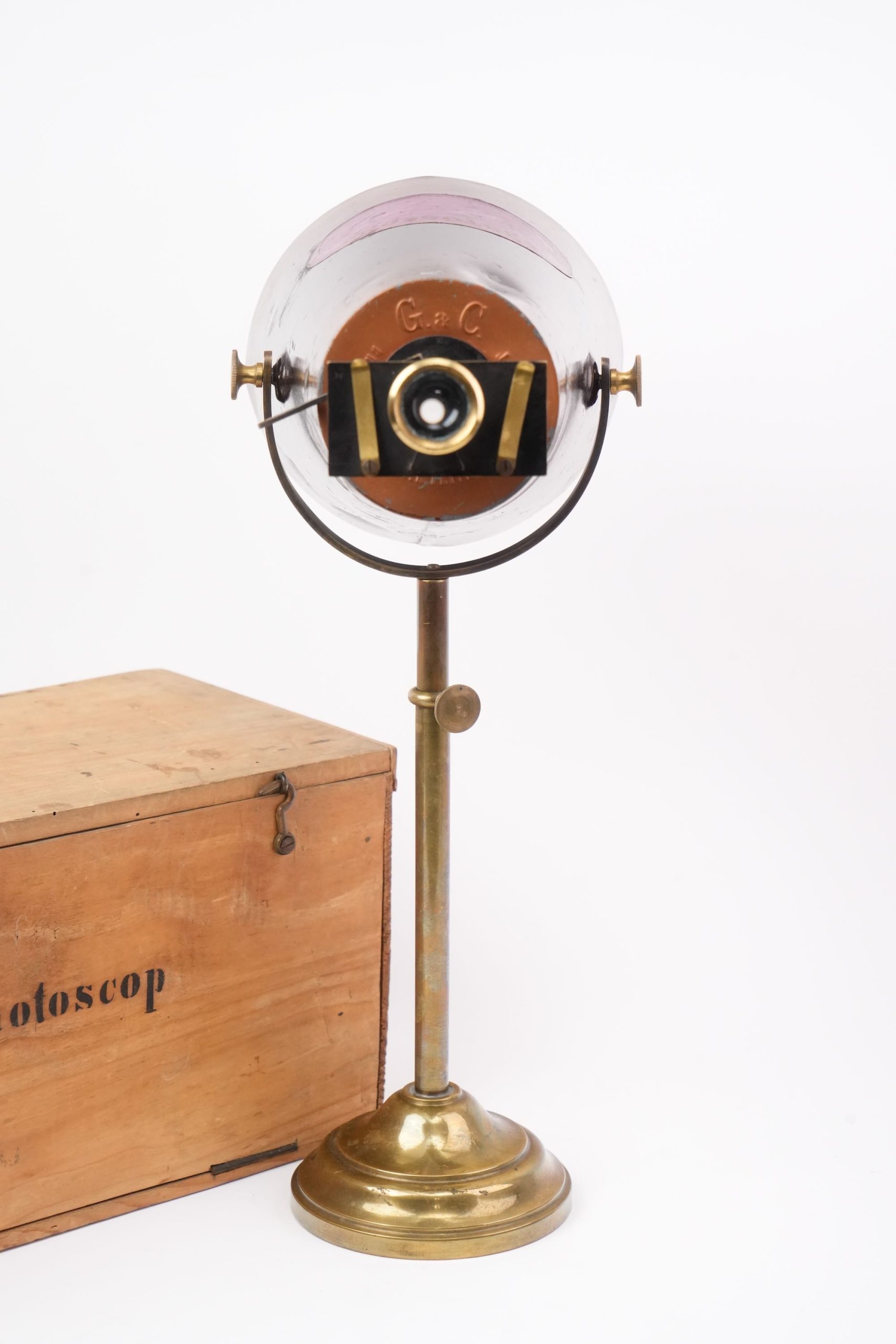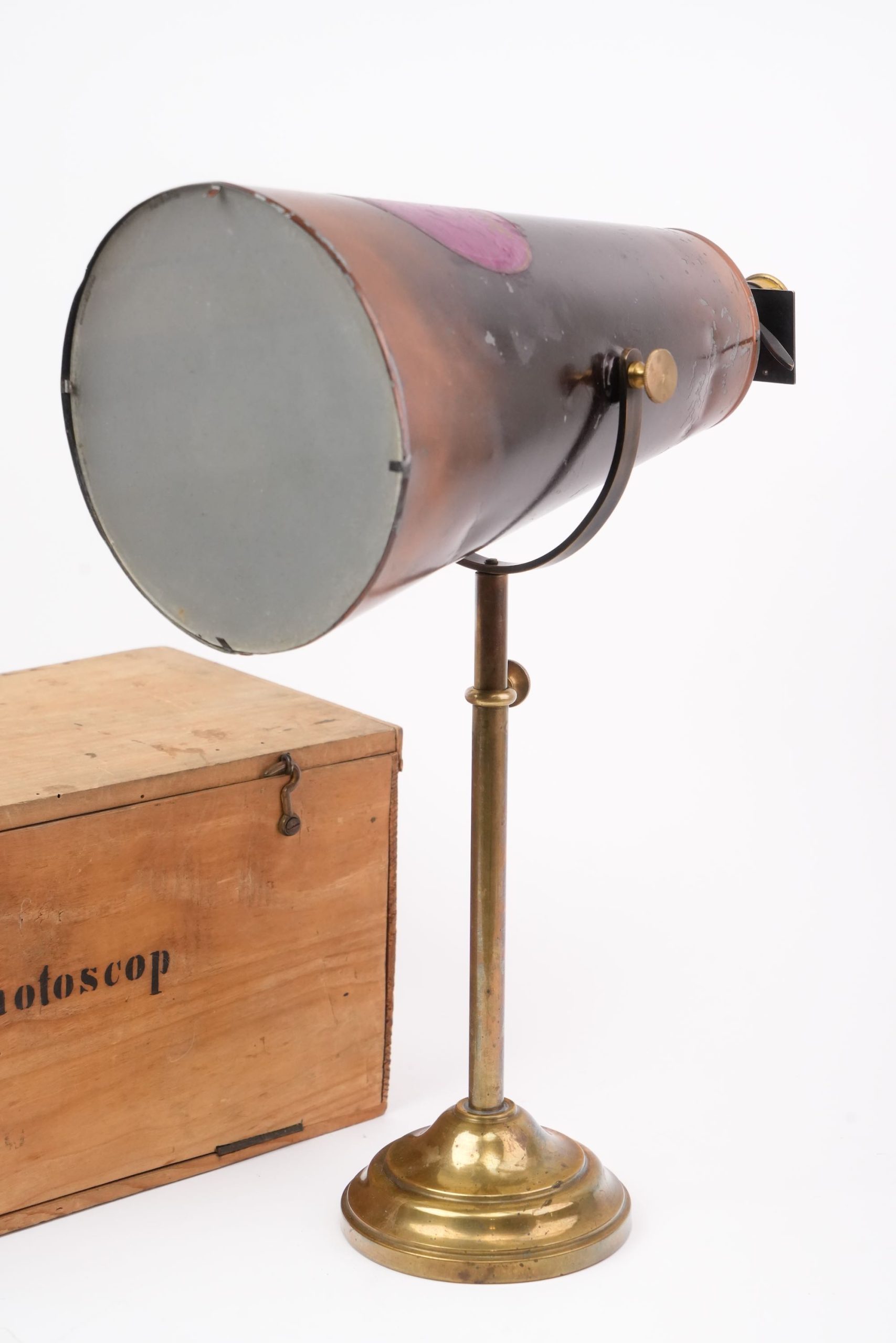 Superbe dispositif multifonctions, principalement employé pour visionner des plaques microscopiques. Dans les mots de ses deux inventeurs, le Photoscope est un : "instrument propre à agrandir et à projeter sur une surface plane les objets microscopiques, transparents ou translucides. Cet instrument s'emploie dans une chambre obscure et fonctionne en plaçant une lumière à l'une de ses extrémités. [...] Cet appareil peut s'utiliser pour faire des clichés photographiques en remplaçant la glace dépolie par une glace collodionnée ou préparée à cet effet." (brevet du 20 mars 1869). L'appareil est accompagné de 17 vues sur verre et vient dans son coffret en bois brut estampillé. Ensemble impressionnant.