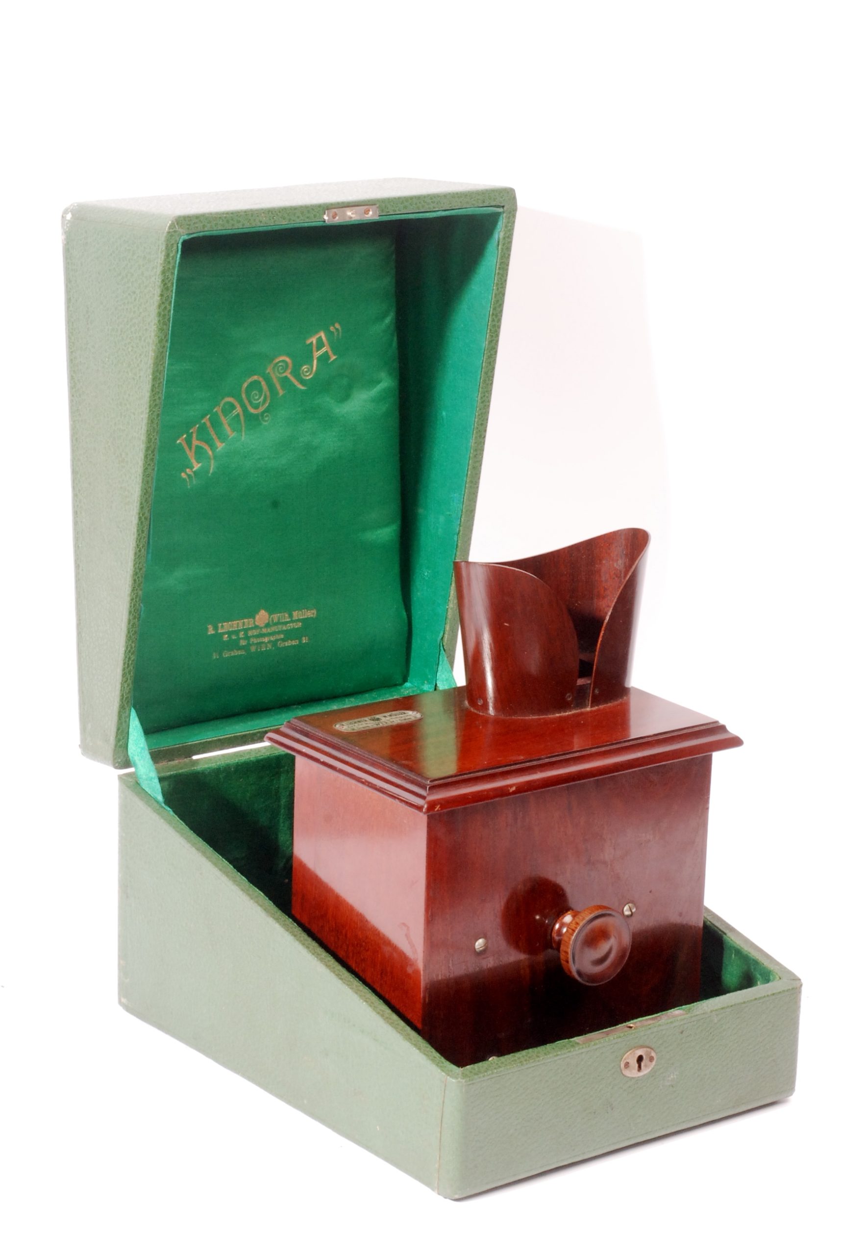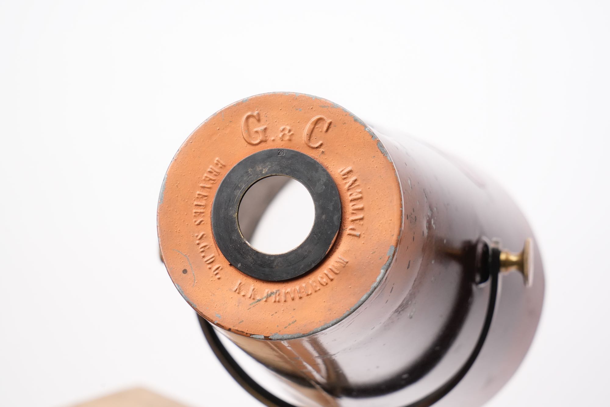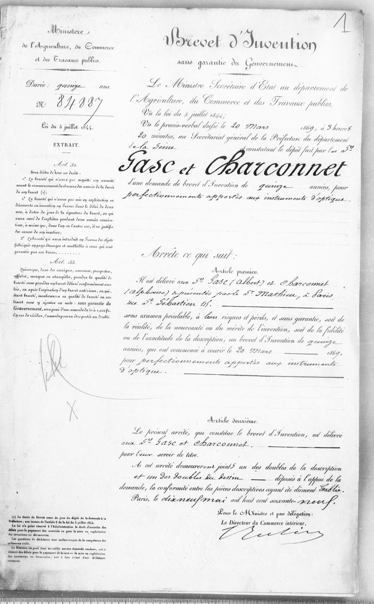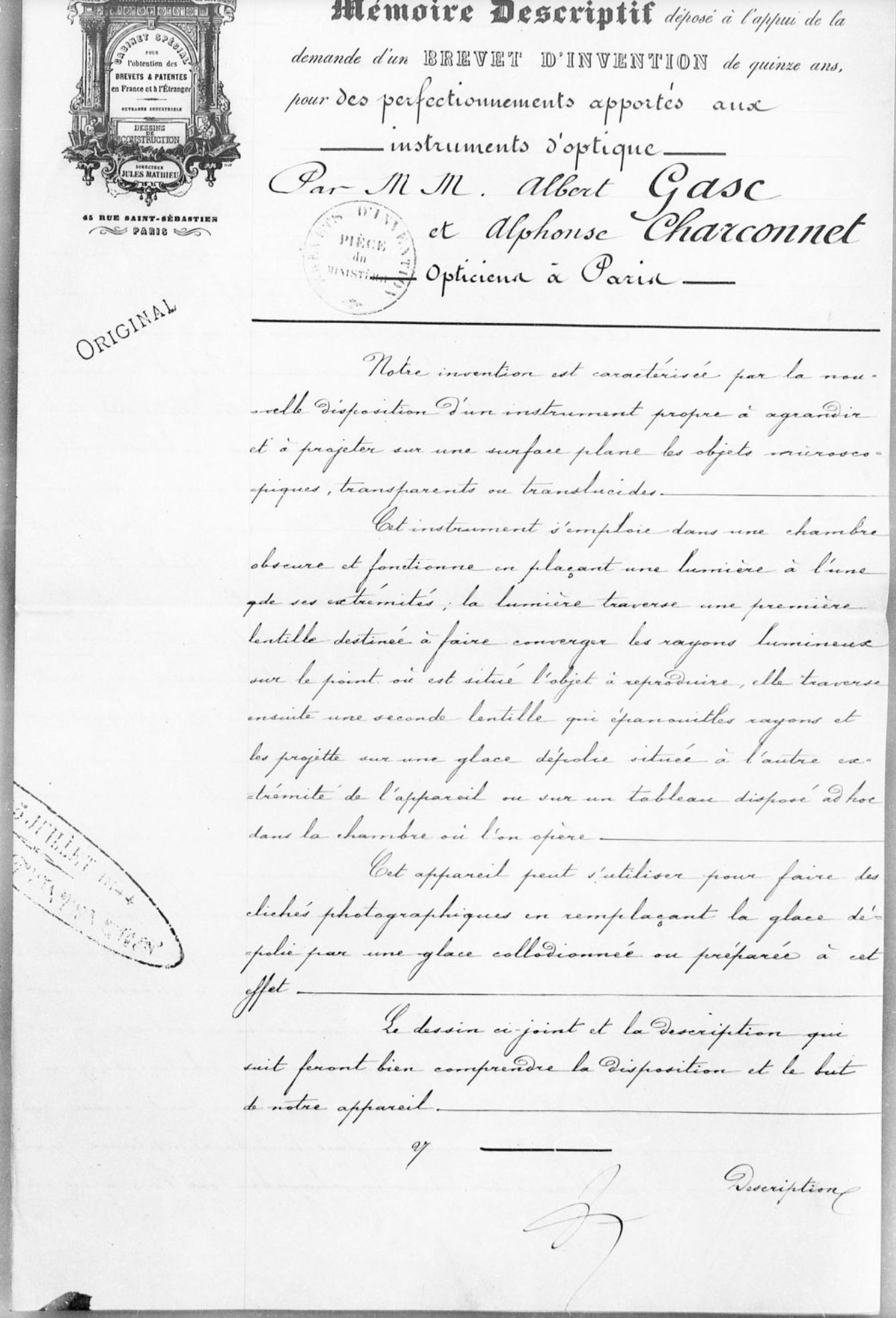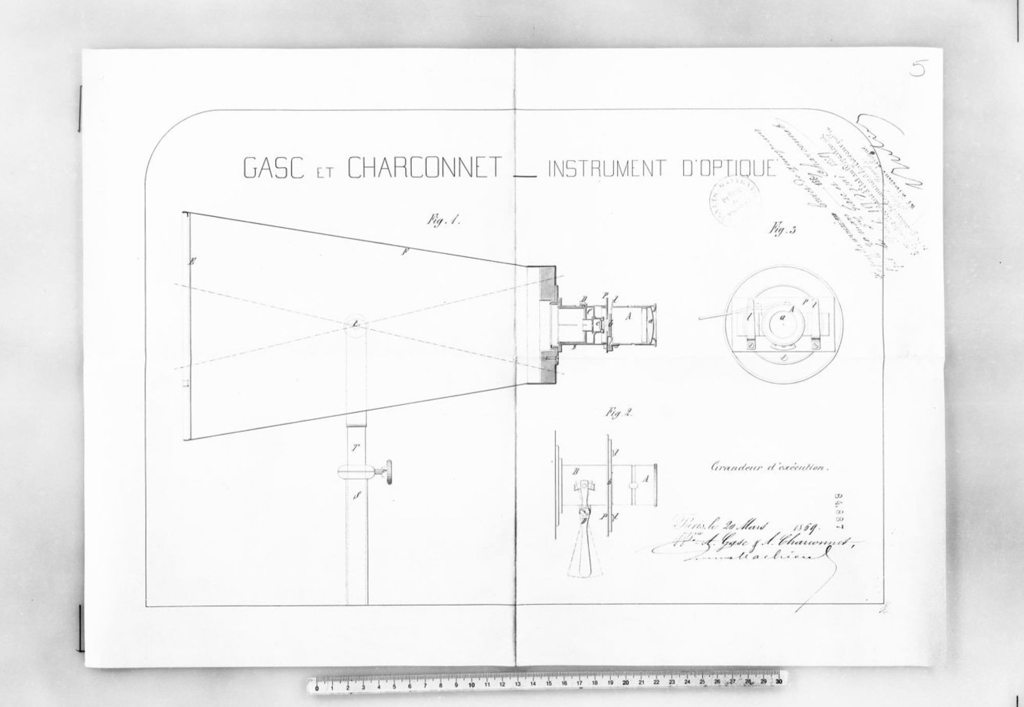 Superbe dispositif multifonctions, principalement employé pour visionner des plaques microscopiques. Dans les mots de ses deux inventeurs, le Photoscope est un : "instrument propre à agrandir et à projeter sur une surface plane les objets microscopiques, transparents ou translucides. Cet instrument s'emploie dans une chambre obscure et fonctionne en plaçant une lumière à l'une de ses extrémités. [...] Cet appareil peut s'utiliser pour faire des clichés photographiques en remplaçant la glace dépolie par une glace collodionnée ou préparée à cet effet." (brevet du 20 mars 1869). L'appareil est accompagné de 17 vues sur verre et vient dans son coffret en bois brut estampillé. Ensemble impressionnant.