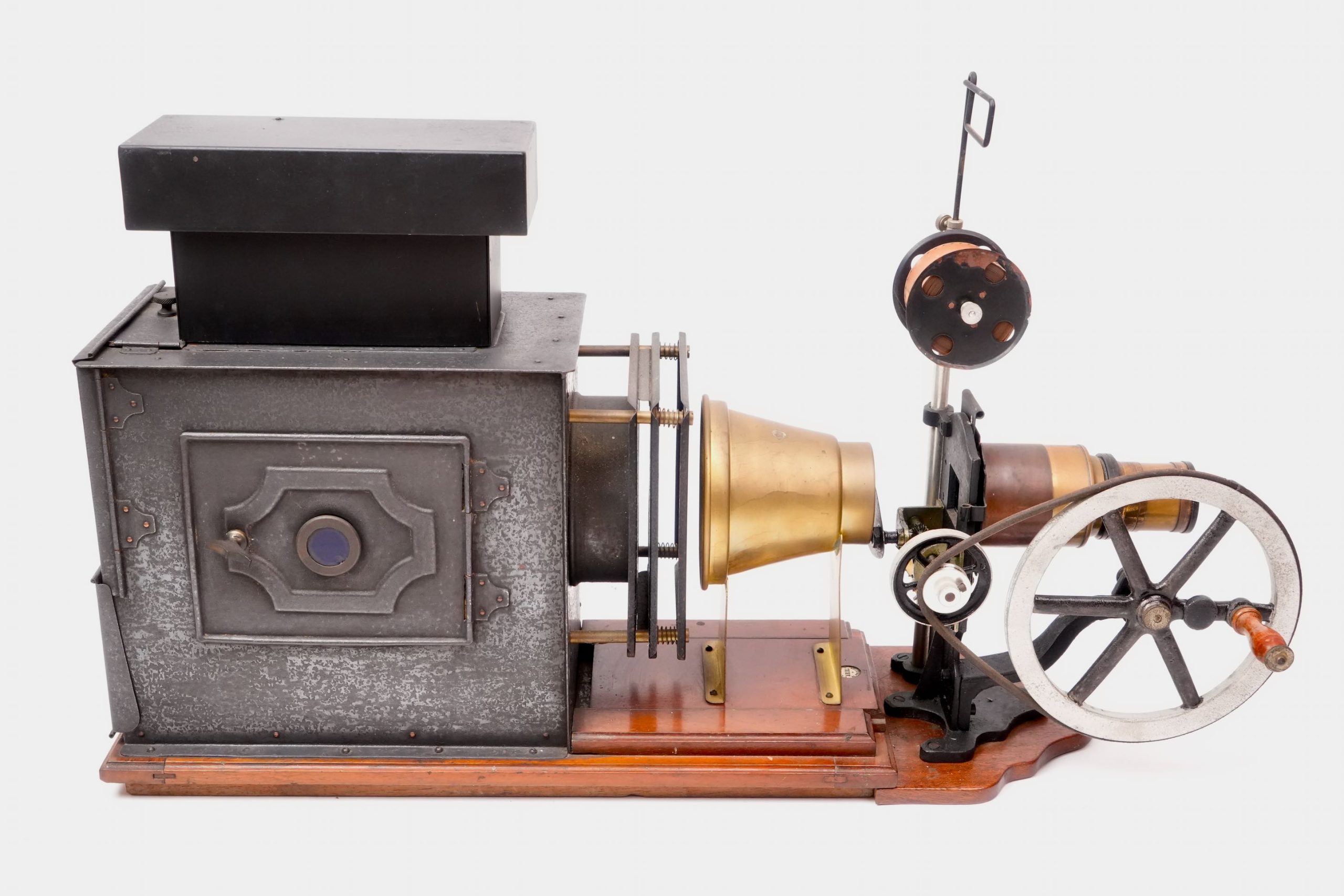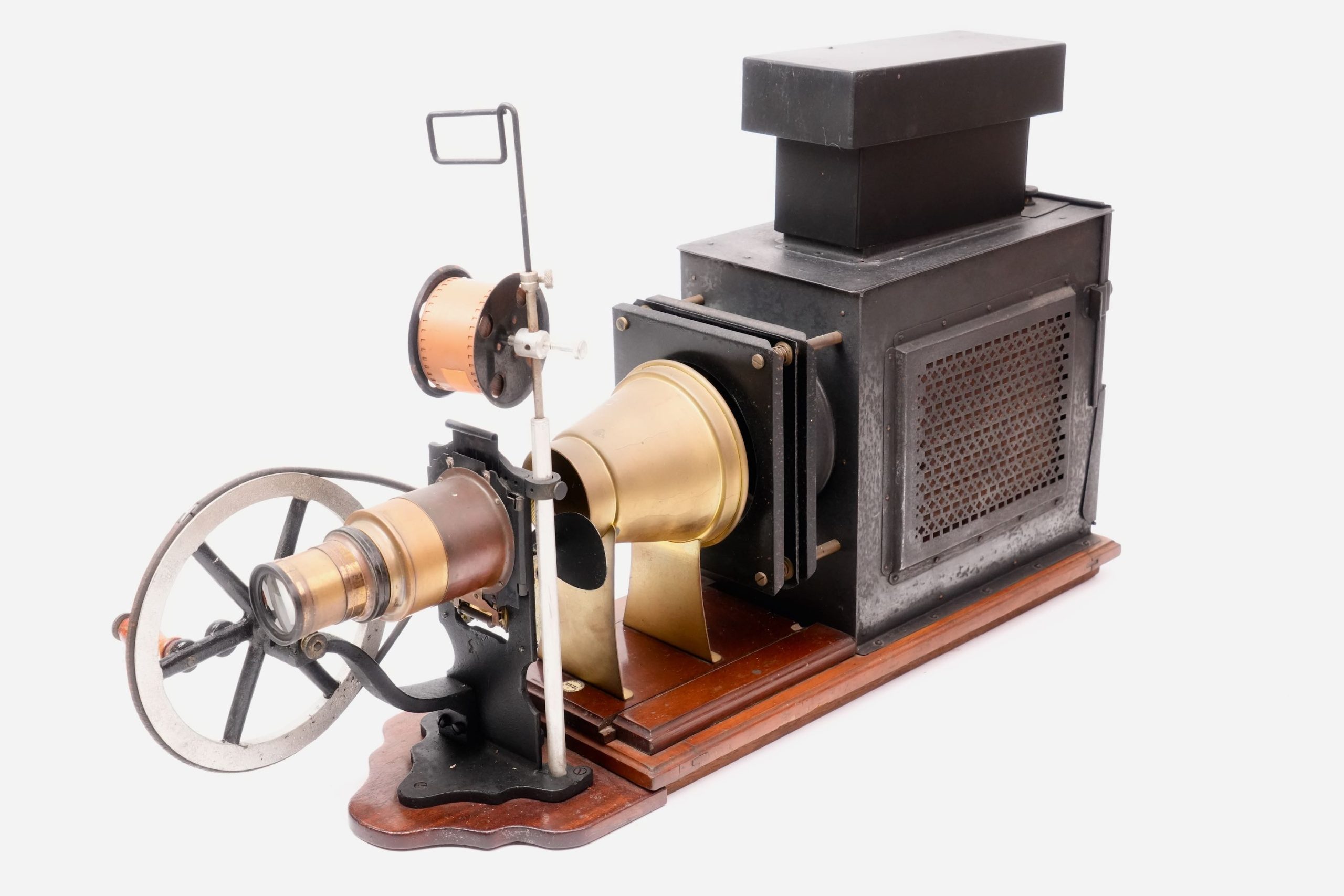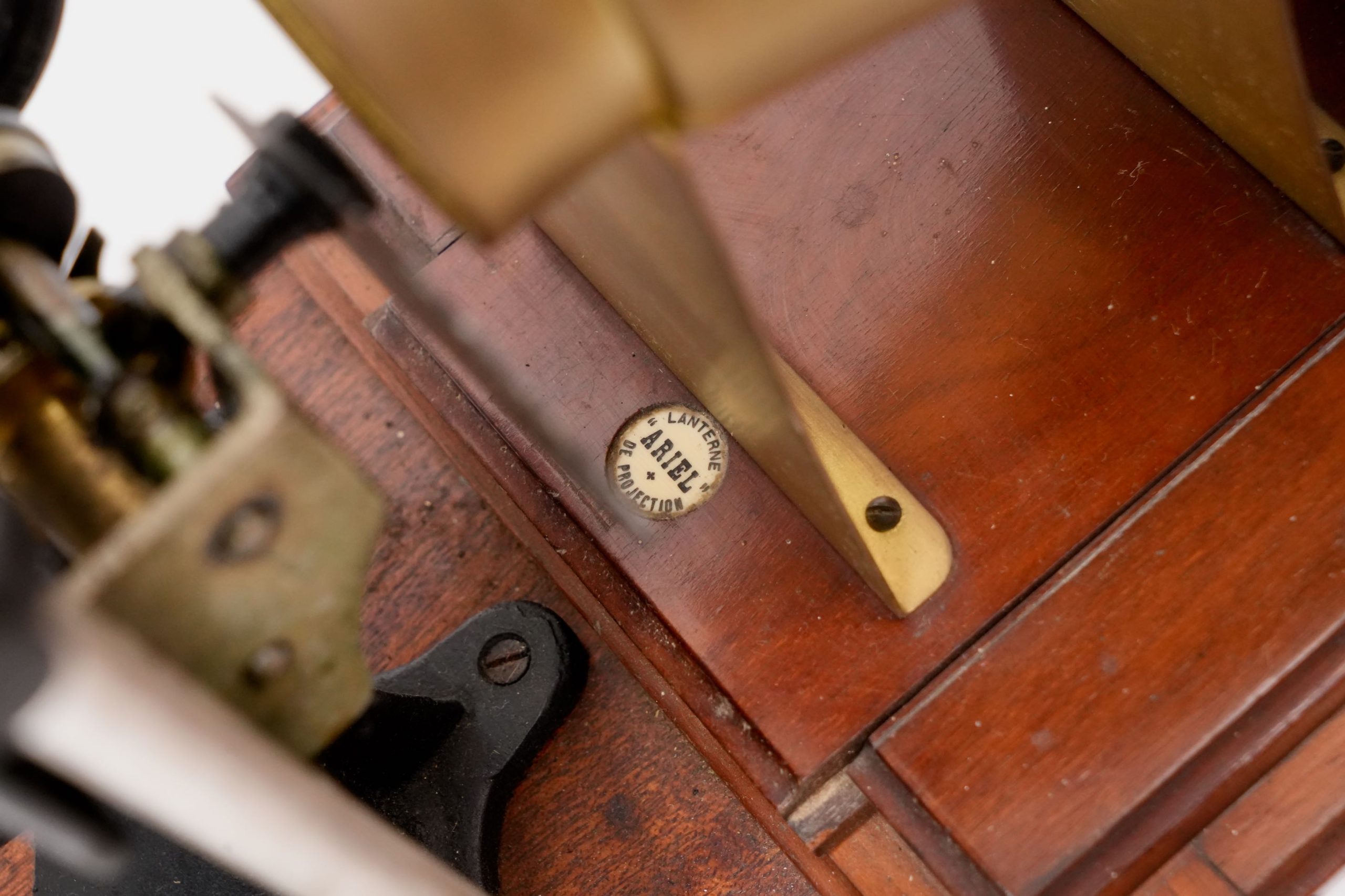 Lanterne de projection « Ariel » avec chrono 35 mm, vers 1905-1910. — Appareil de projection combinant une lanterne magique en tôle peinte et laiton, montée sur socle en bois verni, et un mécanisme de défilement pour film 35 mm entraîné par volant. Portant une pastille « Lanterne Ariel de projection », ce modèle illustre la période de transition entre la lanterne éducative et le projecteur cinématographique. La maison parisienne Ariel, active au début du XXᵉ siècle, se spécialisa dans les appareils d’optique et de démonstration scientifique, produisant des lanternes robustes et élégantes destinées à la projection d’images fixes ou animées. Témoignage du passage des projections fixes au cinéma naissant, cet exemplaire conserve l’ingéniosité mécanique et la finesse d’exécution caractéristiques des fabricants français de la Belle Époque.