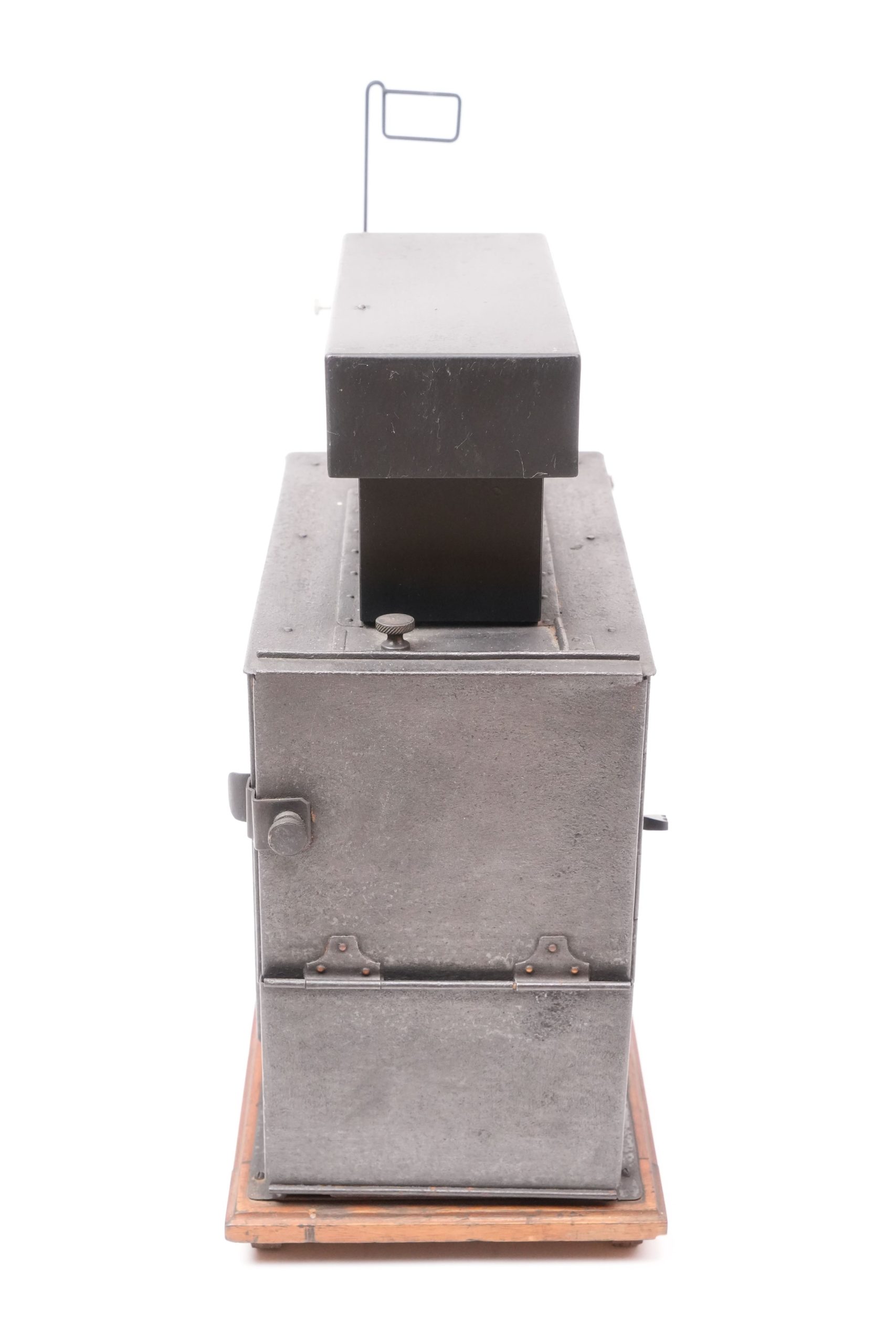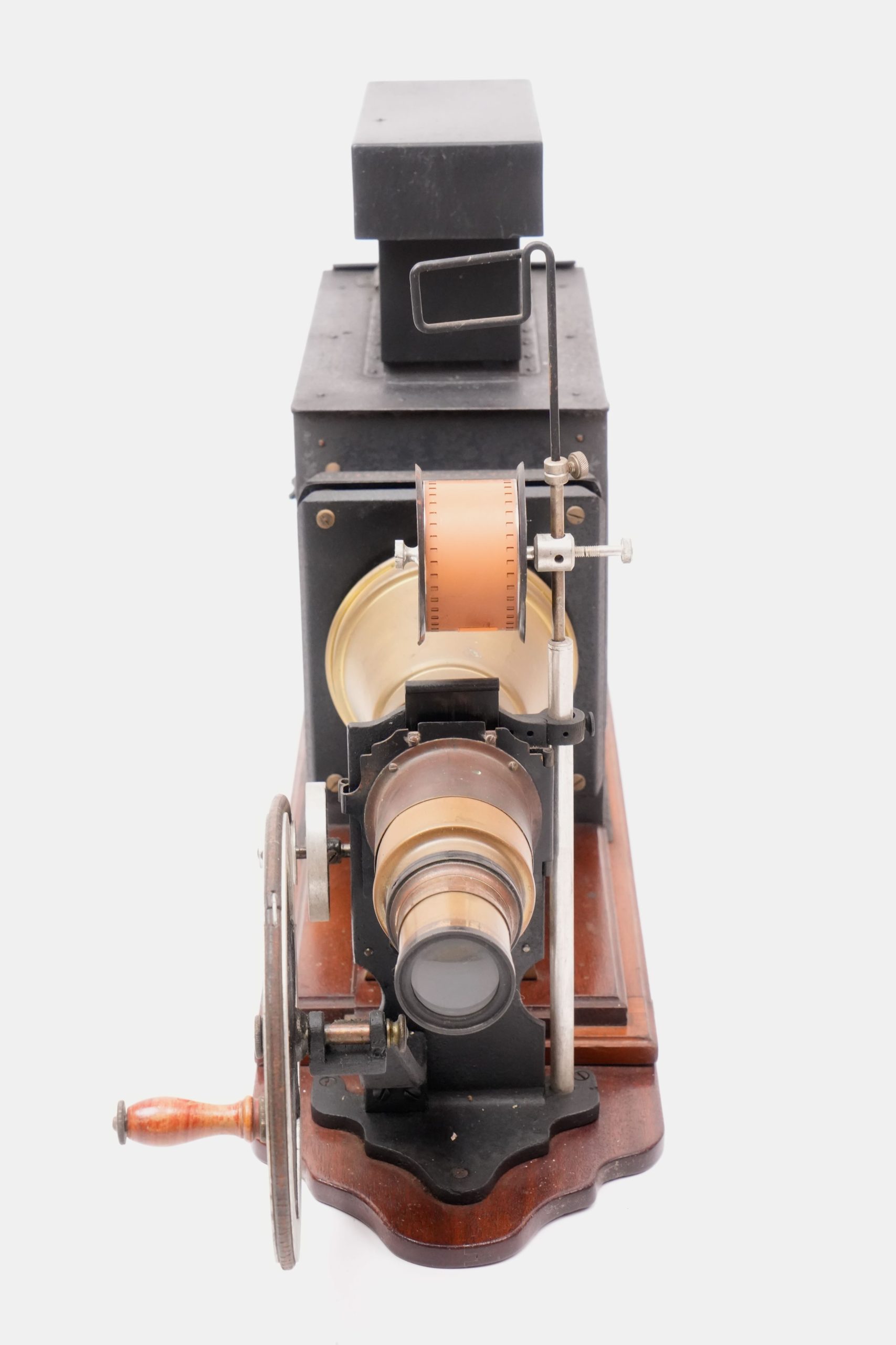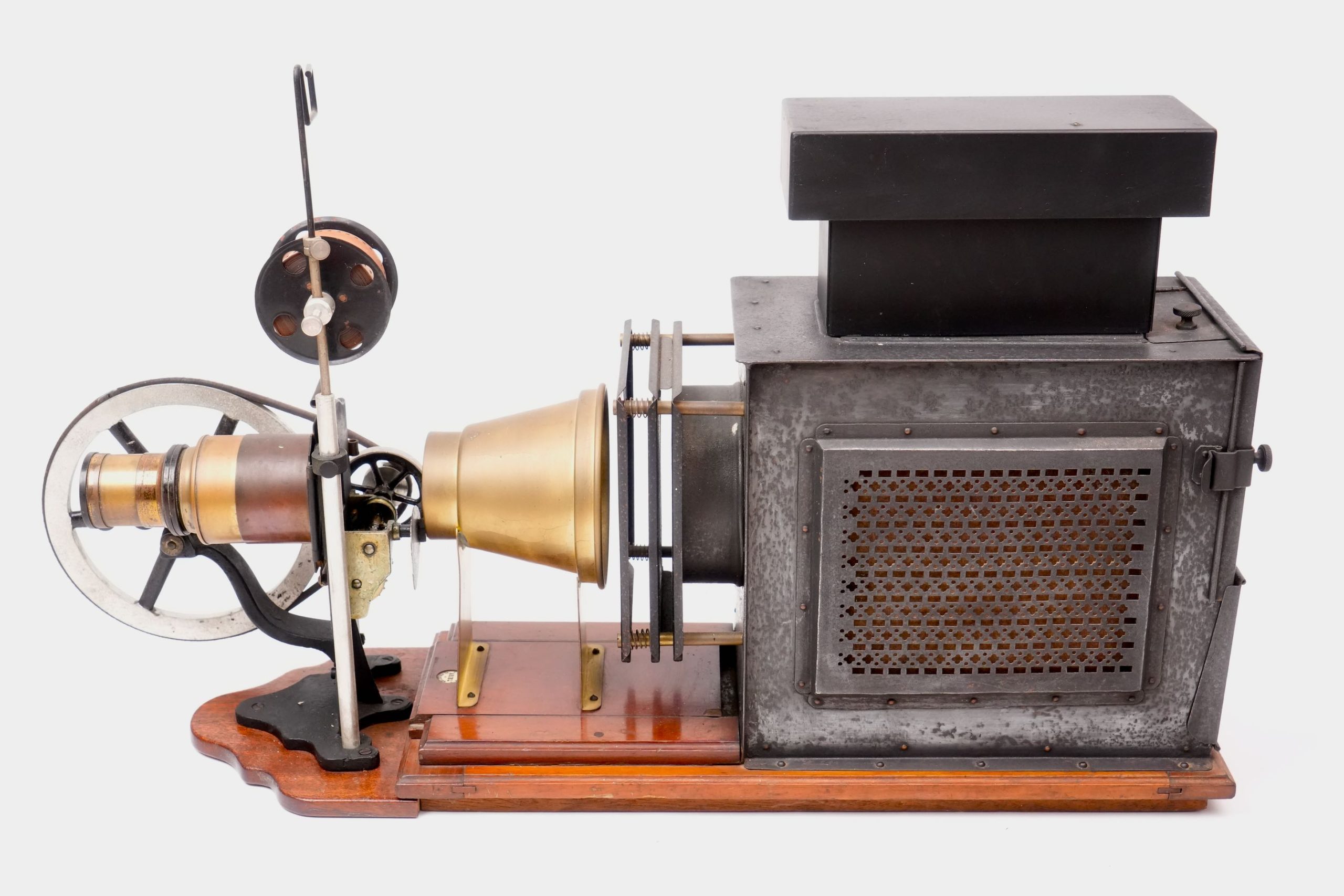 Lanterne de projection « Ariel » avec chrono 35 mm, vers 1905-1910. — Appareil de projection combinant une lanterne magique en tôle peinte et laiton, montée sur socle en bois verni, et un mécanisme de défilement pour film 35 mm entraîné par volant. Portant une pastille « Lanterne Ariel de projection », ce modèle illustre la période de transition entre la lanterne éducative et le projecteur cinématographique. La maison parisienne Ariel, active au début du XXᵉ siècle, se spécialisa dans les appareils d’optique et de démonstration scientifique, produisant des lanternes robustes et élégantes destinées à la projection d’images fixes ou animées. Témoignage du passage des projections fixes au cinéma naissant, cet exemplaire conserve l’ingéniosité mécanique et la finesse d’exécution caractéristiques des fabricants français de la Belle Époque.