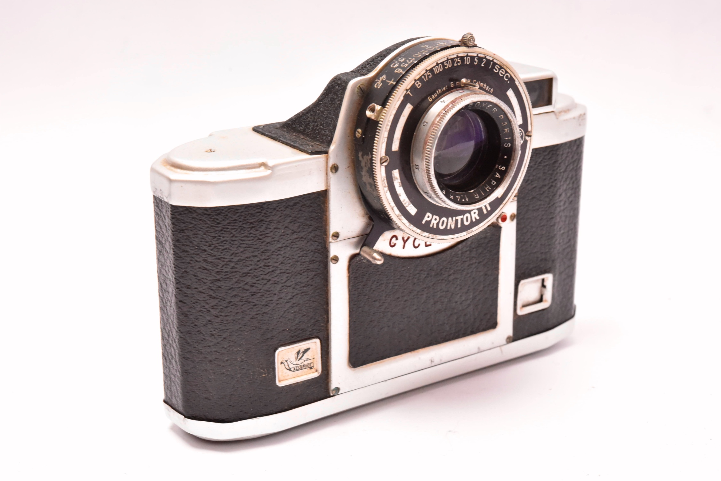 Lucien Dodin conçoit en 1949 l’appareil photographique Cyclope. Fabriqué par Alsaphot, il apparait sur le marché en 1951, comme révolutionnaire. De format 6x9, il est entièrement rigide. Bien que de faible épaisseur, sa focale est cependant de 105 mm. Ceci est du au fait que la lumière chemine dans la chambre en étant renvoyée par deux miroirs à 90°. Le groupe objectif/obturateur est placé en avant sur le haut de l’appareil, lui conférant cet aspect hors du commun. La lumière entrant par l’objectif est renvoyée par ces deux miroirs sur le film. Objectif Saphir Boyer 1 :4,5 F=105 mm, monté sur un obturateur Prontor II. Appareil en bel état, dans son étui « Alsaphot » d’origine.