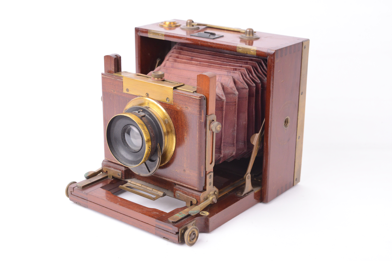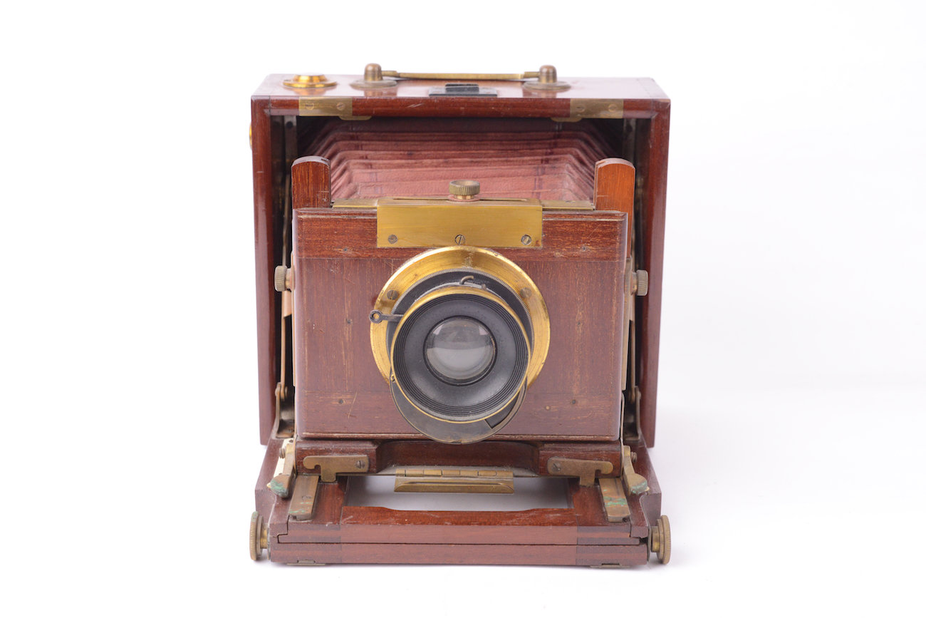 Chambre à abattant attribuée au fabricant français Mackenstein. Fabrication en acajou, laiton et cuir, assemblage en queue d'aronde. Pliée, la chambre mesure 17 cm de largeur, 15 cm de hauteur et 8 cm de profondeur. Objectif Darlot Planigraphe N°2, de 175mm de focale et d'ouverture f/9, monté sur un obturateur rotatif à deux vitesses. Bel état, l'obturateur déclenche.
