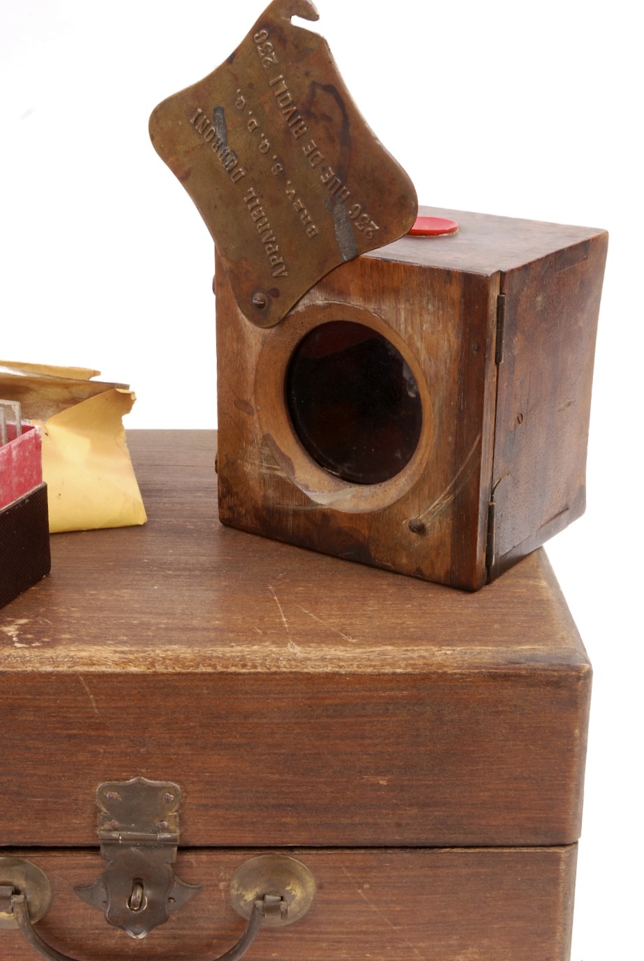 Le Photographe de poche Dubroni. France. 1865. Rare coffret Dubroni n°1B, complet. Fabriquant français G.J.Bourdin. Ensemble avec toutes ses bouteilles avec bouchons d’origine, pipettes, châssis à tirer les épreuves, boîte à plaques. Etat d’origine exceptionnel. Plus de renseignements sur demande.