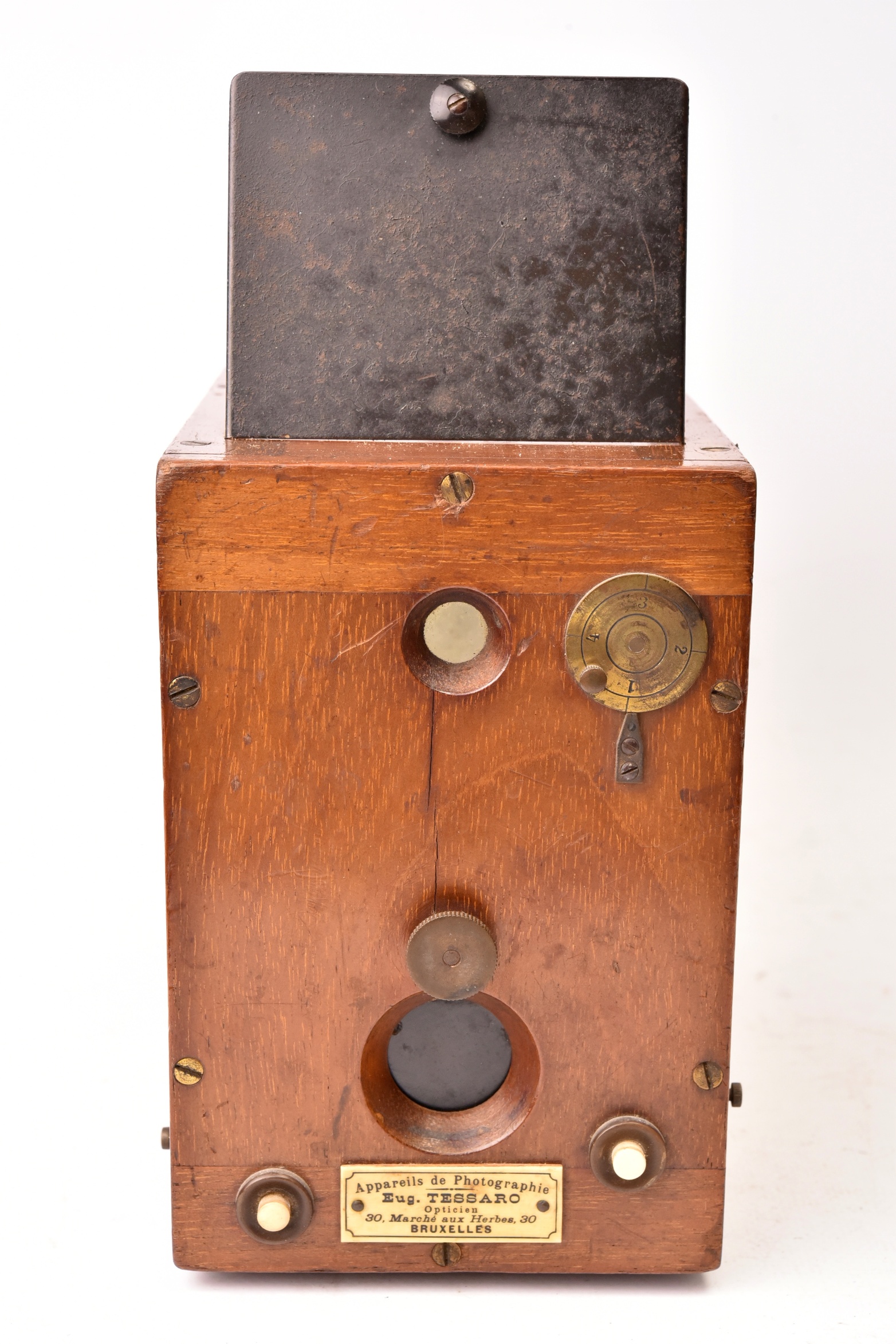 Appareil photographique Dr. Krügener Simplex Reflex. L’un des premiers de type Twin Lens Reflex ; c'est-à-dire possédant deux objectifs. L’un sert à la prise de vue et l’autre à la visée réflex sur cadre à verre dépoli. Ce dernier, protégé par un volet métallique pivotant, est du même format que les plaques utilisées (6x8 cm). L’appareil peut recevoir jusqu’à 24 plaques dans son compartiment chargeur. Le changement de plaques s’effectue par bouton à tirette situé sur le dessus. Construction en acajou blond verni, N° de série 2029. Sur la façade, est apposée la plaque du revendeur : « Eugène Tessaro, 30 rue Marché aux Herbes, à Bruxelles ». Vers 1888. L’appareil marque une évolution en matière de détective ; il est peu commun.
