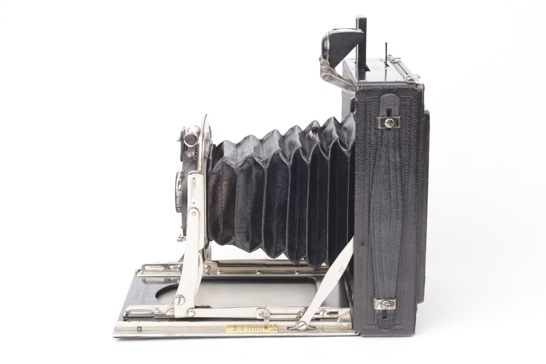 Folding Ernemann Heag XV modèle I, vers 1908. Appareil folding vertical à plaques de format 9x12 cm. Corps tout en aluminium de très faible épaisseur, gainé maroquin. Soufflet pyramidal en cuir noir. Obturateur central, vitesses allant de la seconde au 1/100ème, poses. Objectif Carl Zeiss Iéna 1 : 6,3 – F=136 mm. Décentrements horizontal et vertical. Très bel état cosmétique et mécanisme parfaitement fonctionnel. Le viseur clair de type Newton se replie automatiquement lorsque l'appareil est refermé. Très bel état.