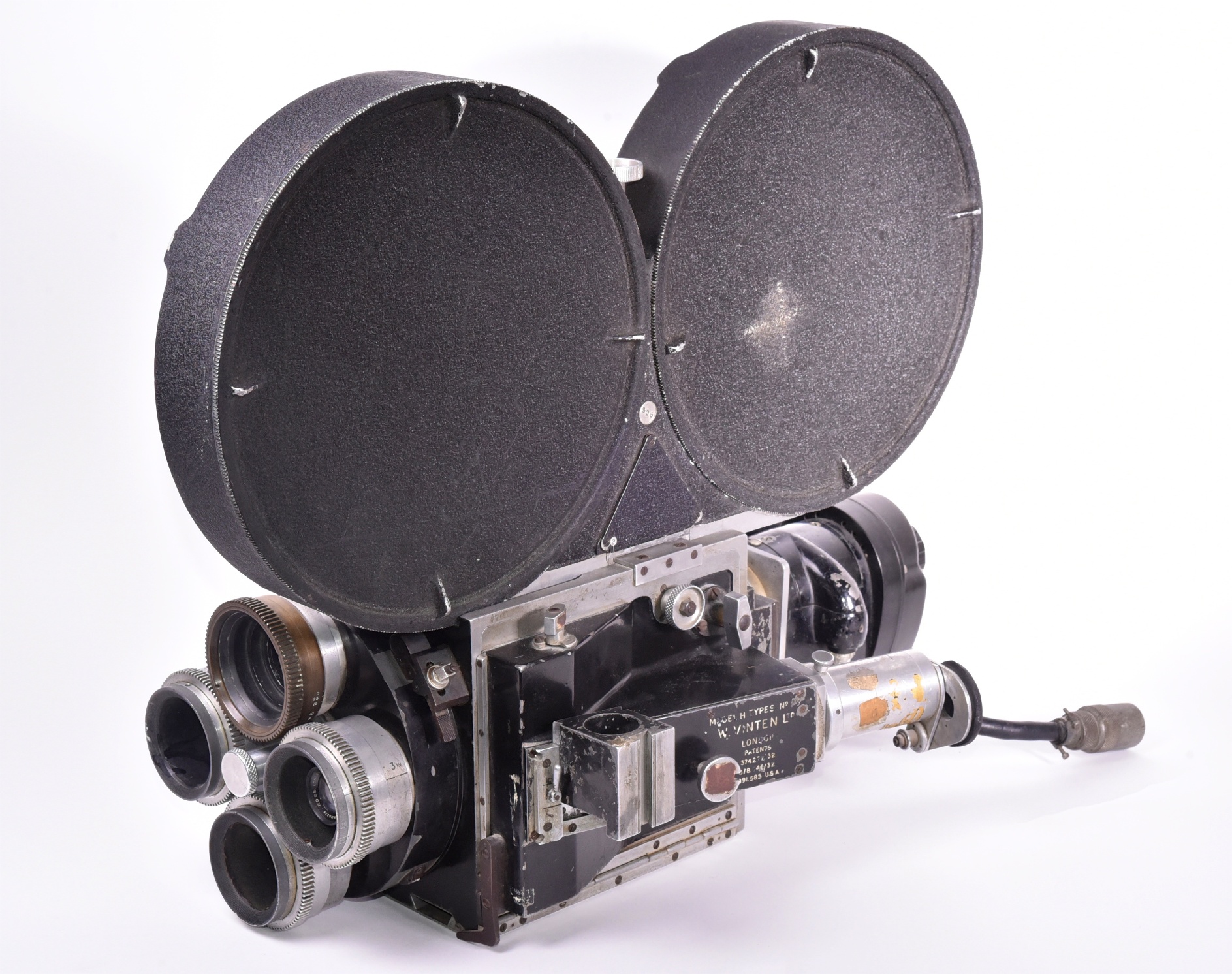 Cine camera 35 mm W. Vinten Ltd. Model H. Cette caméra a fait l’objet de brevets déposés par William Vinten en 1931 en Angleterre et aux USA. Le modèle proposé possède une tourelle à quatre objectifs et un magasin à bobines double. Très petit numéro de série 29. Aucunes informations n’apparaissent sur cette caméra, si ce n’est son caractère de rareté.