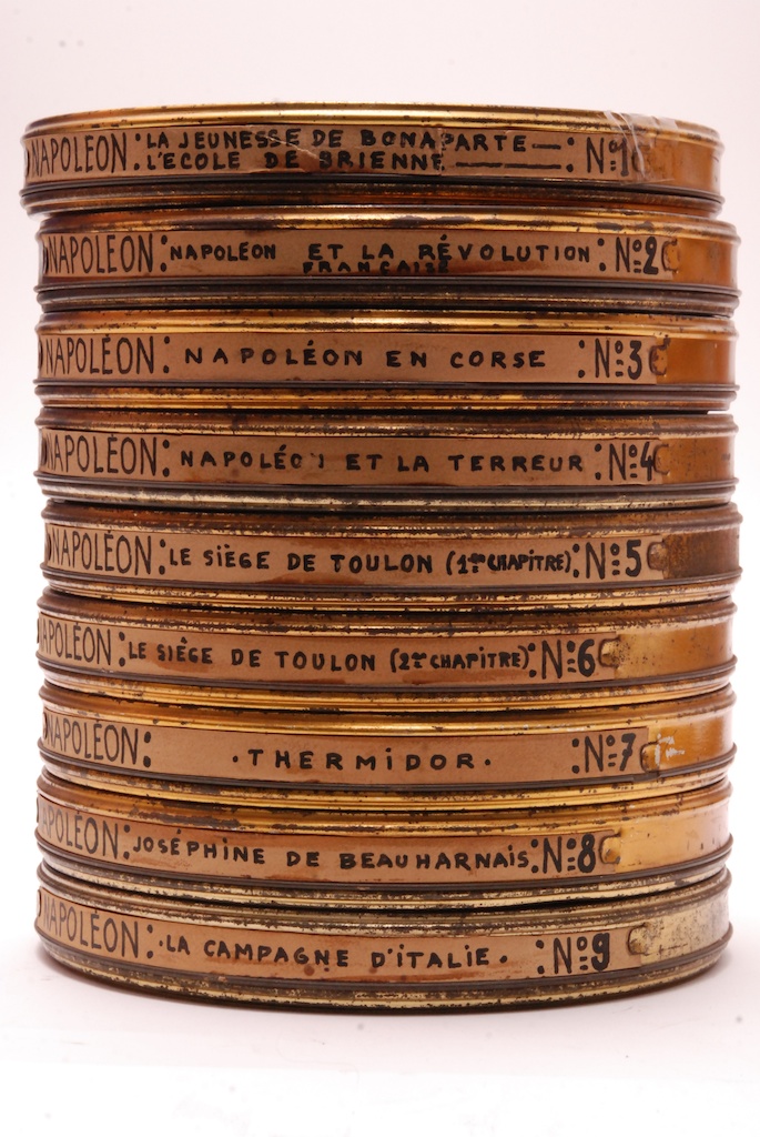 Napoléon d'Abel Gance. Ce film historique et mythique est réalisé par Abel Gance ; il est sorti initialement en 1927. La version que nous présentons a été éditée au format 9,5 du Pathé-Baby (diamètre  des boites de bobines de film 7  cm). Il s'agit d'un ensemble rare, complet et composé de neuf bobines, toutes numérotées et renseignées : N°1 La Jeunesse de Bonaparte, l'Ecole de Brienne - N°2 Napoléon et la révolution française - N°3 Napoléon en Corse - N°4 Napoléon et la Terreur - N°5 Le siège de Toulon (1er chapitre) - N°6 Le siège de Toulon (2ème chapitre) - N°7 Thermidor - N°8 Joséphine de Beauharnais - N°9 La Campagne d'Italie. Excellent état de conservation.