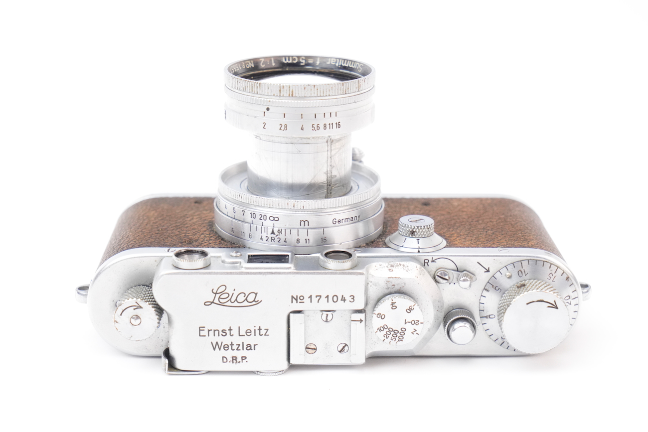 Exemplaire chromé avec gainage marron en bel état. Le numéro de série n°171043 indique que sa fabrication date de 1935. L'appareil s'arme et déclenche convenablement. Les vitesses sont plutôt justes. Le viseur de cadre est relativement clair, on note une légère brume. Idem pour le viseur télémétrique dont l'image est faiblement contrastée. L'objectif Summitar date de 1950 est en état moyen. Hormis une légère brume et quelques traces de champignon il comporte des rayures sur le fût. Il manque une vis de serrage qui semble compromettre le rangement et la mise au point. À noter que la semelle du boîtier comporte une gravure du revendeur brésilien de l'appareil : "Lutz, Ferrando & Cie. Ltda. Rio de Janeiro Sao Paulo".