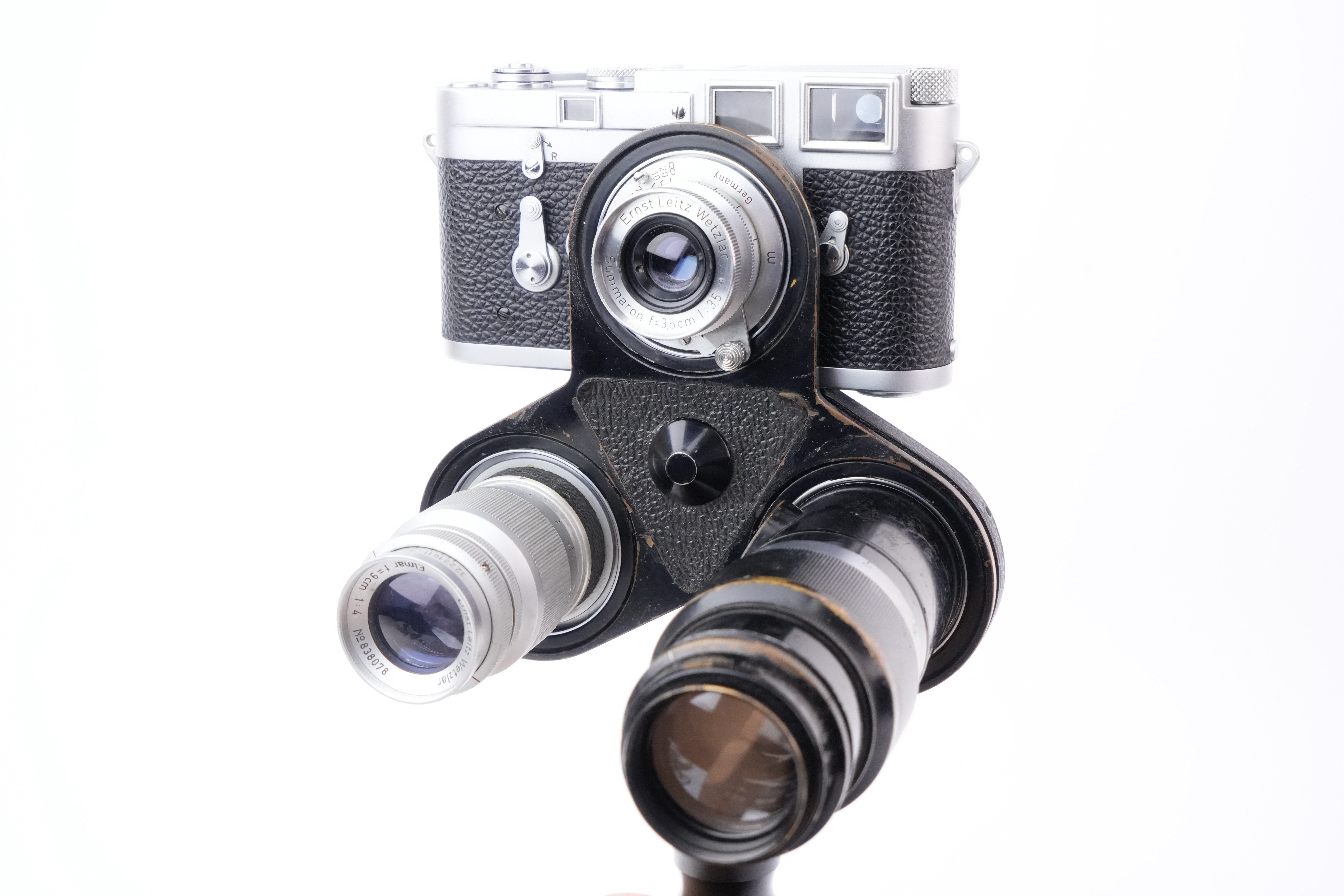 Tourelle à trois objectifs OROLF Leica. Très rare accessoire. Cet accessoire permettais de monter trois objectifs en monture M39 sur un Leica M2 ou M3. Les différentes bagues permettais des monter des objectifs 20-35mm, 50mm et 90mm pour le Leica M2 et 28-50mm, 90mm et 135mm pour le Leica M3. Accessoire très rare, seulement 250 exemplaires ont été fabriqué sur une unique année en 1960. Fonctionnement assez simple, on tourne la vis arrière vers la droite pour débloquer l'objectif et enclencher la rotation des objectifs et choisir celui désiré, on tourne a gauche pour ramener l'objectif vers le boitier et bloquer l'objectif. (L'appareil photographique et les objectifs en photo servent d'illustration et ne sont pas compris dans l'ensemble)