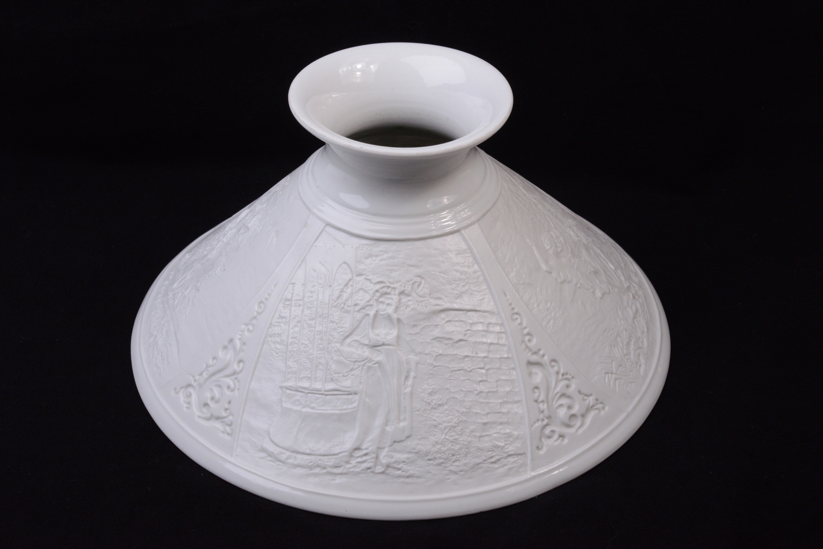 Ce bel abat-jour est une Lithophanie réalisée sur porcelaine suivant le procédé breveté par Herrmann et Laurent. La fabrication de notre exemplaire est allemande (estampé : « Germany 43 – 41 »).  Sur cet abat-jour, sont représentées quatre scènes de vie champêtre au XIXème siècle.  Diamètre 27,5 cm. Bel état.