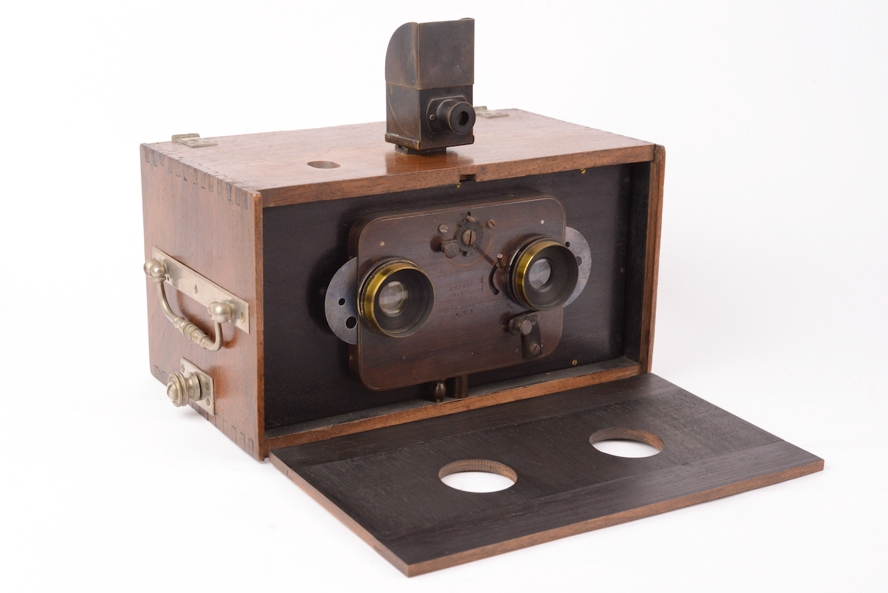 Rare appareil photographique box stéréoscopique français. Vers 1895. Format 9x18 cm. Belle ébénisterie en noyer avec assemblages par tenons et mortaises. Mise au point par déplacement de la platine avant à l’intérieur du coffrage à l’aide d’un bouton extérieur. Objectifs montés sur un double obturateur Turiault muni de diaphragmes à tourelles. Viseur réflex de poitrine à capuchon. Cadre intérieur portant verre dépoli. Poignée de transport en cuivre nickelé sur l’un des côtés. Ne semble pas figurer dans la documentation connue.