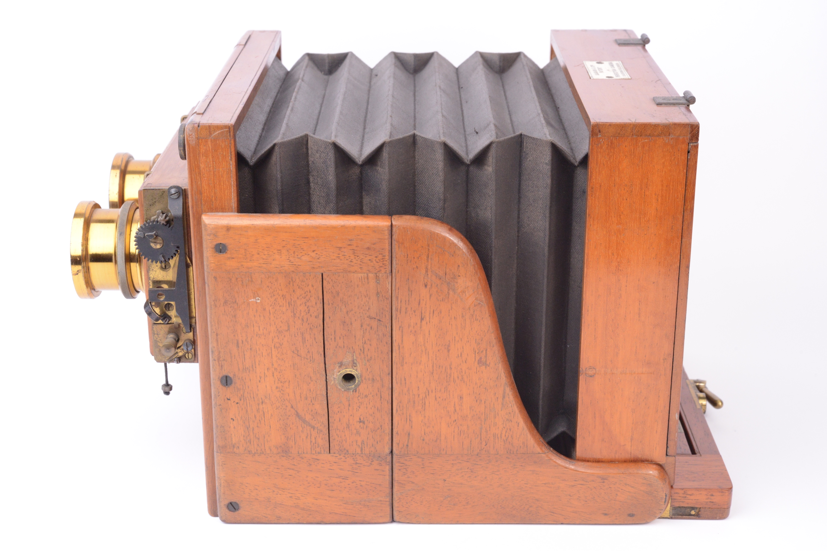 Marion & Co. Perfection Camera Chambre photographique stéréoscopique. Format 13x18 cm. Belle fabrication anglaise en acajou avec joue latérale. Assemblages par fines queues d’aronde. Soufflet en tissu noir à coins non rabattus. Mise au point par déplacement du corps arrière à l’aide d’une manivelle agissant sur une vis sans fin. Cadre pivotant portant verre dépoli. Obturateur stéréo à rideau de type Thornton-Pickard. Paire d’objectifs Thornton-Pickard – Beck Symetrical avec diaphragmes iris. Décentrement vertical de la platine avant. Présence d’un châssis double avec volet semi-articulé. Fin XIXème siècle.