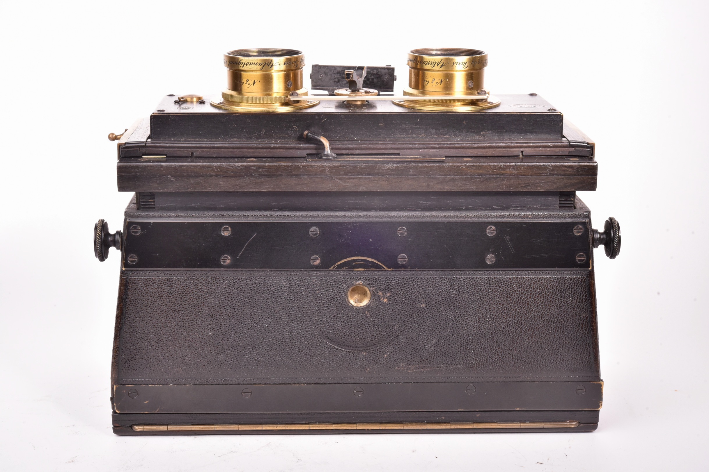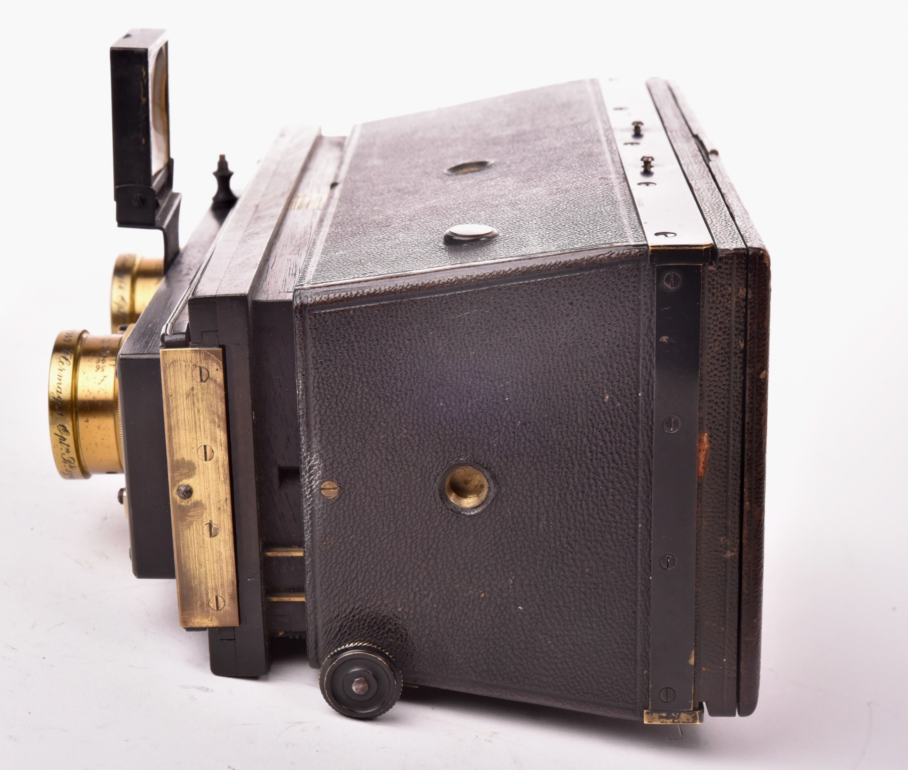 Stereo Camera Caillon. Appareil de type jumelle de format 8,5 x 17 cm. Fabrication en bois gainé maroquin, vers 1900. Obturateur de type guillotine à vitesses variables plus la pose. Objectifs Hermagis Aplanastigmat 1 :6,8 – F=125 mm. Diaphragmes à iris couplés. Mise au point par molette agissant sur crémaillère permettant au corps avant de se mouvoir. Décentrement vertical possible. Viseur de type Newton réticulé. Bel état et peu courant dans ce format.