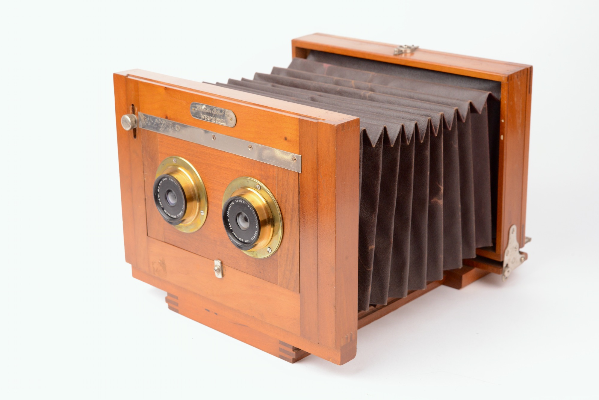 Rochester Optical Co. New model Folding stereo camera. Format 13x18 cm. vers 1895. Construction en bois verni, assemblage de l’ébénisterie par tenons et mortaises. Soufflet rectangulaire brun à coins non rabattus. Cadre pivotant à l’arrière portant verre dépoli. Mise au point par déplacement du corps arrière à l’aide d’un bouton agissant sur pignon et crémaillère. Objectifs SOM Berthiot Périgraphe 1 :14 – F=90. Diaphragmes à tourelles. Bel état.