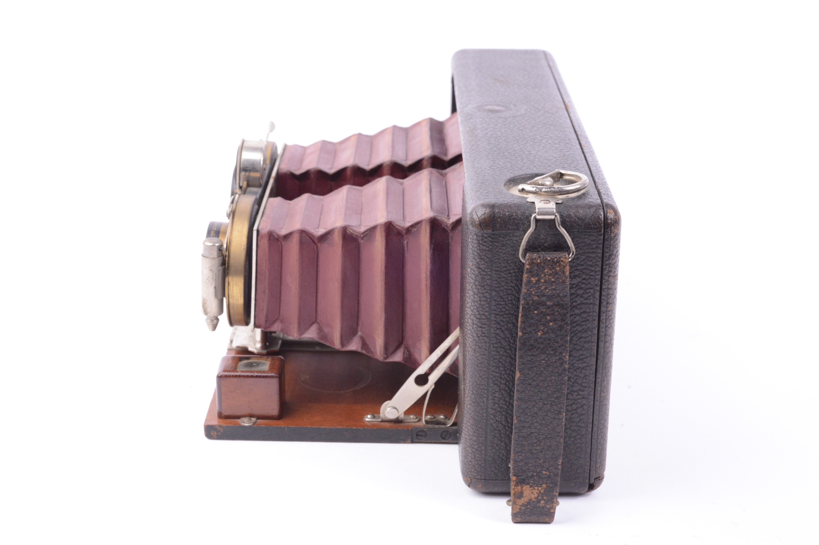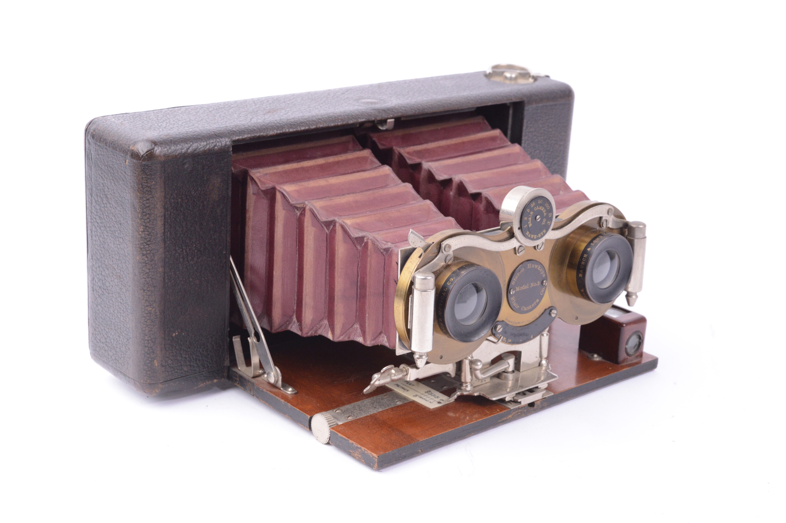Stereo Hawkeye model N°2 Blair Camera Company fabriqué de 1904 à 1907. Fournit des Stéréotypes composés de deux images 8,5x8,5 cm. Le corps de l’appareil et l’abattant sont en acajou, gainé extérieurement. L’obturateur est en laiton verni et les autres parties métalliques sont nickelées. Numéro de série 5575. L’appareil est muni de deux soufflets en cuir bordeaux. Objectifs Bausch & Lomb Rapid Rectilinear montés sur obturateur Automat Bausch & Lomb (poses B et T et instantané avec six vitesses allant du 1/100e de seconde à la seconde). Viseur clair réflex. Décentrement vertical par clé papillon. Mise au point par bouton agissant sur crémaillère. Bobine en bois à l’intérieur. Bel état général et fonctionnel.