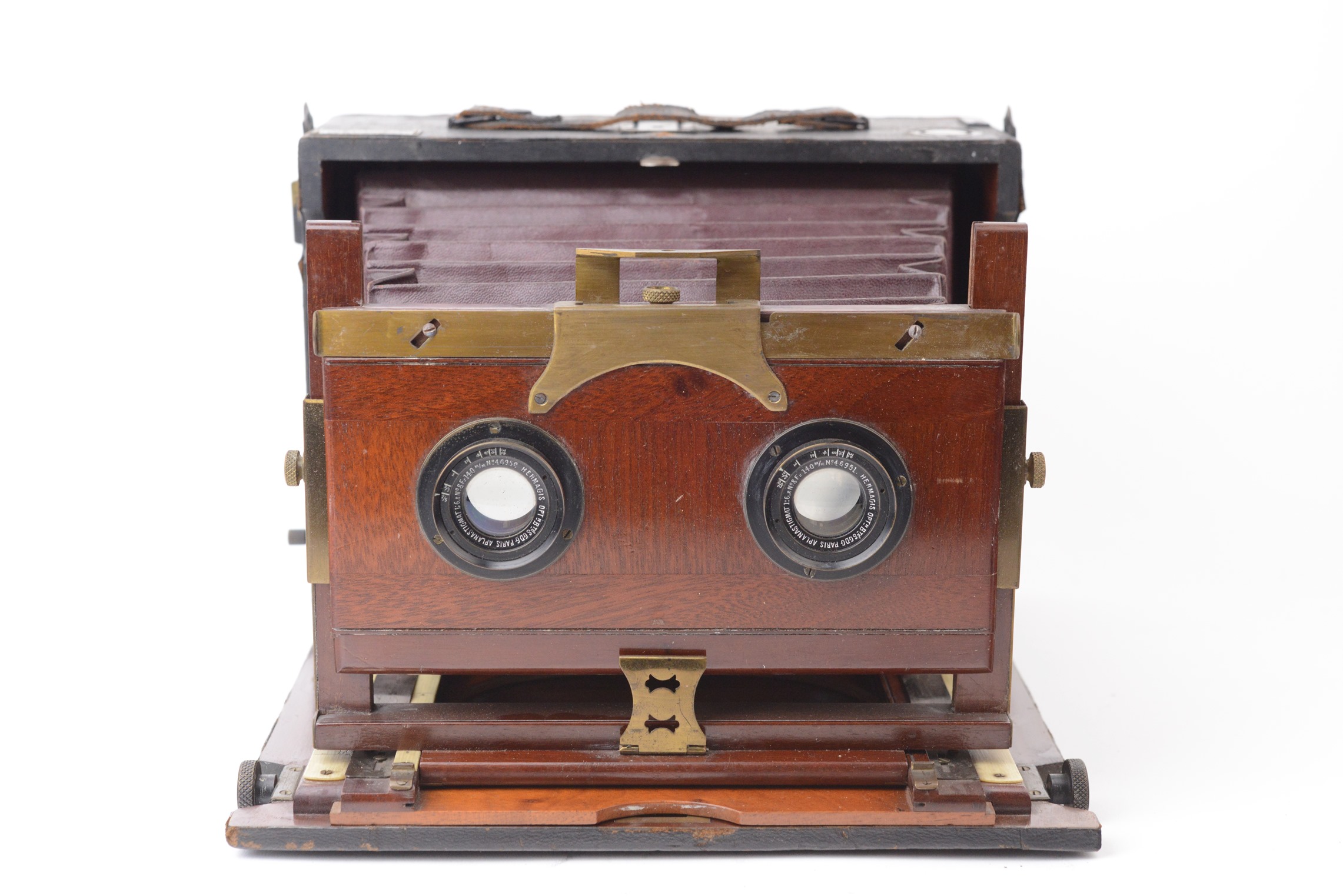 « Stereomultiple » Hermagis. Appareil panoramique et stéréoscopique. Plaque portant mentions : « Appareils photographiques Hermagis – 18, rue Rambuteau – paris ». Format 13x18 cm. Vers 1902. Chambre de type coffret en acajou verni intérieurement et gainée maroquin extérieurement. Soufflet en cuir bordeaux. Obturateur de plaque focal à ouverture de fente variable. Vitesses allant du ½ seconde au 1/1000ème. Objectifs Hermagis Aplanastigmats1 : 6,8 – F=140 mm. Bel état d’usage.