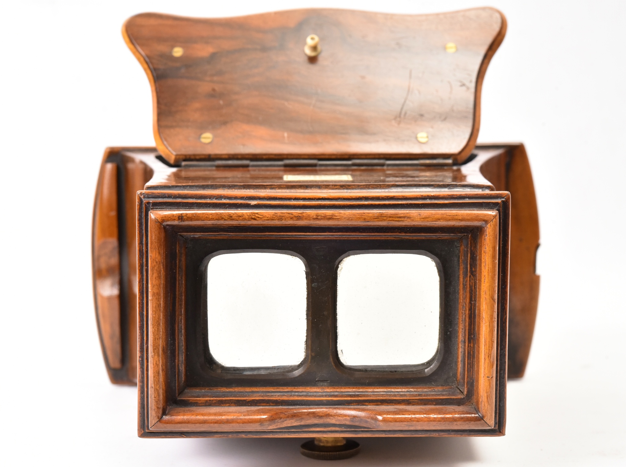 Stéréoscope Murray & Heate London. Il porte les inscriptions : "Murray & Heate 43 Piccadily London Reg Feb 1858". Mise au point avec tiroir mû par molette et crémaillère. Cadre de vision travaillé muni d'oculaires prismatiques. Volet pivotant portant un miroir à papier argenté pour vues sur papier. Très belle ébénisterie en ronce de noyer. Belle réalisation typiquement anglaise, soignée, avec assemblage renforcé par vis alignées et surfacées.