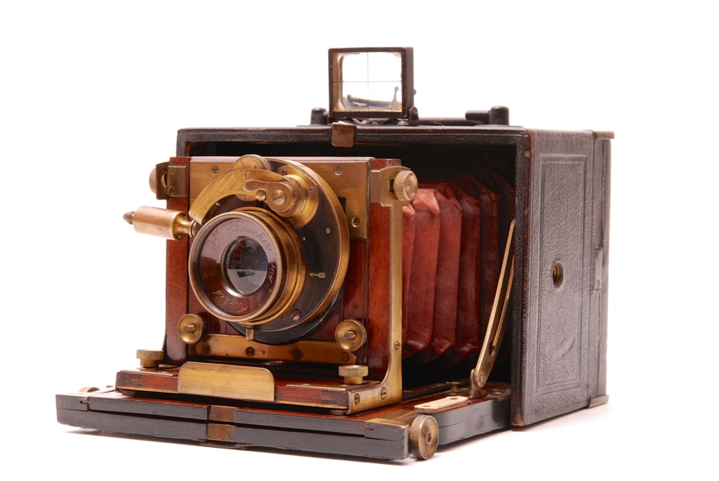 Cette petite chambre coffret Boucher est construite tout en acajou gainé cuir avec soufflet en cuir rouge. Elle possède les décentrements dans les deux sens et la bascule de la platine avant. L'obturateur est de type circulaire à secteurs en laiton. Déclenchement pneumatique. Objectif signé "P. Boucher Ingénieur à Paris". Vers 1900.