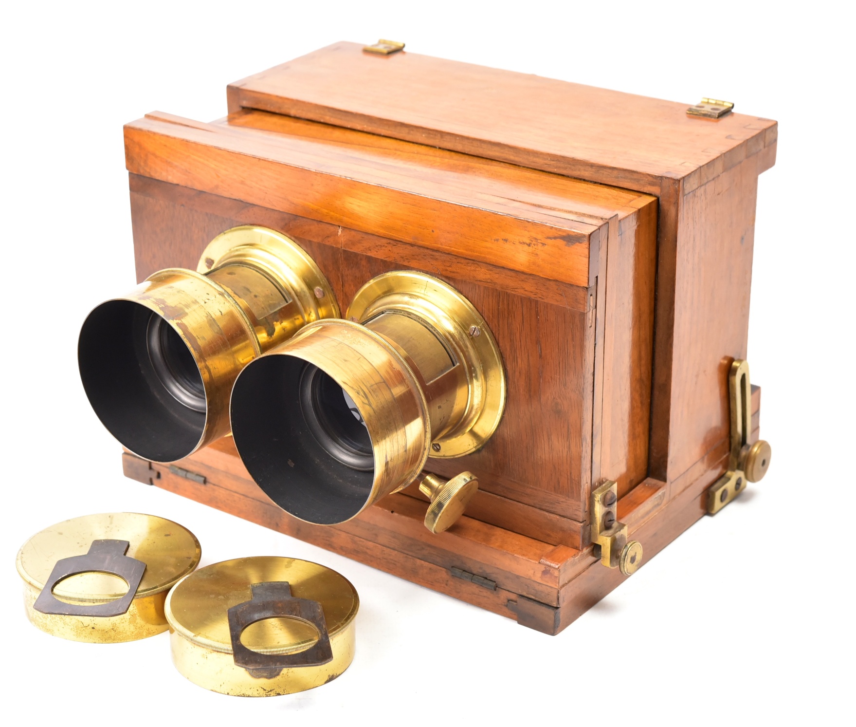 Cette chambre à tiroir stéréoscopique ne comporte aucune mention particulière. Elle est de très belle facture, en bois de vieux noyer poli et verni au tampon. Elle est dotée d’un système à bascule réglable par bouton à molette peu courant sur ce type de chambre. Cette dernière est dotée d’une paire d’objectifs de type Petzval équipés de gros parasoleils avec leur bouchon. Chaque objectif reçoit un diaphragme à vanne s’insérant par une fente pratiquée au niveau de son centre optique. Très bel et rare appareil situé vers 1860.