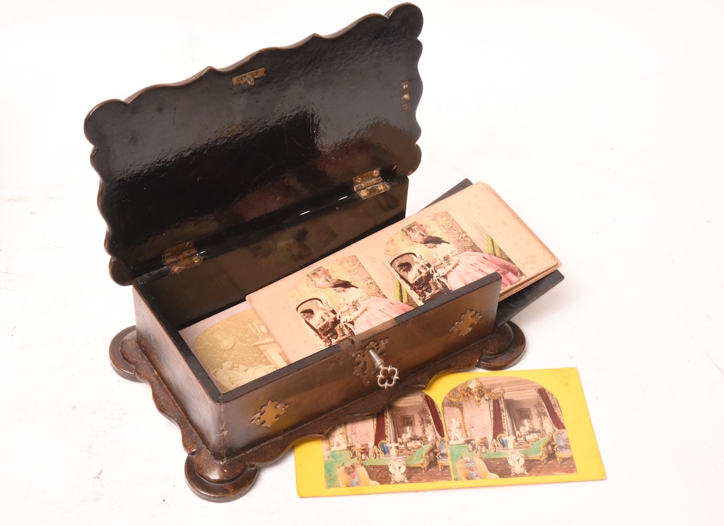 Beau coffret de rangement en papier mâché pour positifs stéréoscopiques 9x18. Il est ornementé de motifs en cuivre patiné et il est laqué noir intérieurement. Fermeture à clef. Vers 1880.