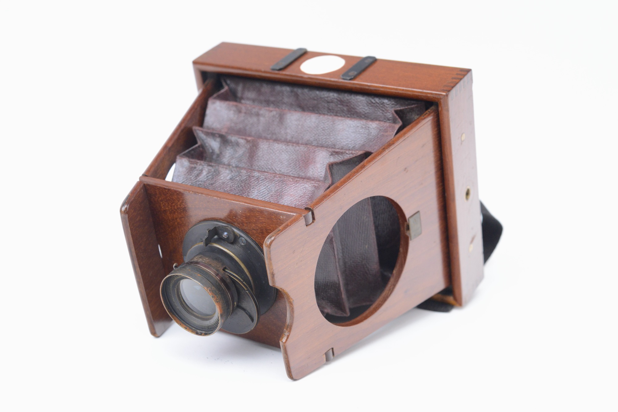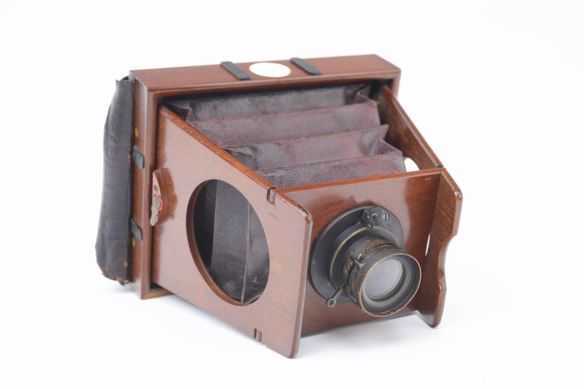 Darlot Chambre photographique à Joues 9 x 12 cm. Construction en acajou verni, avec soufflet en cuir bordeaux. Obturateur de type rotatif à éclipse. Cadre amovible recevant le verre dépoli protégé par un volet détachable. Vers 1895.
