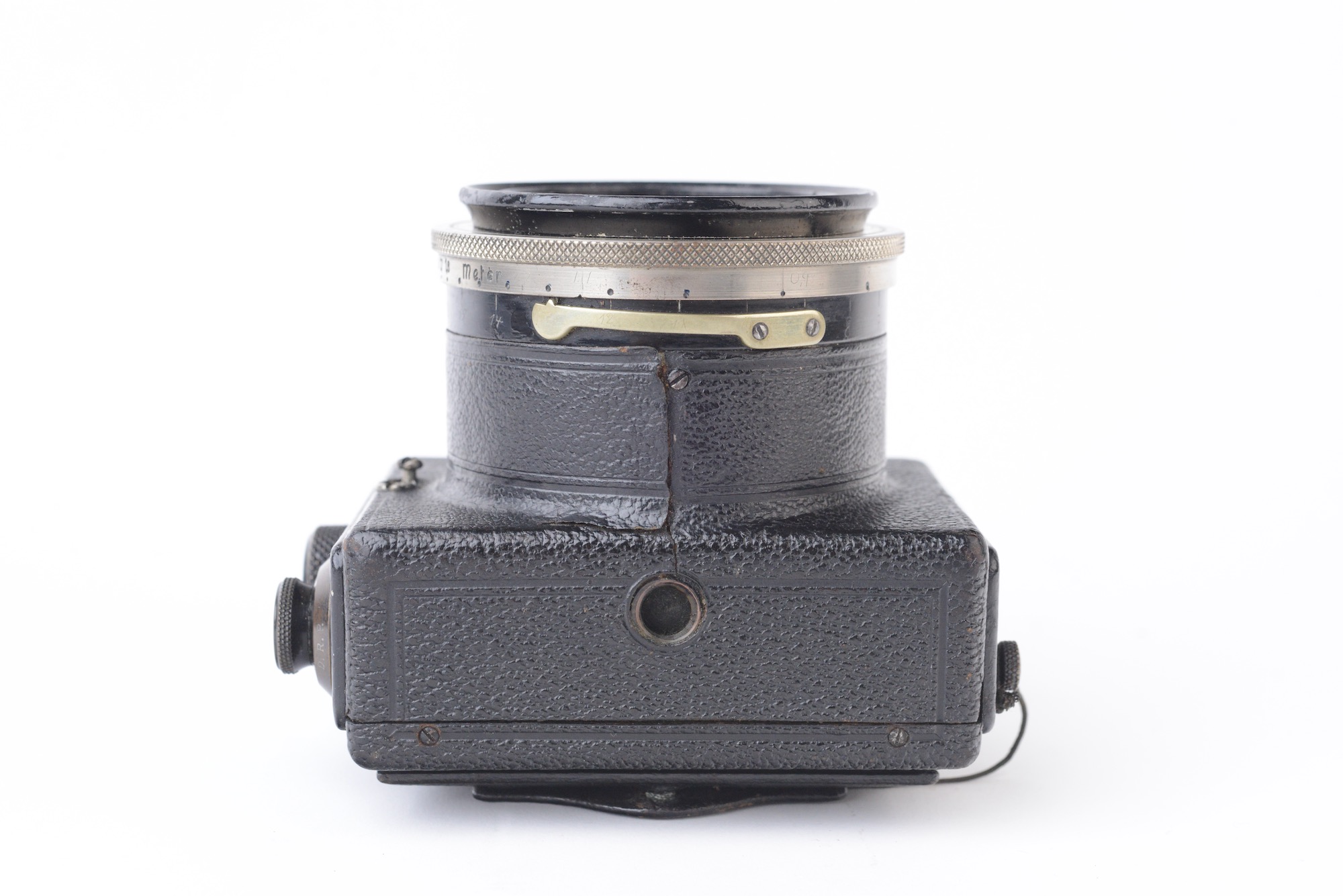 Ernemann – Ermanox 4,5×6. Cet appareil est fabriqué par Ernemann à Dresde dès 1924. Il permet enfin de réaliser des instantanés dans un environnement peu éclairé. Cela est rendu possible, non seulement grâce à son obturateur focal à rideau pouvant aller jusqu’au 1/1000° mais surtout grâce à la luminosité exceptionnelle de son optique Ernemann Anastigmat Ernostar de 10 cm ouvrant à 1 : 2. La visée s’effectue par viseur de type Newton, protégé par capuchon relevant et démasquant une table de réglage des vitesses. La mise au point s’effectue par large vis hélicoïdale. Présence du dos portant verre dépoli avec capuchon.  Numéro de série 1185294. Obturateur présent mais nécessite une réparation.