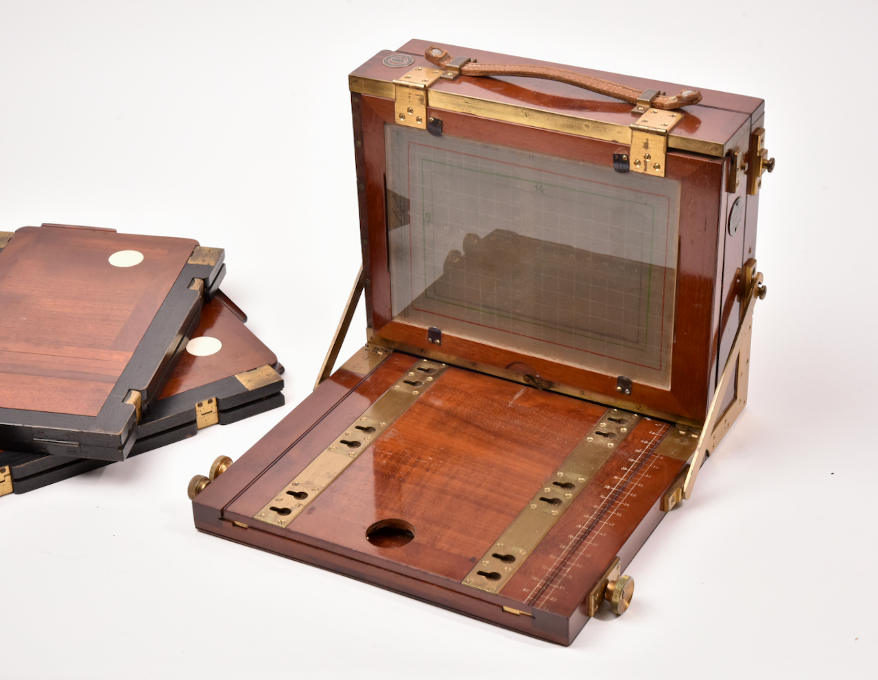 Folding camera Mackenstein Suffize & Molitor, 15 rue des Carmes Paris. Vers 1925. Format 13x18. Très belle construction en vieil acajou avec parties métalliques en laiton verni. Soufflet en cuir de couleur bordeaux à coins rabattus. Deux décentrements avant. Objectif Olor Berthiot F:6,8 F=170. Dos à cadre porte dépoli quadrillé pivotant sur charnières. Queue à abattant avec échelle graduée pour la mise au point du corps arrière. Deux châssis doubles semi rigides. Bel état.