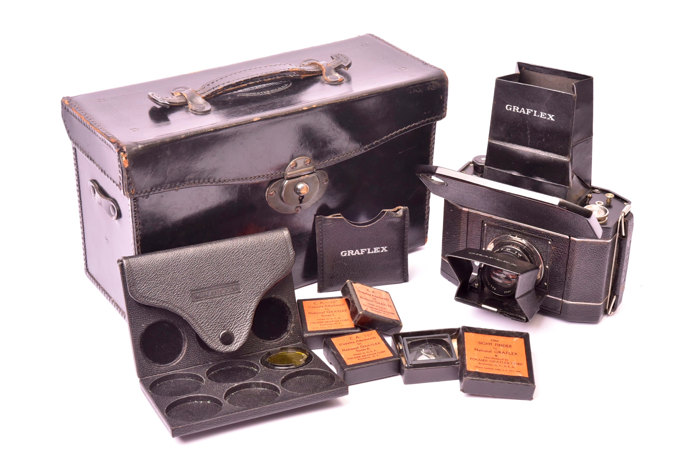 National Graflex Series II par Folmer Graflex Corporation. Modèle « Series II » entre 1934 et 1941. Appareil réflex mono-objectif. Visée sur dépoli protégé par capuchon dépliable. L’appareil peut prendre 10 vues 2 ¼ x 2 ½ inches sur film 120. L’obturateur focal peut aller jusqu’au 1/500ème de seconde. L’appareil vient dans sa valisette de transport d’origine ; il est accompagné d’accessoires (pochette contenant trois paires de filtres, bonnettes additionnelles, viseur additionnel, parasoleil, etc… Très bel ensemble en bon état.