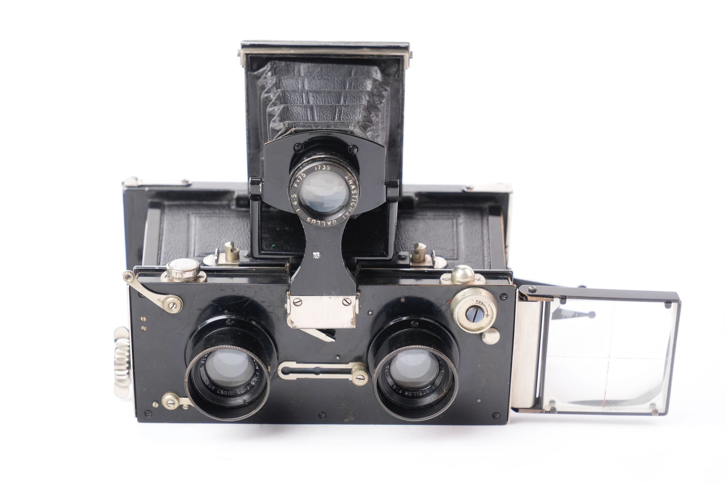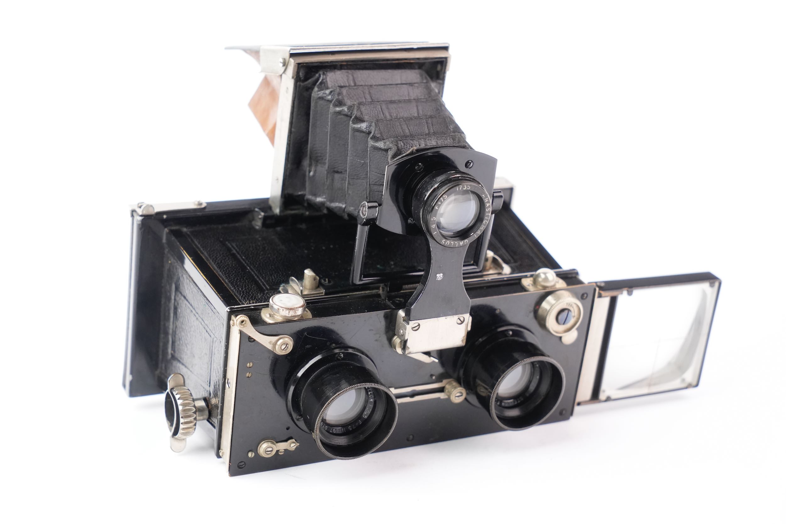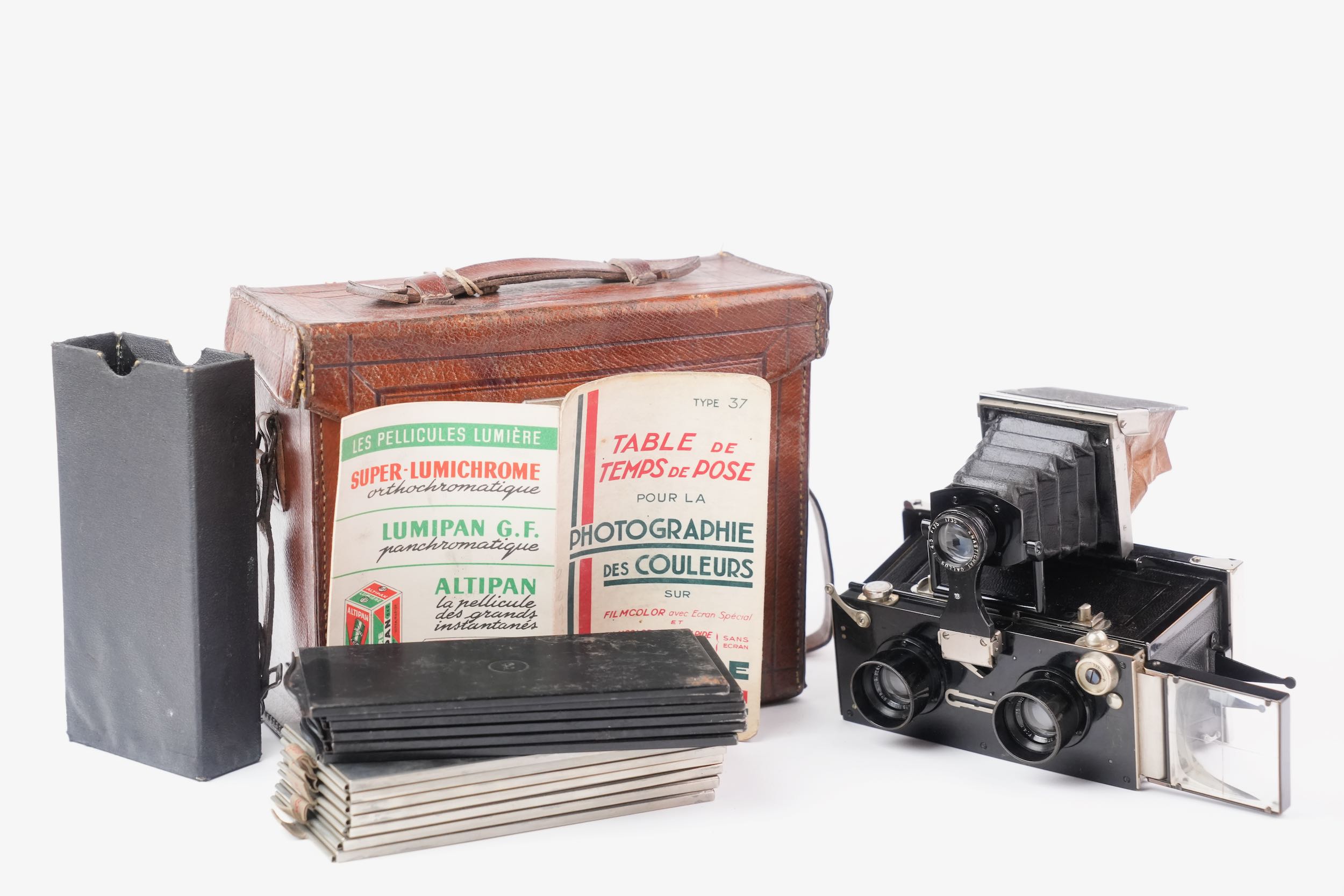 Rare Gallus Jumelle stéréoscopique série 500 avec viseur pliant à chambre noire. Format six-treize. Cet appareil est présenté ainsi dans le catalogue Gallus de 1924 : « Corps d'appareil en aluminium fondu, poli, verni noir et gainé. Intérieur noir extra mat. Mise au point GALLUS par montures à 5 Filets et vis sans fin donnant une précision de 1 /50e de m/m. Décentrement vertical. Niveau. Viseur breveté GALLUS, donnant mise en plaque et mise au point, monté avec ANASTIGMAT GALLUS 1/4,5 – 75 mm. Grand viseur clair sur le côté. Porte-écrans intérieur automatique pour l'Autochromie. Butée de châssis à escamotage pour l’emploi des châssis film pack. Obturateur GALLUS donnant la pose en 1 et 2 temps et les vitesses de 2 secondes à 1 /250e de seconde. Parasoleils télescopiques montés sur les Objectifs. Ecrou pour pied au pas du congrès. Cette Jumelle est livrée dans un étui cuir noir ou havane, avec 1 chargeur et 1 cartouche GALLUS, 1 dépoli nickel, 1 déclencheur et une notice. Elle pèse 1 .000 grammes et mesure 155 x 80 x 95 mm. ». Notre exemplaire est accompagné de son riche étui en cuir havane et d’une douzaine de châssis simples métalliques à volet, ainsi que d’une documentation. Très bel état cosmétique et fonctionnel.