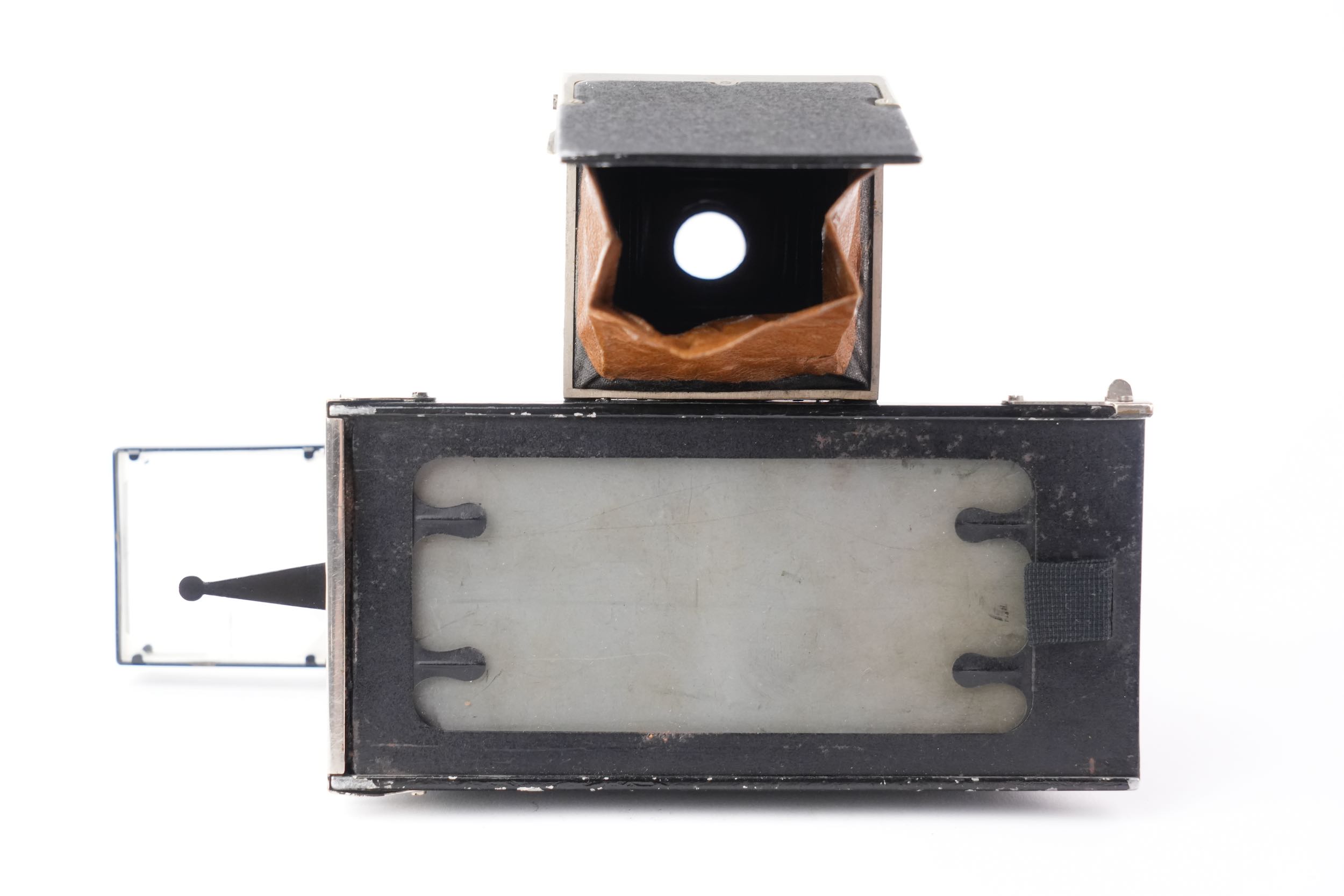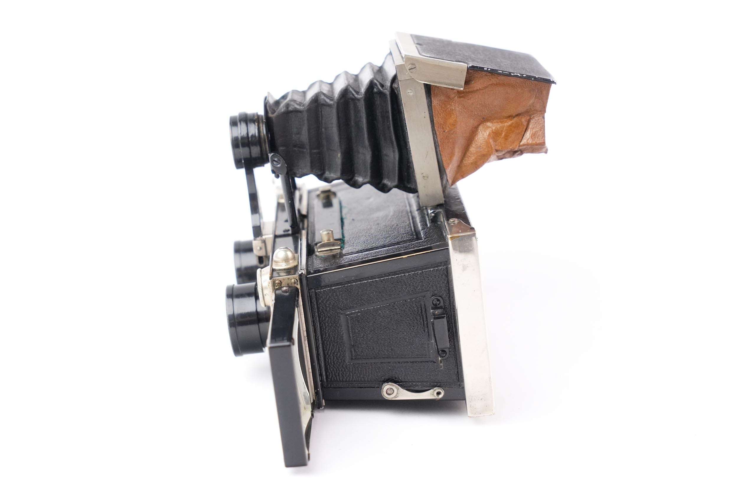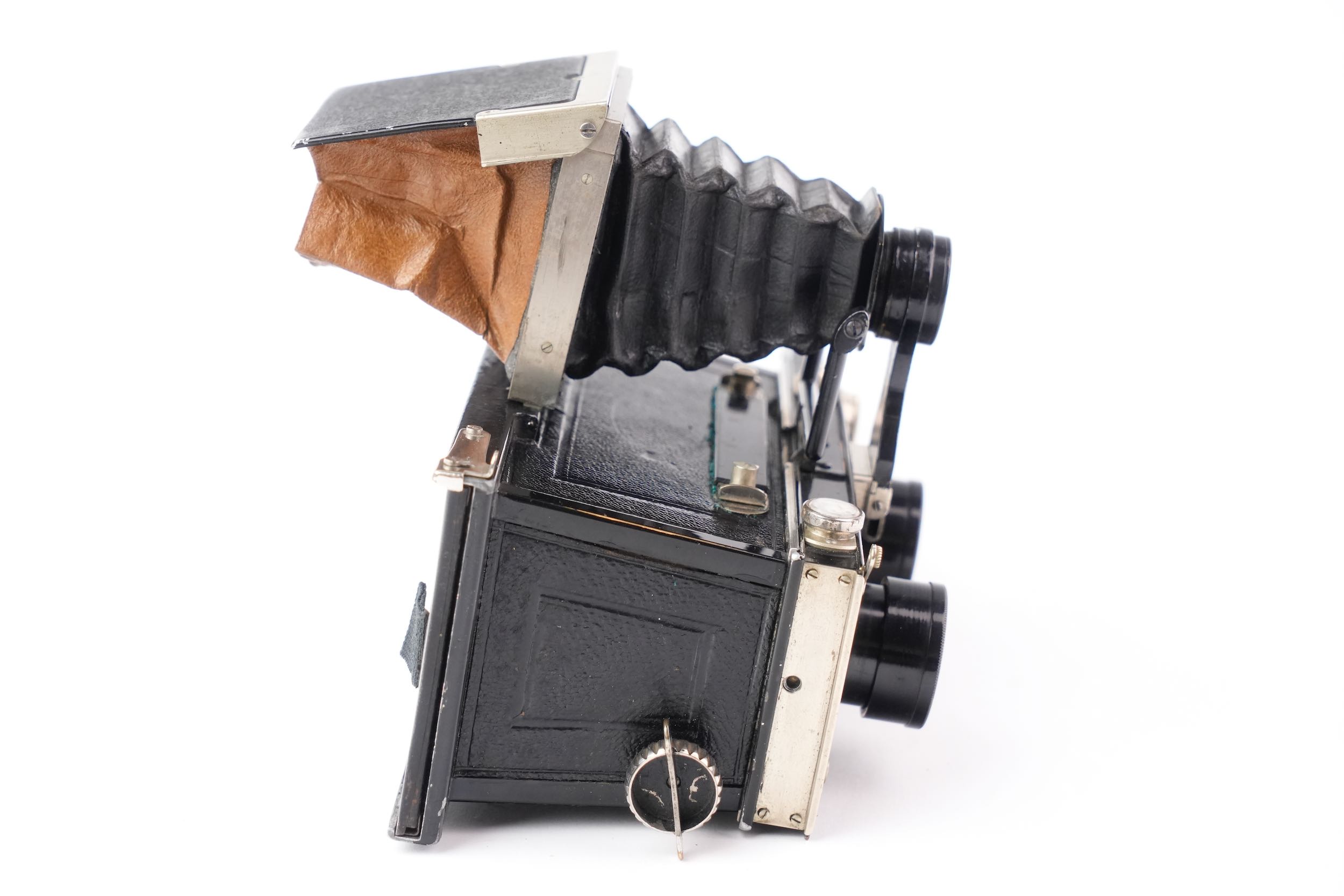 Rare Gallus Jumelle stéréoscopique série 500 avec viseur pliant à chambre noire. Format six-treize. Cet appareil est présenté ainsi dans le catalogue Gallus de 1924 : « Corps d'appareil en aluminium fondu, poli, verni noir et gainé. Intérieur noir extra mat. Mise au point GALLUS par montures à 5 Filets et vis sans fin donnant une précision de 1 /50e de m/m. Décentrement vertical. Niveau. Viseur breveté GALLUS, donnant mise en plaque et mise au point, monté avec ANASTIGMAT GALLUS 1/4,5 – 75 mm. Grand viseur clair sur le côté. Porte-écrans intérieur automatique pour l'Autochromie. Butée de châssis à escamotage pour l’emploi des châssis film pack. Obturateur GALLUS donnant la pose en 1 et 2 temps et les vitesses de 2 secondes à 1 /250e de seconde. Parasoleils télescopiques montés sur les Objectifs. Ecrou pour pied au pas du congrès. Cette Jumelle est livrée dans un étui cuir noir ou havane, avec 1 chargeur et 1 cartouche GALLUS, 1 dépoli nickel, 1 déclencheur et une notice. Elle pèse 1 .000 grammes et mesure 155 x 80 x 95 mm. ». Notre exemplaire est accompagné de son riche étui en cuir havane et d’une douzaine de châssis simples métalliques à volet, ainsi que d’une documentation. Très bel état cosmétique et fonctionnel.
