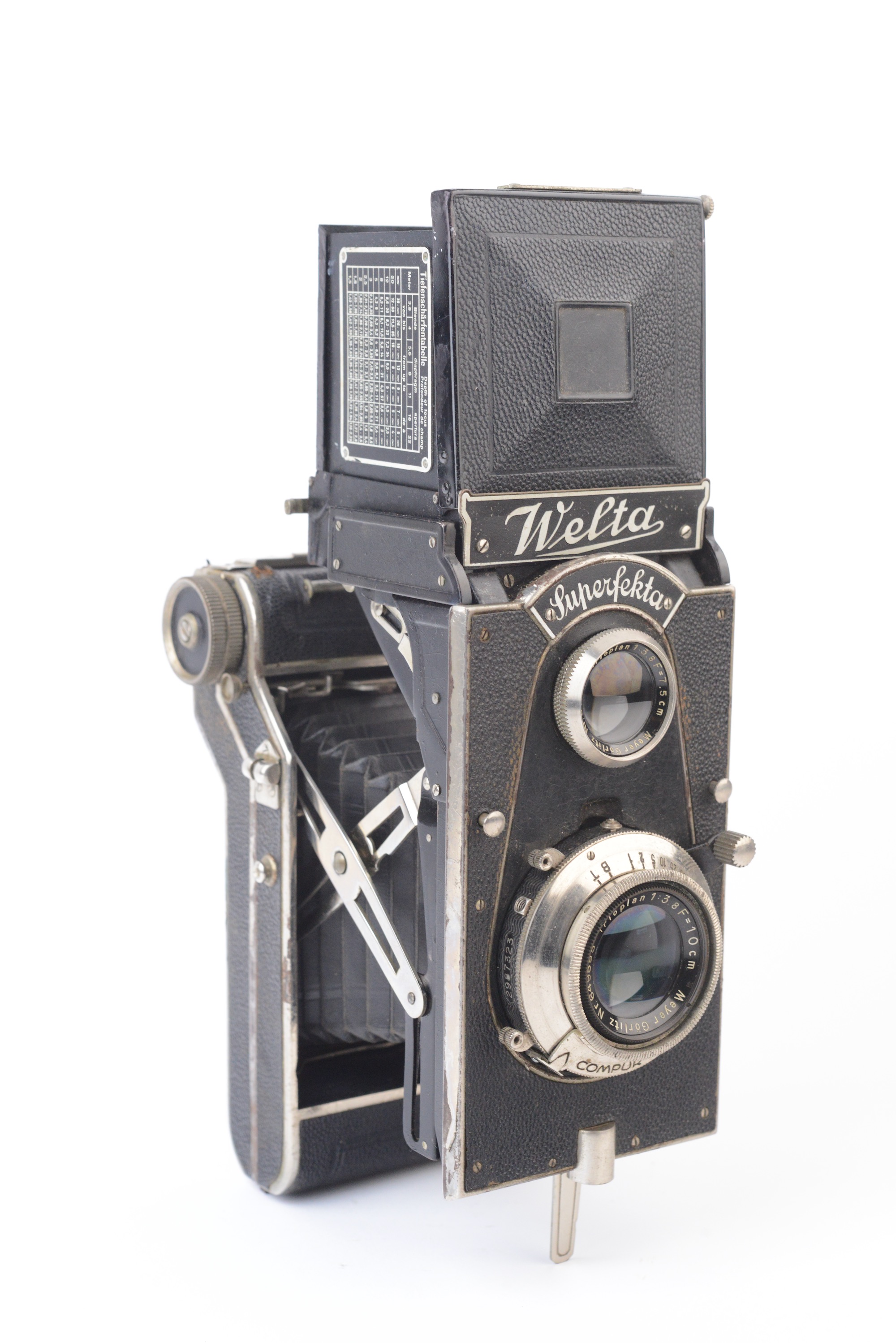 Le Welta Superfekta est fabriqué en 1934 par la Welta Kamerawerk à Freital Allemagne. Il utilise la pellicule 120 pour huit vues 6x9 cm. Rare avec cet objectif Meyer Görlitz à diaphragme iris Trioplan 3,8/10 cm pour la prise de vue et Trioplan 3,8/7,5 cm pour la visée. Obturateur Compur allant de la seconde au 1/250ème. Un intérêt de cet appareil est son mode technique de repli et celui de mise au point ainsi que son dos pivotant. Appareil en bel état général.
