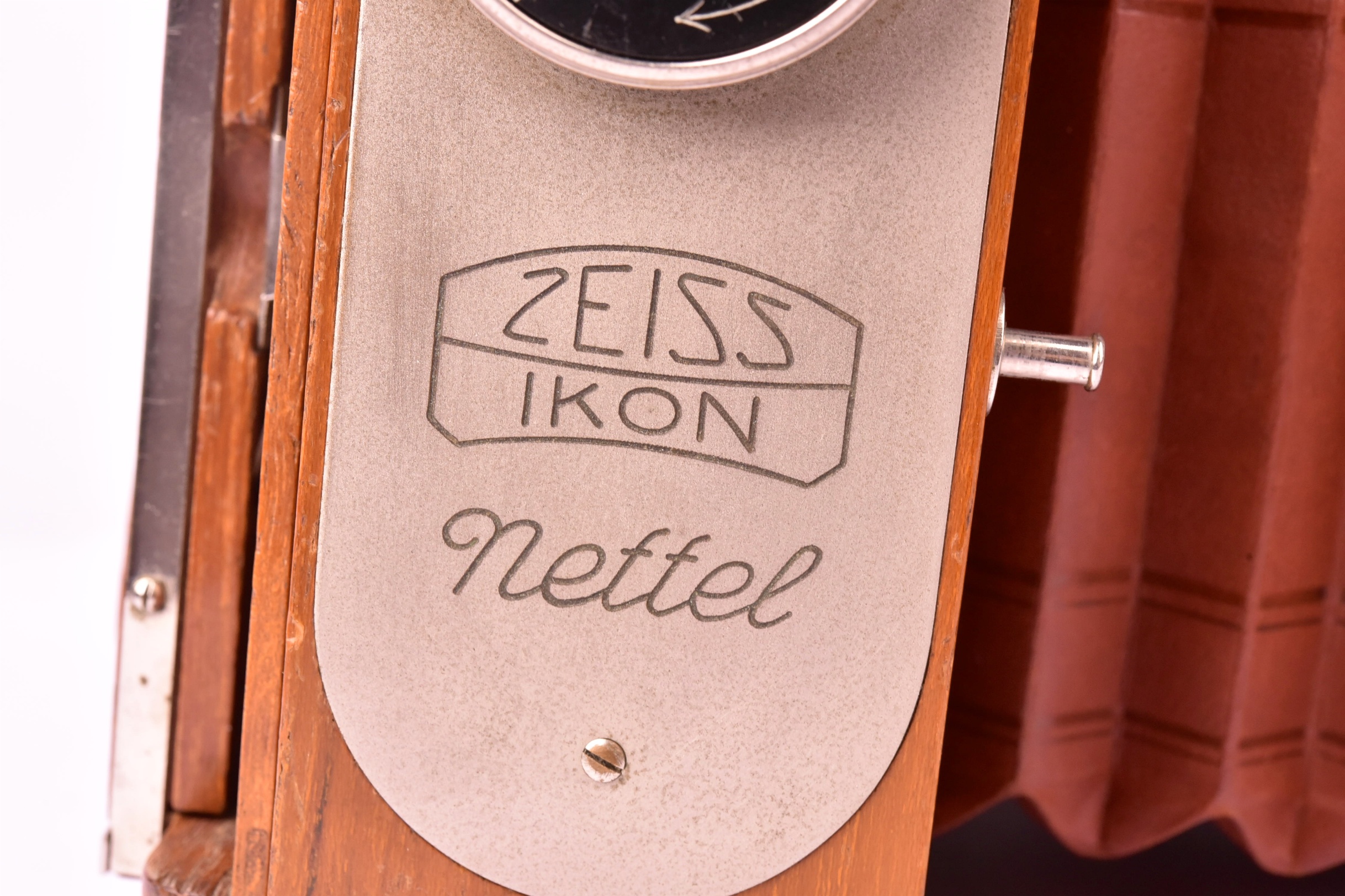 Zeiss-Ikon Nettel Deckrullo tropical. Appareil de reportage utilisant des châssis à plaques au format 9x12 cm. Version tropicale en bois de teck verni, renforcé par des ferrures nickelées. Soufflet en cuir havane. Obturateur focal à rideau (1 – 1/2000 T, B). Objectif Carl Zeiss Iéna 1 : 3,5 F=15 cm, avec bouchon en cuir. Mise au point hélicoïdale. Niveaux. Dépoli avec capuchon en cuir havane. Viseur sportif à cadre. Ensemble de six châssis simples en métal nickelé. Très bel appareil. Obturateur hors service.