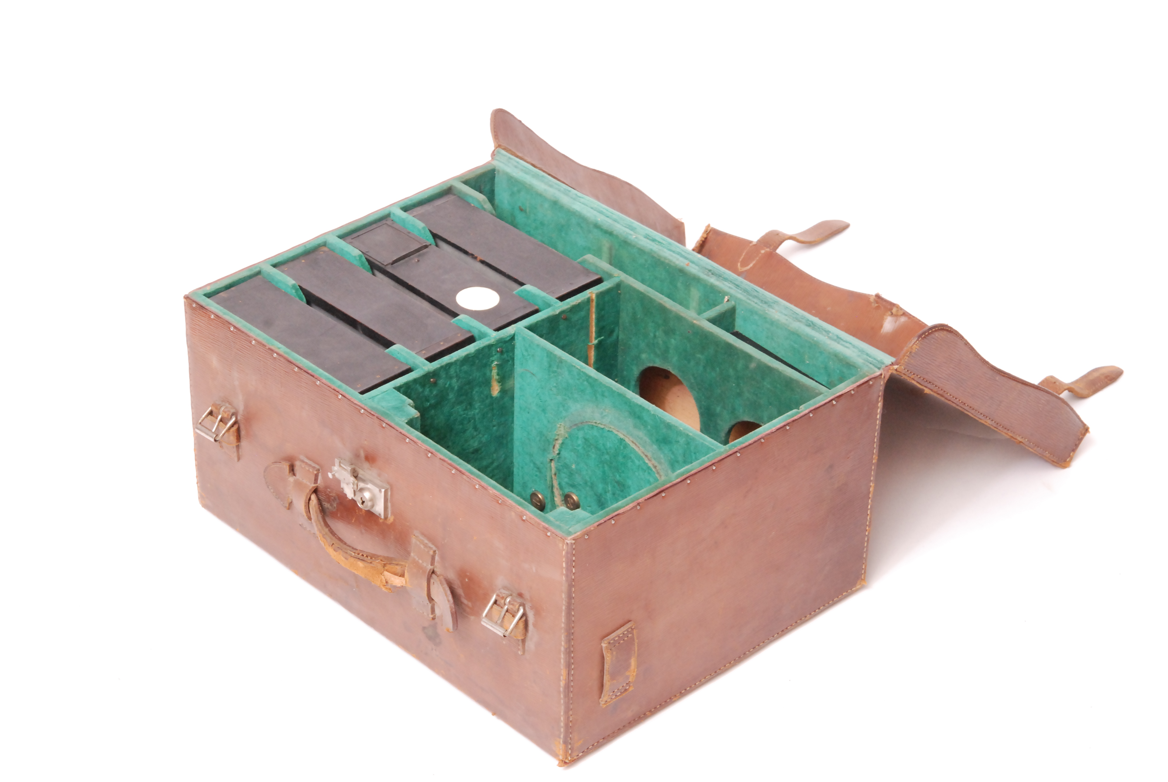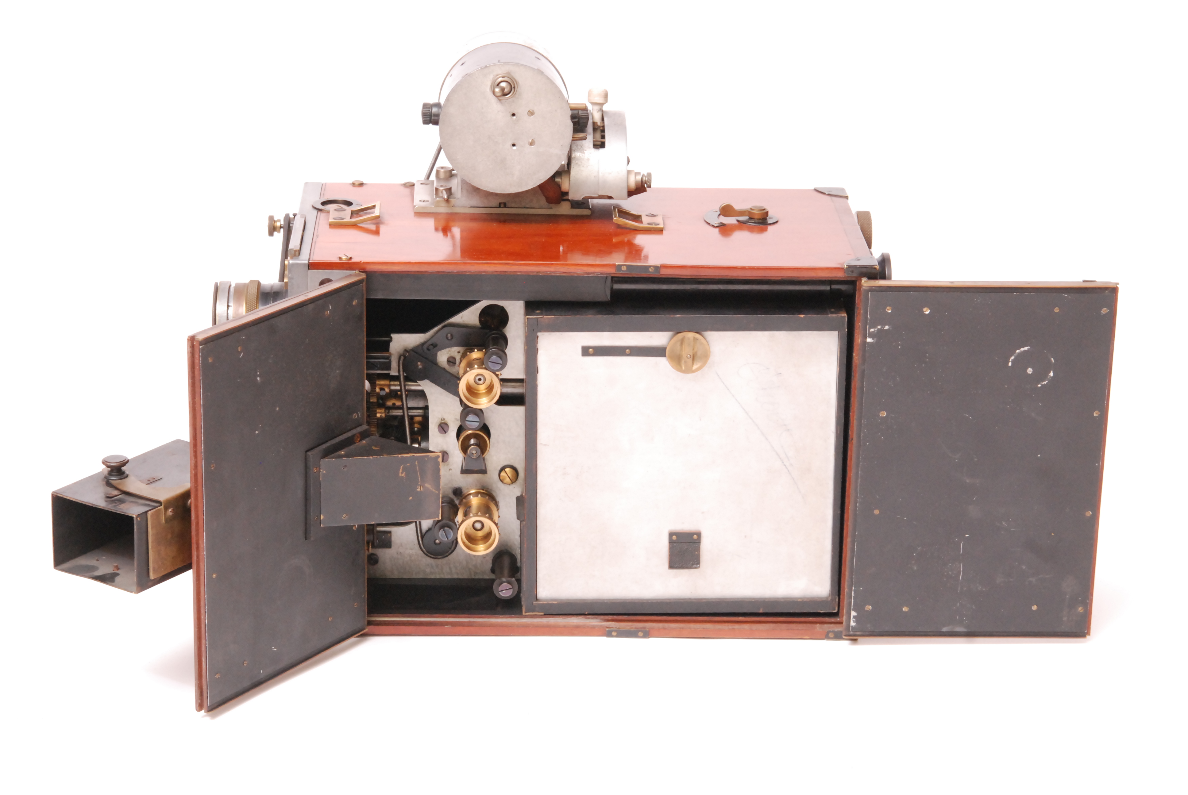 A. GILLON - Très belle et importante Caméra film 35 mm. La Cinémathèque Française apporte les précisions techniques suivantes sur ce type de camera : "Caméra conçue par Auguste Léon GILLON et fabriquée par Cinéma-Tirage L. Maurice, Société. entraînement du film 35 mm par deux griffes ; disque à rampe ; came excentrique ; trois débiteurs dentés ; enroulement du film dans les deux sens pour fondus-enchaînés et surimpressions ; écran contre-obturateur tournant avec l'obturateur ordinaire pour l'obtention des fondus-enchaînés ; ressorts empêchant le frottement de la pellicule ; deux magasins intérieurs pour film de 120 mètres ; planchette à trois objectifs se substituant par glissement ; mise au point directe sur pellicule par prisme réglable ; mise au point sur dépoli ; poinçon de film ; compteur de métrage ; cadran automatique donnant la distance de mise au point de l'un des trois objectifs employés ; boîtier en bois verni ; poignée ; manivelle. Objectifs Tessar Zeiss Krauss-Paris. Dimensions : L=38cm ; l=27cm ; H=27cm. ". Voir plus précisément sur le site les extraits de présentations documentaires d’époque 1921/1922 : http://www.cinematheque.fr/fr/catalogues/appareils/collection/ - Remarque importante : le modèle que nous présentons est doté d'un dispositif complémentaire que l'on ne trouve pas sur les autres modèles connus : celui-ci possède en effet un moteur originel contrôlé par rhéostat demi-circulaire, l'ensemble monté sur le dessus du boitier et relié par courroie et poulie à l'axe d'entrainement de la manivelle. L'ensemble est en très bel état cométique et fonctionnel.