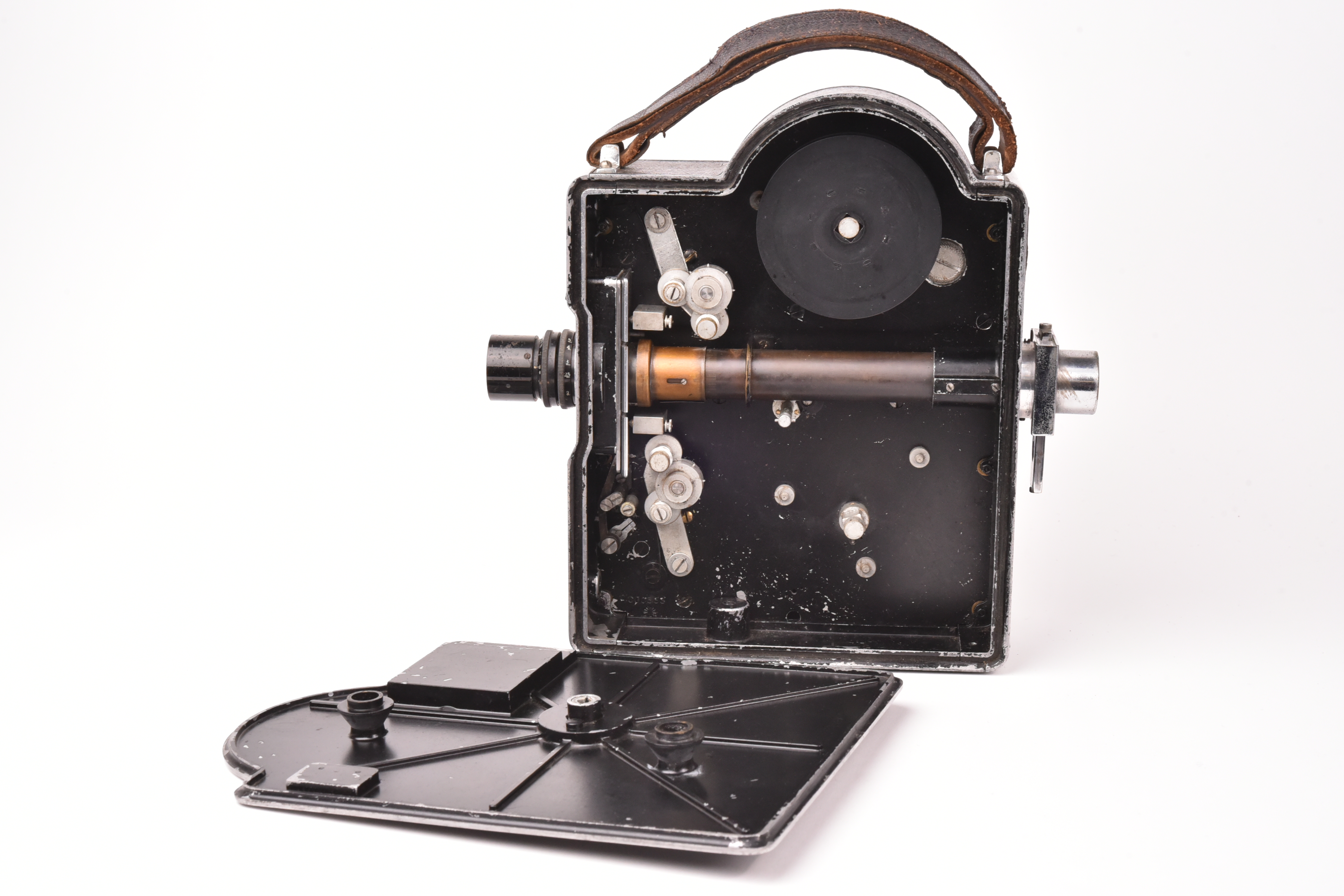 Cet appareil de prise de vue est une version modifiée de la Grand Amateur 16mm. Chose rare, le présent exemplaire permet d'accommoder du film 9,5mm. Deux débiteurs dentés ; emplacement intérieur pour deux magasins 30 mètres débiteur et récepteur ; moteur à ressort ; viseur reflex avec filtre ; viseur clair et pointeur ; variateur de vitesse 8/16/20/24/62/64 images-seconde ; poignée en cuir ; manivelle sur mesure (pas d'origine). 1933. Rare dans format de film.